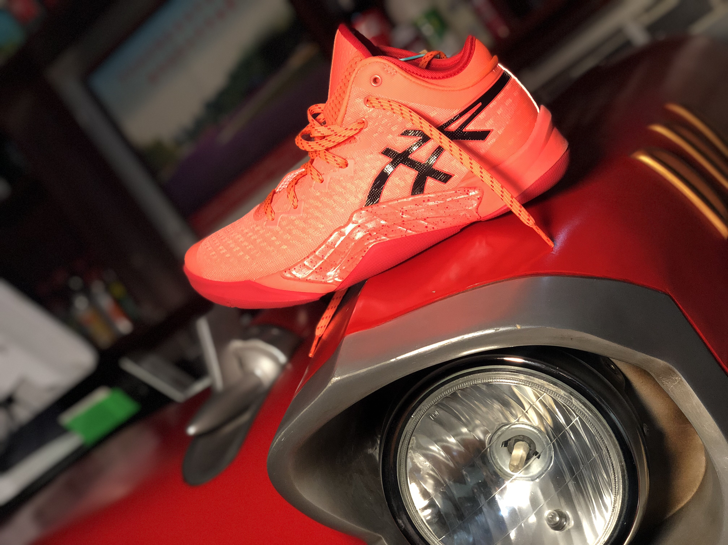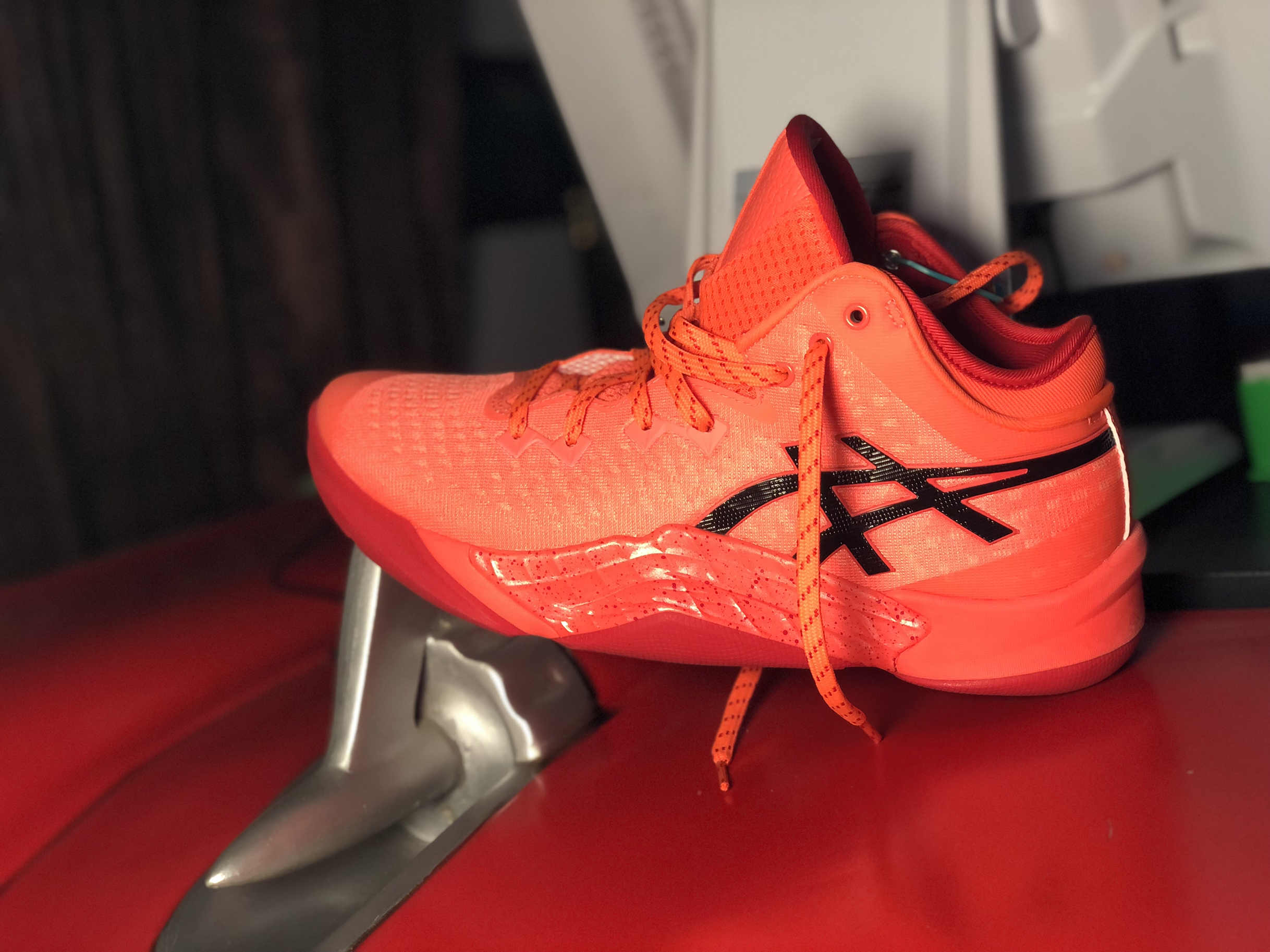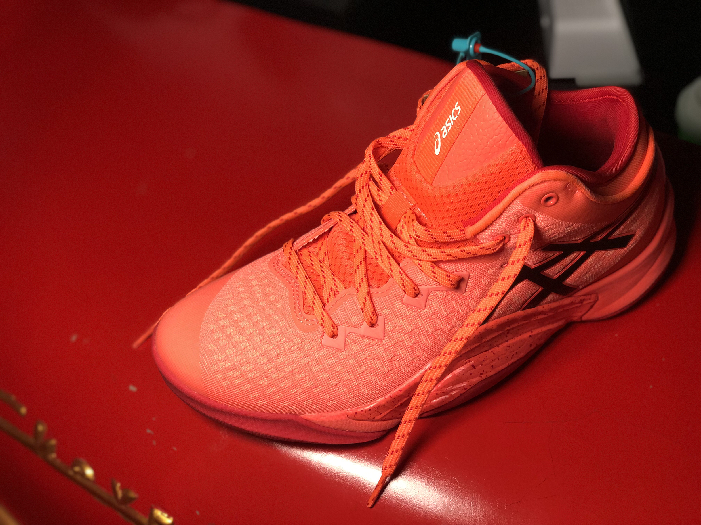 这个配色国内应该还没几双!亚瑟士的一贯优点上脚基本不用磨合,大胆的防侧翻角是这双鞋的亮点,看起来很突兀但用起来很棒!看起来很笨重的鞋子40.5码单只只有377克,前掌场地感很好,后掌缓震要优于V13,抓地力优秀,滚动感很好!👟球鞋名称: 🔍设计亮点:大胆的防侧翻角实用性很强! ⛹️实战感受(缓震/包裹/抓地力):缓震适中,包裹很好,抓地力很棒. 📃总结评价: