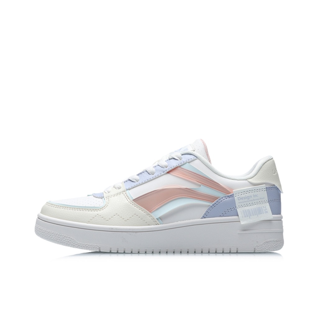 鞋名:LiNing李宁经典低帮休闲板鞋女款白粉紫 接下来彦祖来讲解一下这款鞋 🏂这款鞋子的鞋面采用白色为主要颜色,粉色浅蓝色整体外观简洁好看。 🏂鞋面合成革的材质组成,鞋子的质感不错。整体鞋子也很舒适轻盈。侧面双标LOGO更加时尚。 🏂中底李宁云科技的科技,橡胶大底耐磨防滑。很不错的休闲鞋。