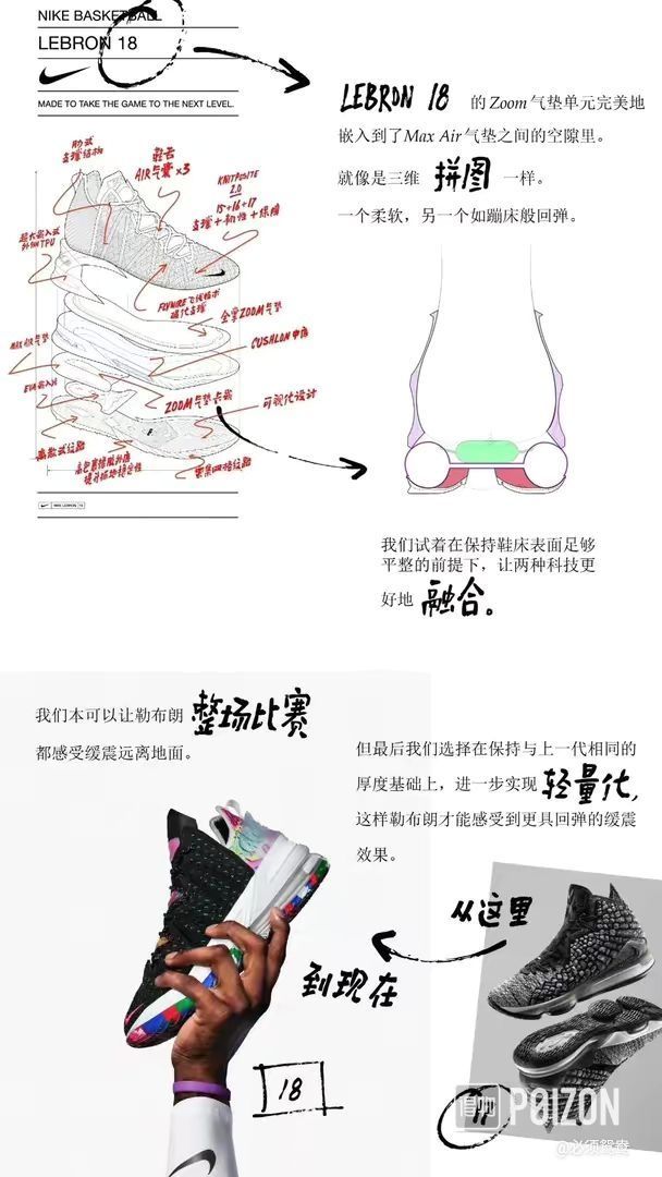 LeBron18鞋面融合了15的Battleknit、16的高韧度纱线、17编制外骨骼的TPU纱线,形成了一个全新的编织结构,轻质又强韧。缓震则是全掌的Zoom Air气垫加上后掌的Max Air,脚感爆棚。 鞋面: Knitposite 2.0鞋面, 搭配侧面加粗织带和 FWWIRE科技 , 在不降低鞋身柔韧性的同时 , 最大程 度提升支撑稳定性 中底: 全长ZOOM AIR气垫与后掌闸...