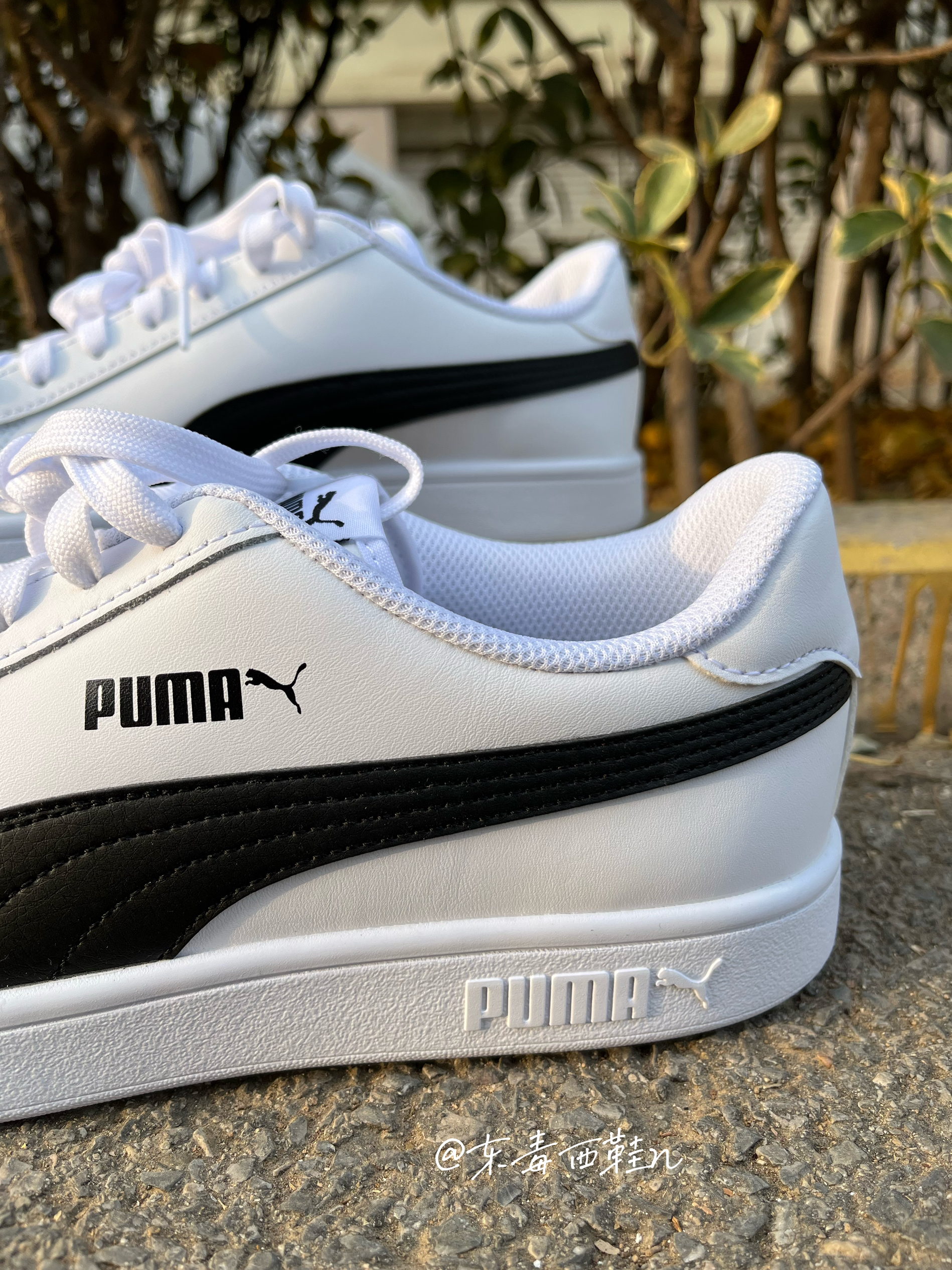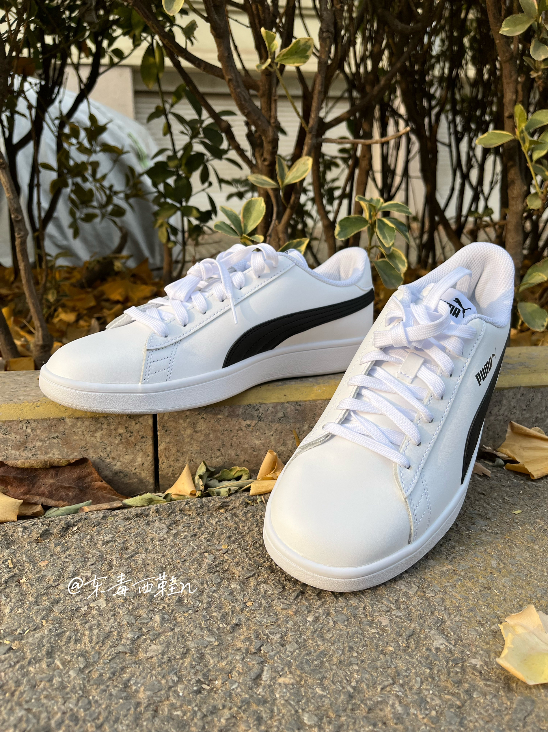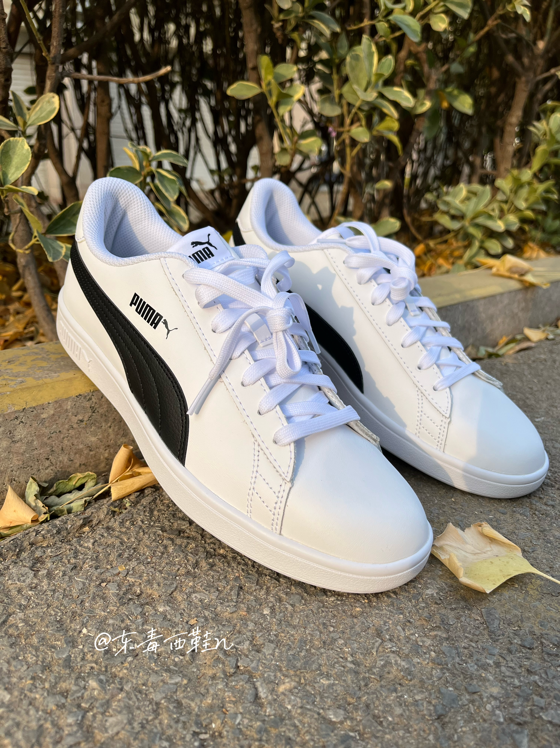 东毒西鞋今日分享 👟鞋面:Puma Smash V2 L 黑白男女同款 🌤 这双鞋怎么样?鞋面采用白色为主颜色,黑色点缀。侧面大Logo非常醒目。 🌤 鞋面采用皮革材质,更容易打理。整体显得简约清爽。 🌤 鞋底采用白色的橡胶大底,很是耐磨防滑。这双鞋不要太容易搭配衣服。
