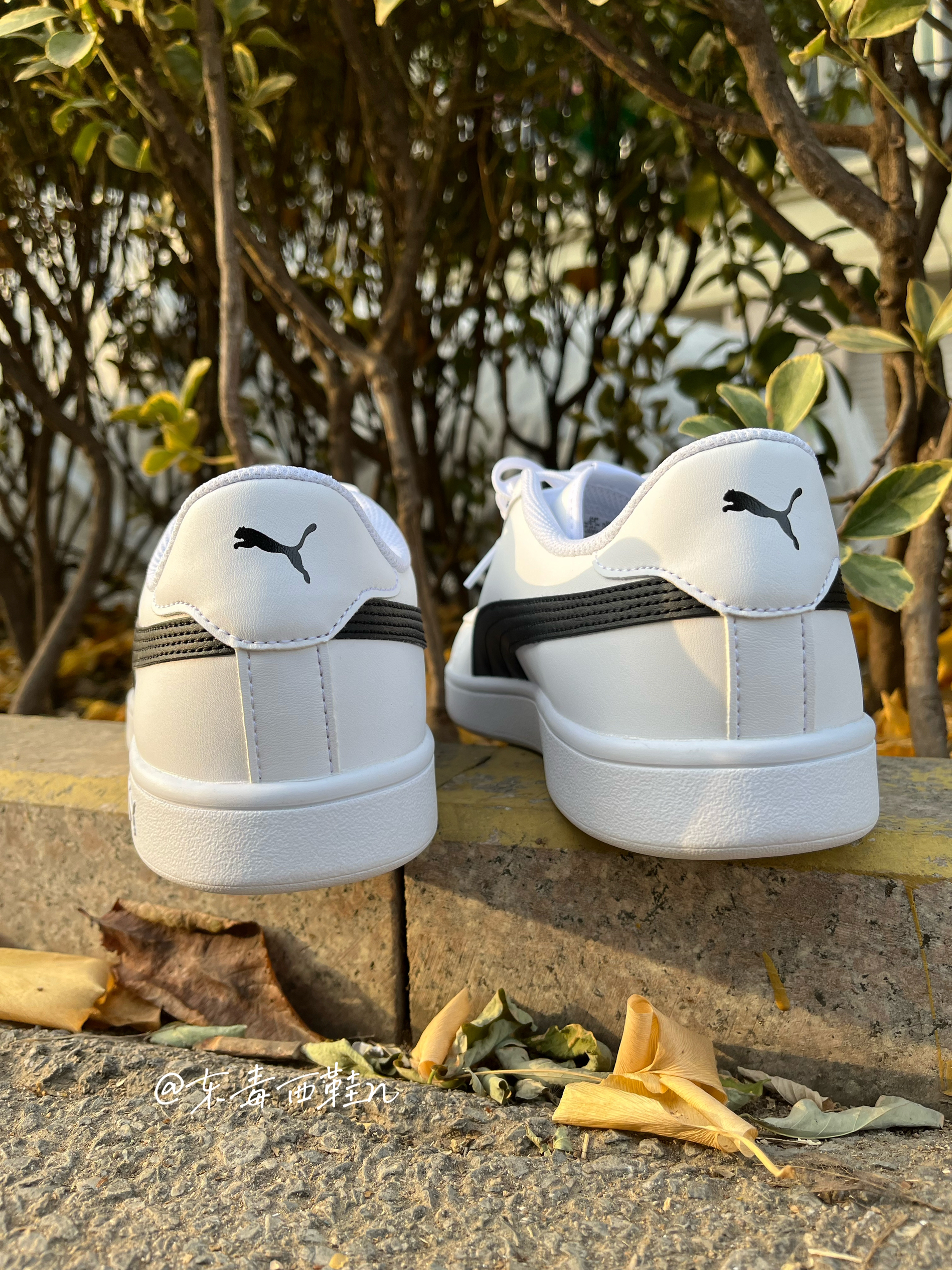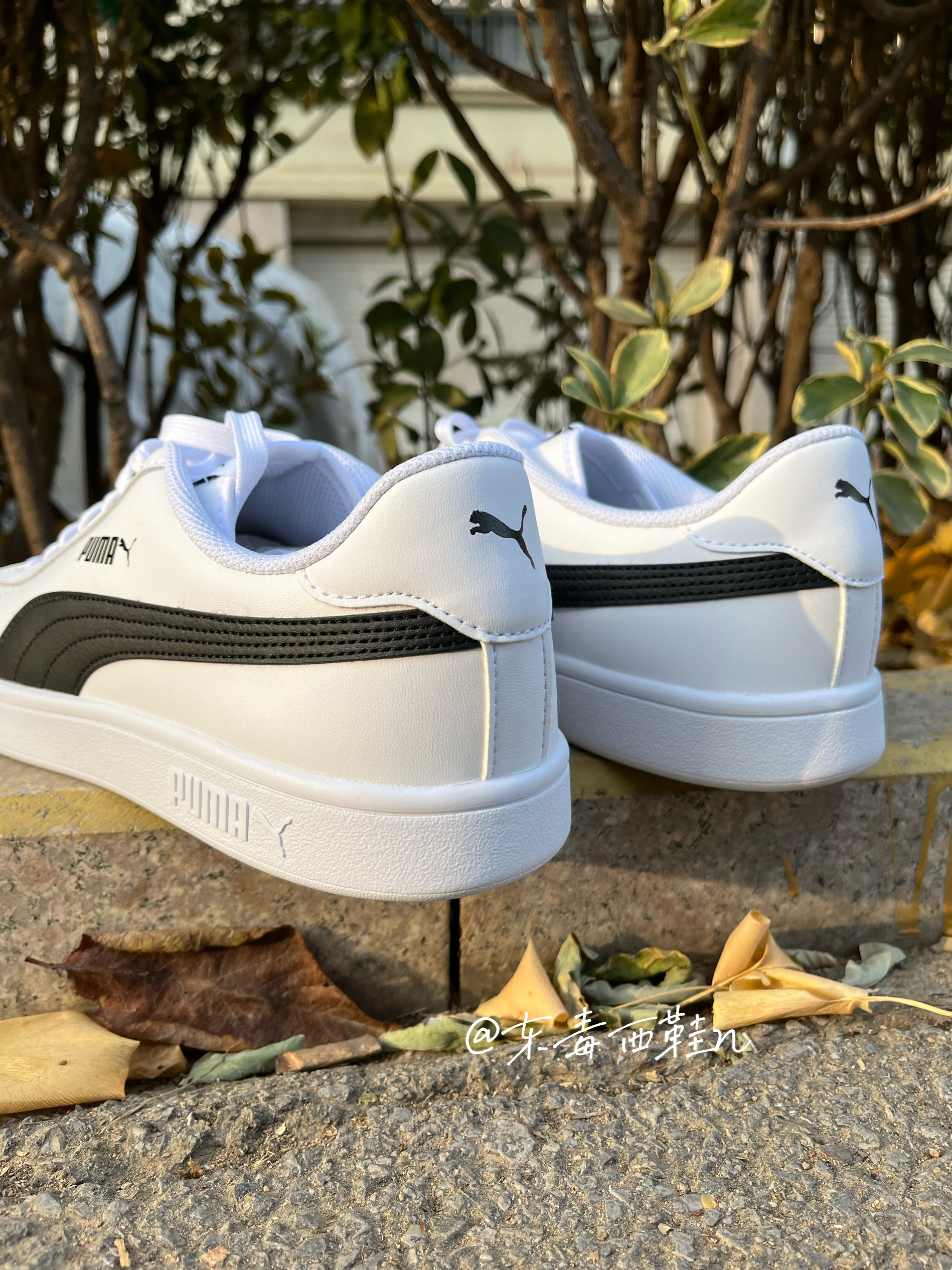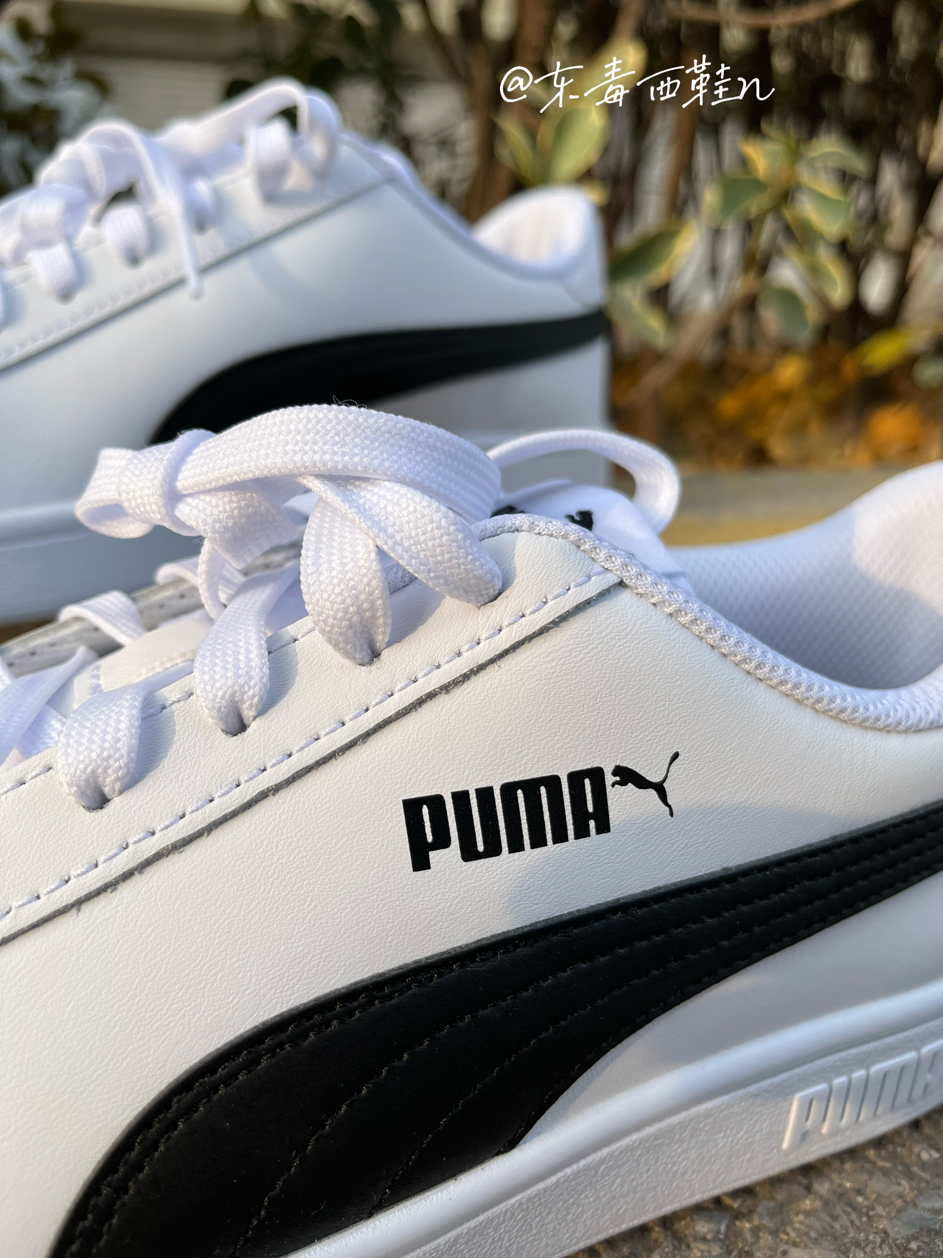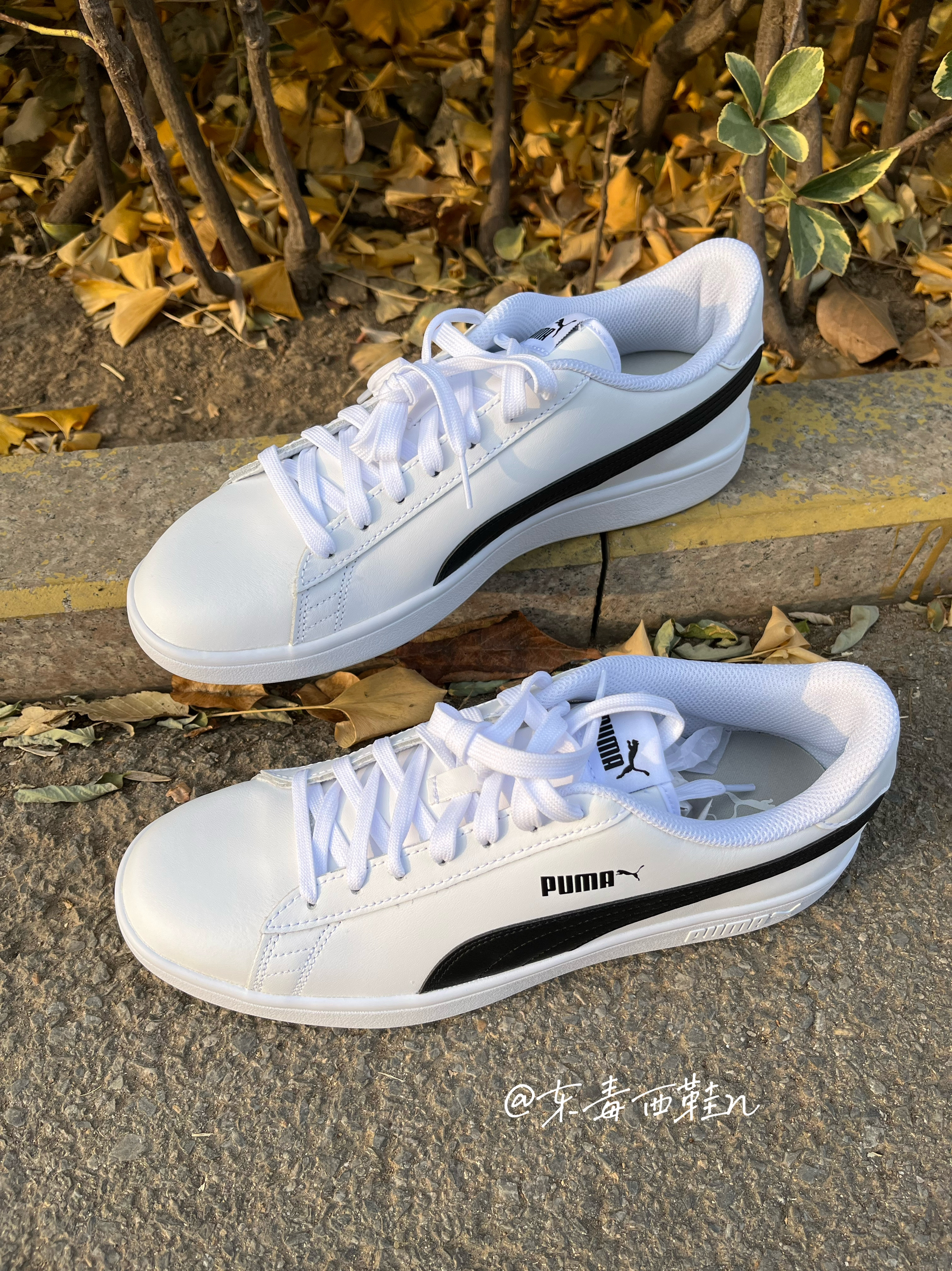 东毒西鞋今日分享 👟鞋面:Puma Smash V2 L 黑白男女同款 🌤 这双鞋怎么样?鞋面采用白色为主颜色,黑色点缀。侧面大Logo非常醒目。 🌤 鞋面采用皮革材质,更容易打理。整体显得简约清爽。 🌤 鞋底采用白色的橡胶大底,很是耐磨防滑。这双鞋不要太容易搭配衣服。