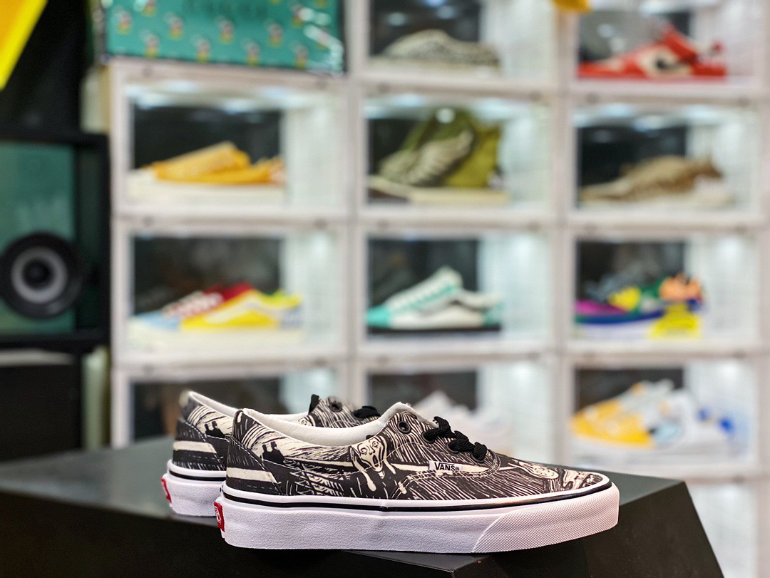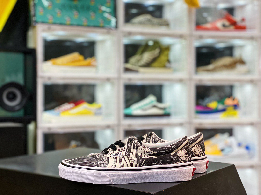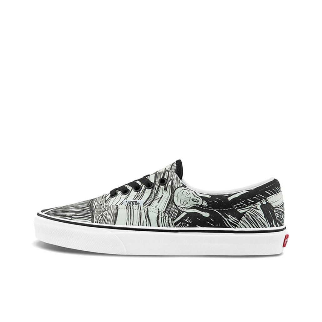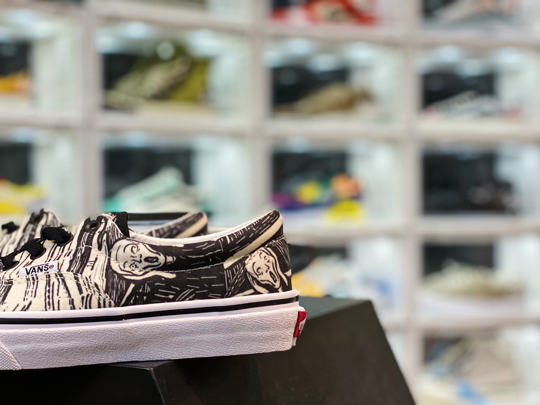 Vans Era x Moma 联名款 爱德华蒙克联名(呐喊) 此次联名鞋款以爱德华蒙克的标志性作品《呐喊》作为原型创作 简直艺术品!本季它更是世界上最具标志性的艺术品之一,SoCa标签与现代艺术博物馆(MMA)合作,在鞋帮上添加了黑白版本的爱德华蒙克( (Edvard Munch)的“呐喊”。但是它仍是让你上脚的滑板好鞋,显示了街头与现代艺术两个世界的融合。两只脚是不同的印花很抢眼 艺术气息浓厚