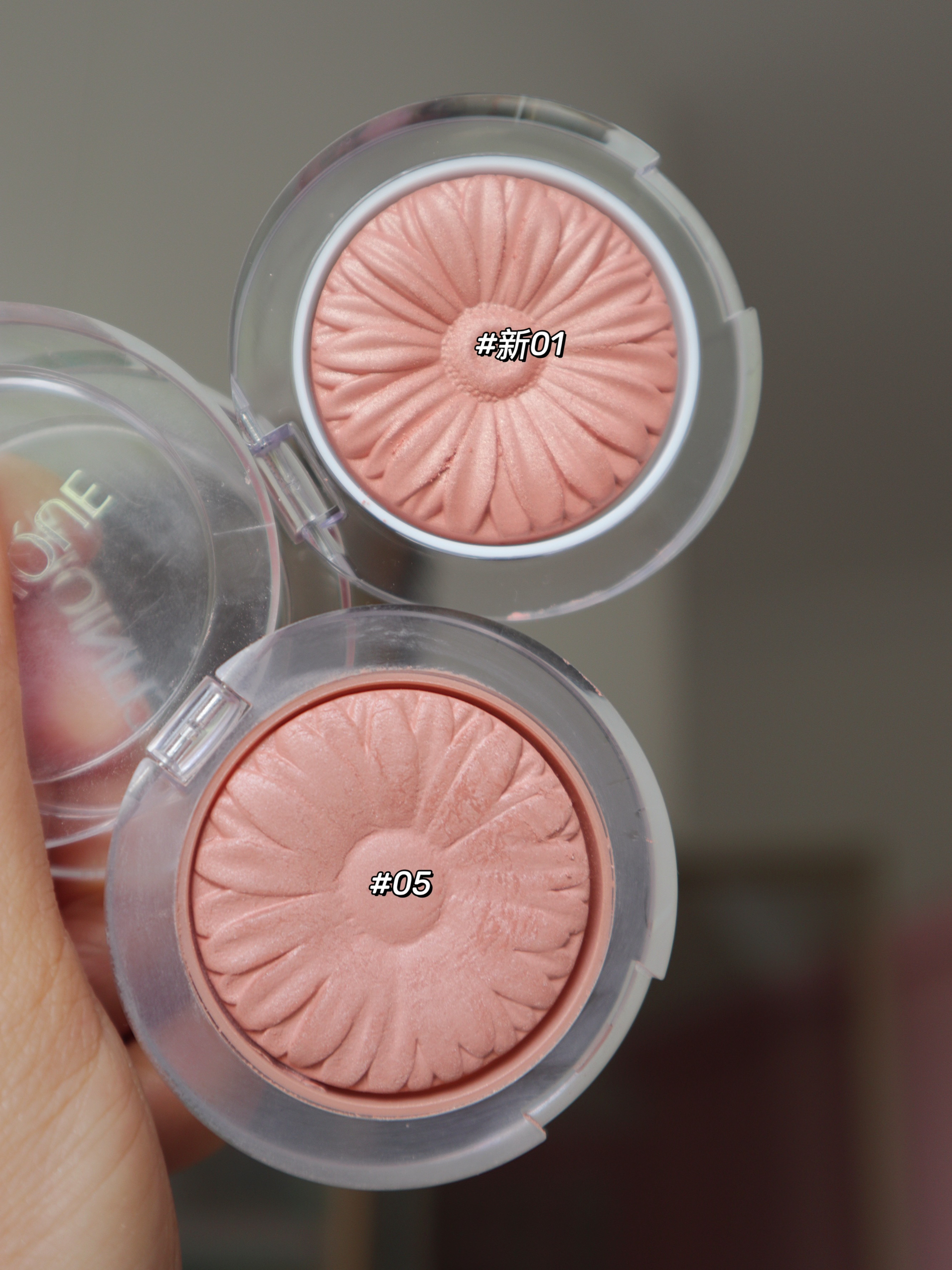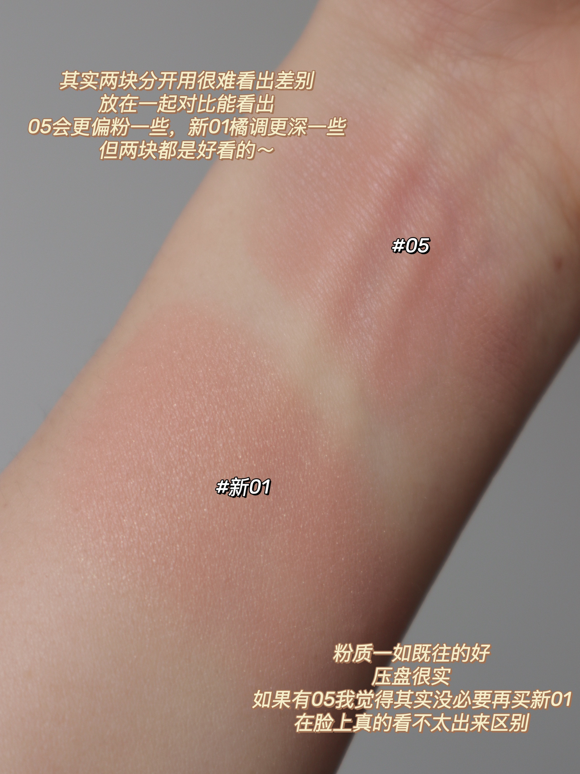 新出的幻彩01 Opal pop和05 Nude pop 都是典型裸色系 粉质还是一如既往的好,3.5g包装,粉压的很实,有丝滑感~ 原本05是有光泽感的,感觉幻彩01的光泽感会比05更强一些。 色彩方面: 同样是裸色腮红两块放一起对比能看出05明显偏粉调,幻彩01橘调更明显。 所以从颜色来说新幻彩01应对黄皮会更有好~ 但是,但是~ 我手上试色真的是很大力的抹了好几层的颜色, 平时...