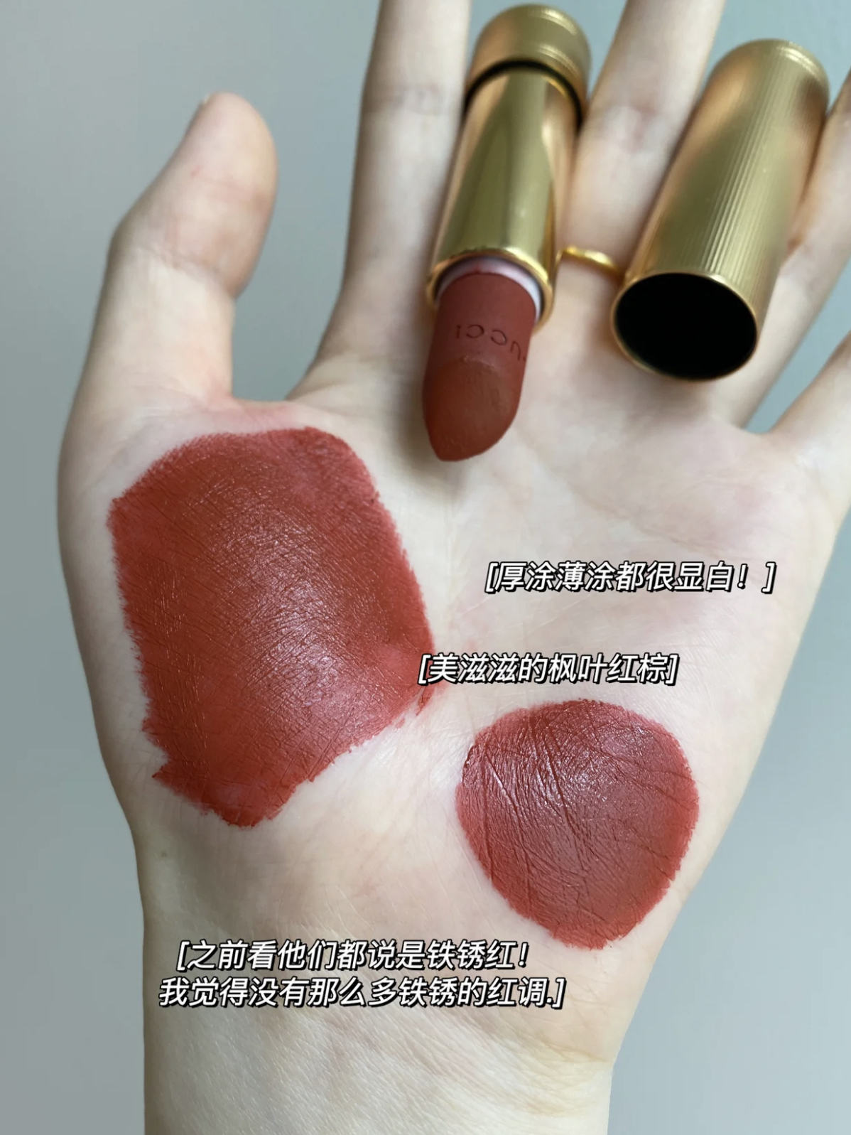 'GUCCI新品哑光505 Janet rust 拧出膏体的一瞬间就忍不住要尖叫了❤️ 这雾面感绝了!就是那种毛茸茸的感觉❤️ 对比之前的金管质地好像多了丝绒感 上嘴惊艳超级顺滑不干❤️ 我这种唇纹星人也完全👌 壳子因为是滋润版本所以壳子上面的花纹会不一样,花纹很有宫廷的感觉很精致!❤️ ,质地真的超级顺滑!Gucci家的唇膏都做的很滋润很顺滑!有一种慕斯蛋糕的一触即化的感觉!香味也...