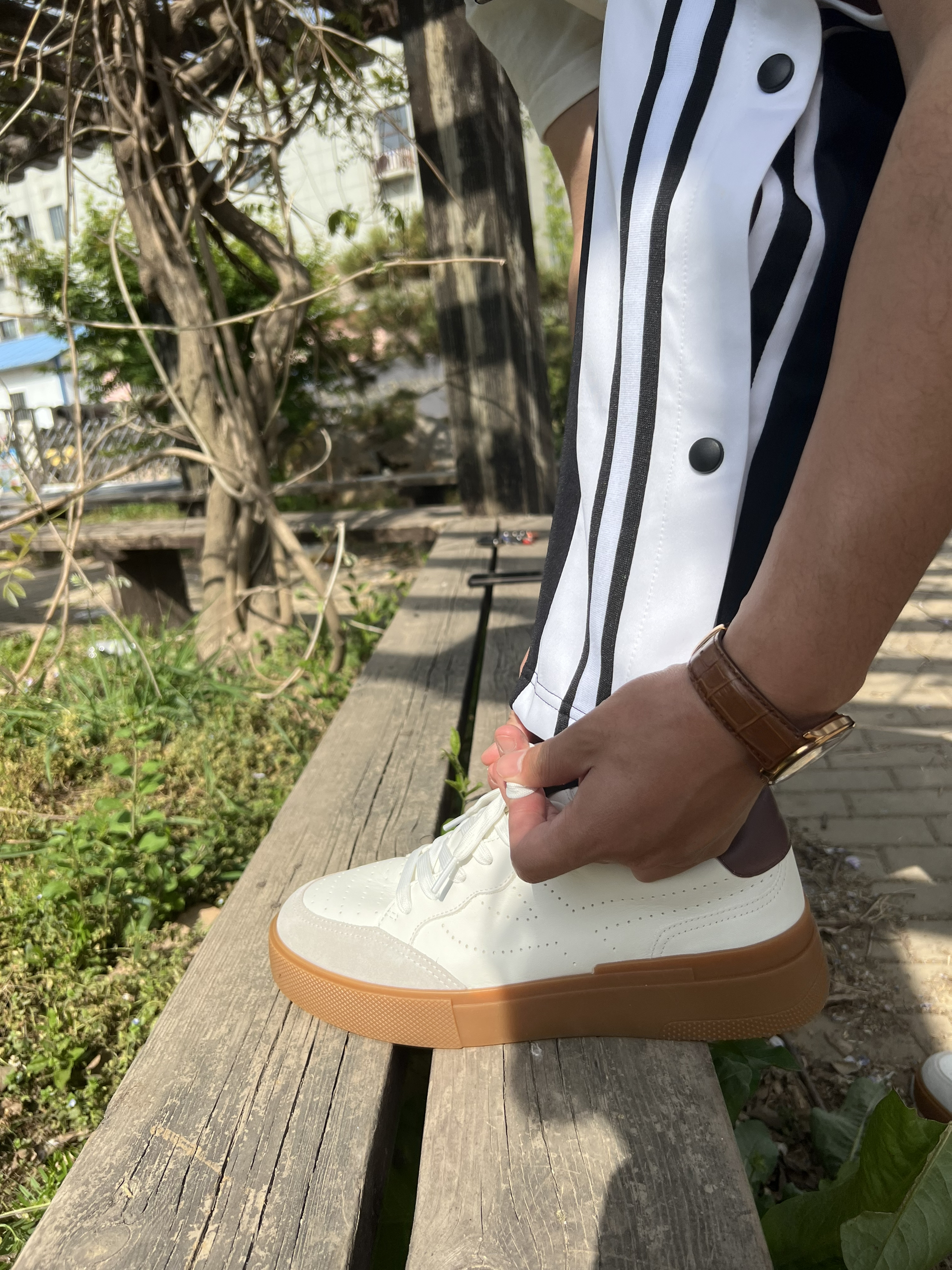 👟:ASH撞色牛皮板鞋白咖色 鞋子外观配色采用白色为主色调,灰色以及咖色对鞋子细节处进行点缀,配色整体来说搭配的很清新,给人不俗的视觉感受。 鞋面有着透气穿孔设计,透气性还不错,现在季节穿是不错的选择,鞋子采用优质皮革材质,搭配绒面革进行打造,质感丰富细腻,触感非常不错。鞋子大底采用橡胶耐磨大底,非常耐穿。 鞋子很百搭,无论搭配什么类型的衣服都可以轻松驾驭,有一说一,我见好多名人大咖都在穿这双鞋...