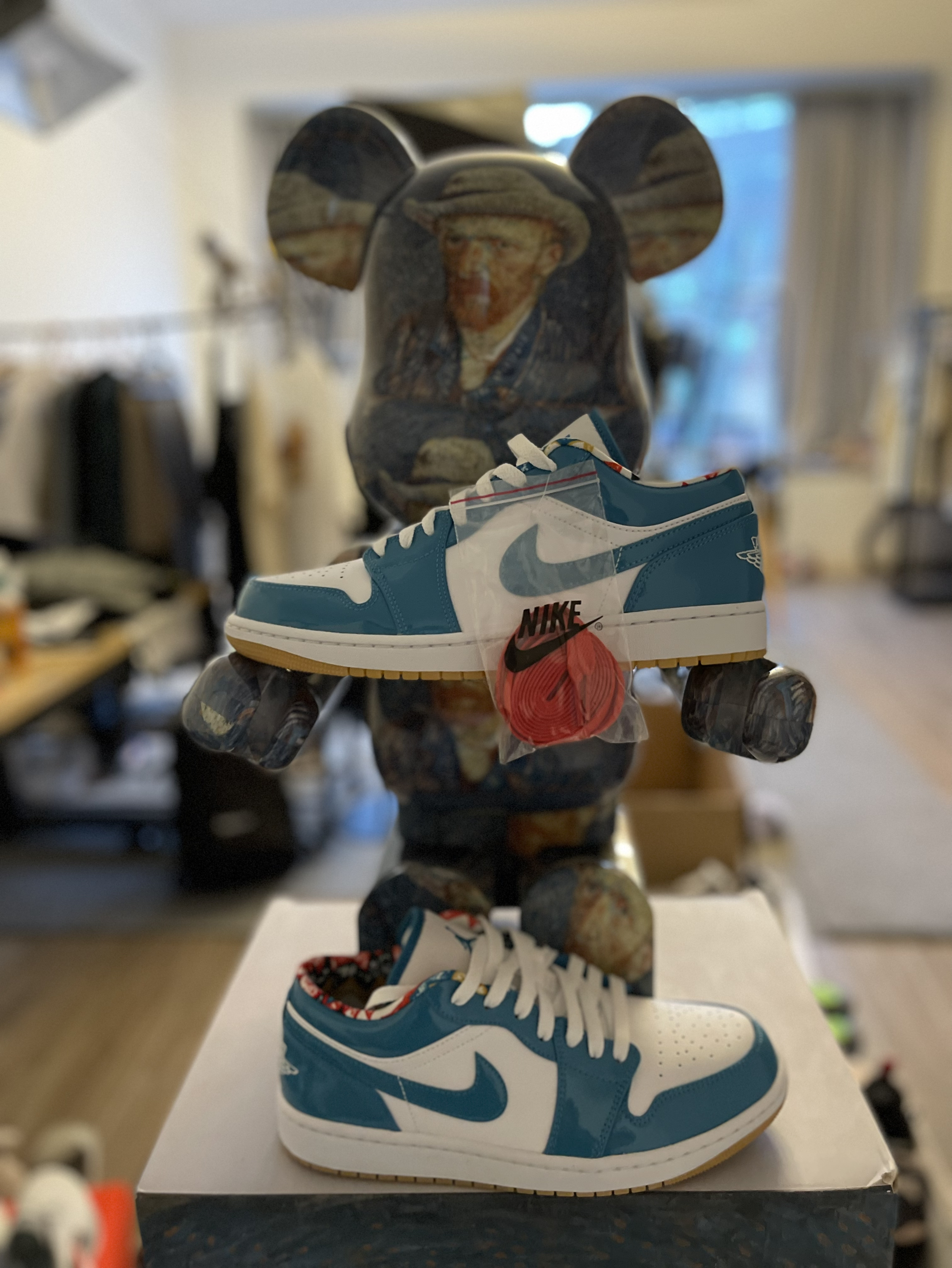 整双鞋采用漆皮十牛皮革材质,白色部分采用了牛皮革,不容易产生折痕,也比全漆皮的脚感好很多 北卡蓝配色不用说了,百搭的配色!很满意的鞋子!价格算是北卡蓝配色里面比较便宜的!喜欢的赶紧下手吧! 👕上衣:PDCT印花短袖T恤 🩳下装:PDCT卡其工装短裤 👟鞋子:AJ1 low 北卡蓝