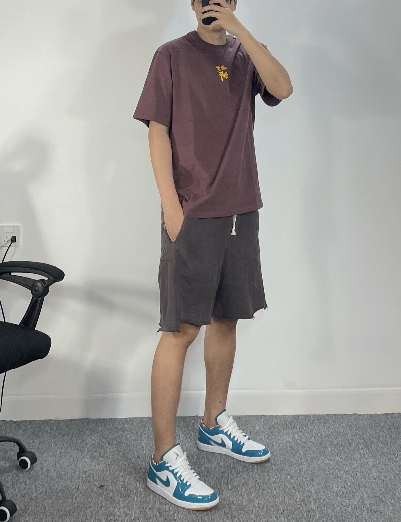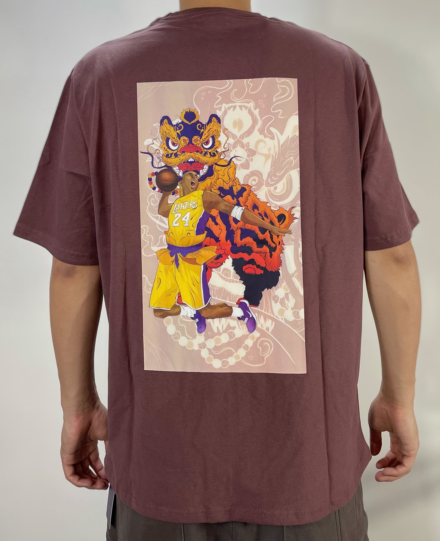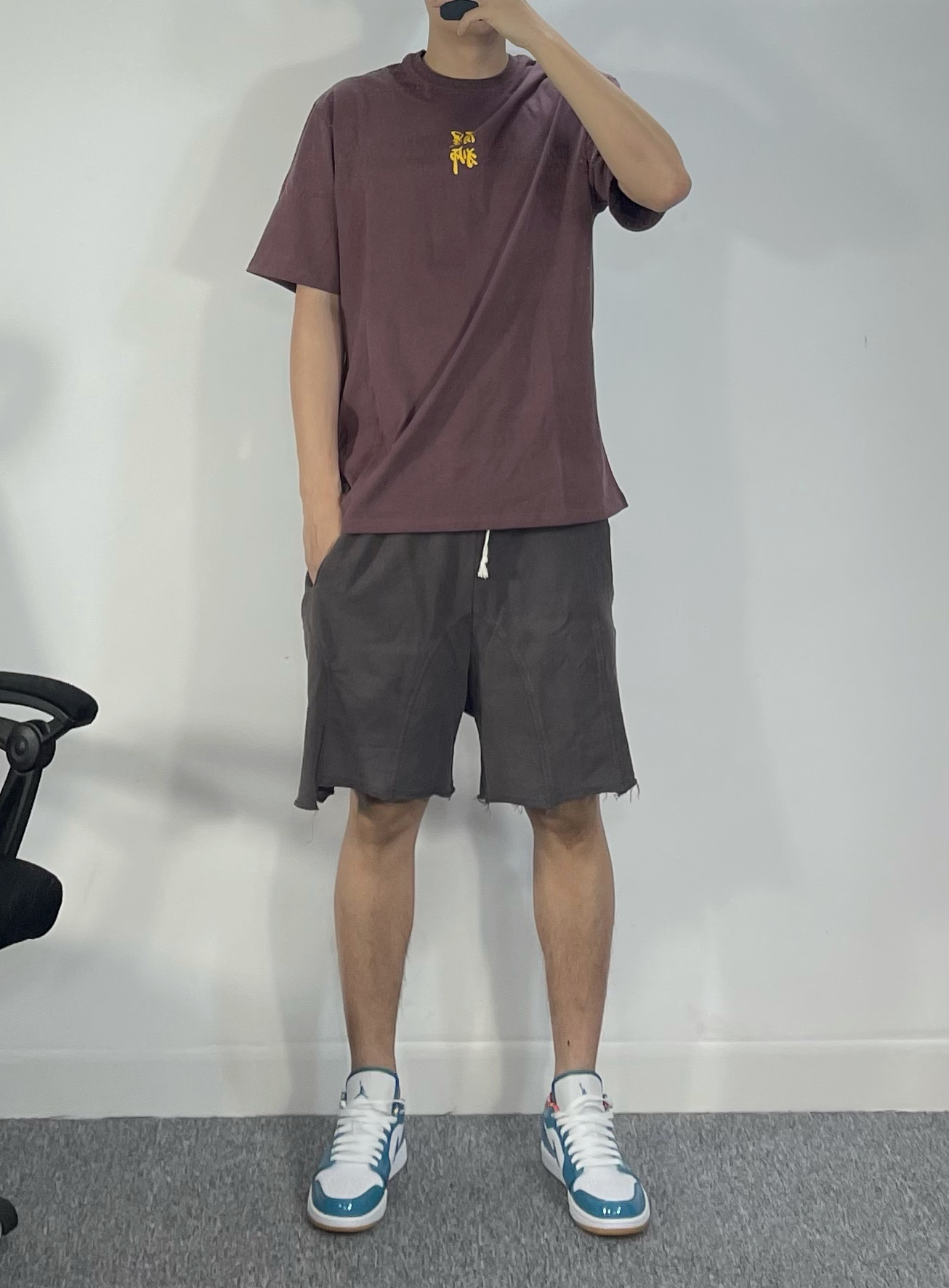 上身必须来件中国文化元素满满的T恤 醒狮系列的nba球星 面料真的很舒服 棉感很柔和又是高克重 裤子是pdct的卫裤 不规则剪裁很有那味 潮到不行 鞋子来个北卡aj1 白搭的配色了 个人觉得低帮必须陪短裤