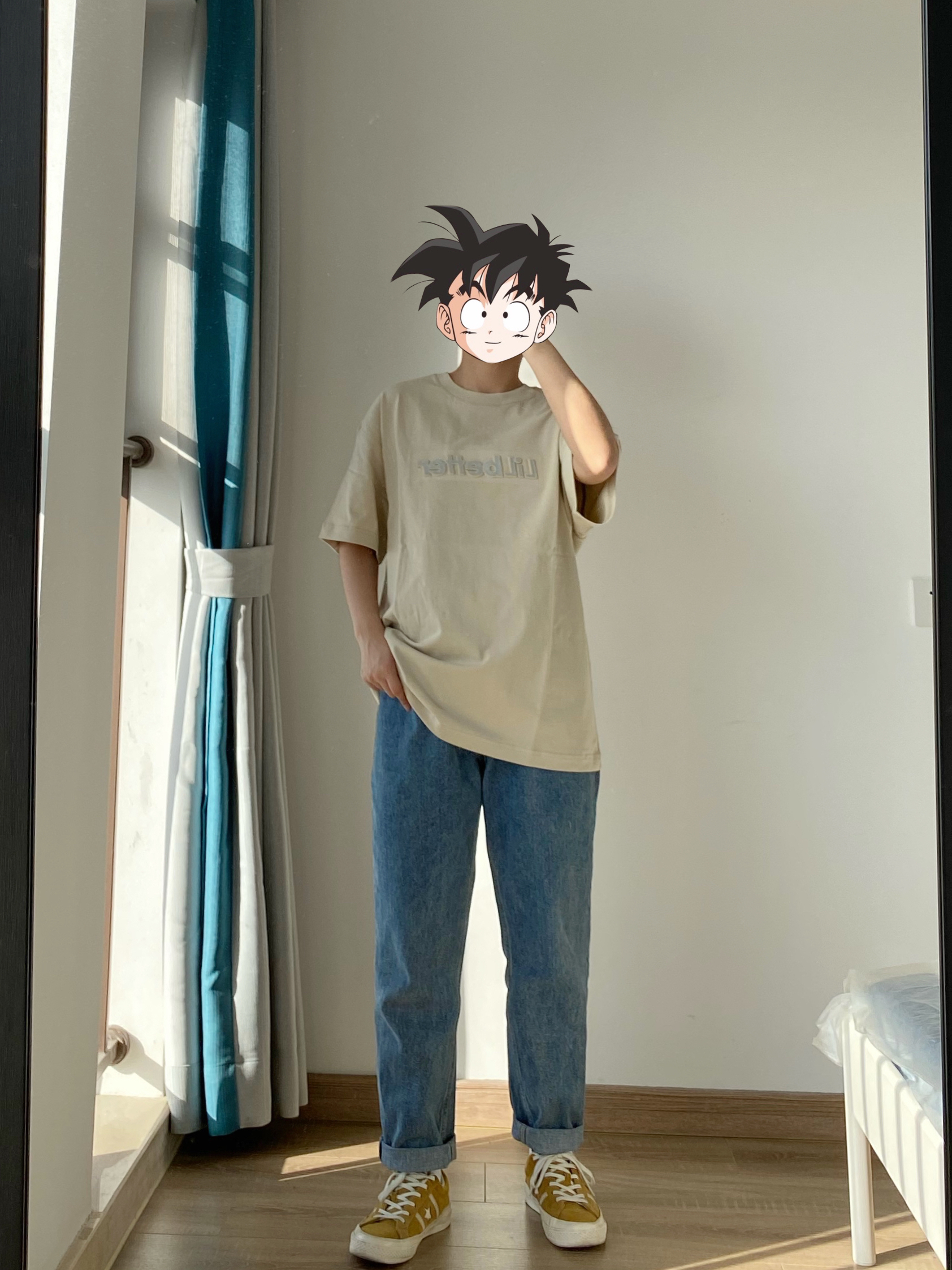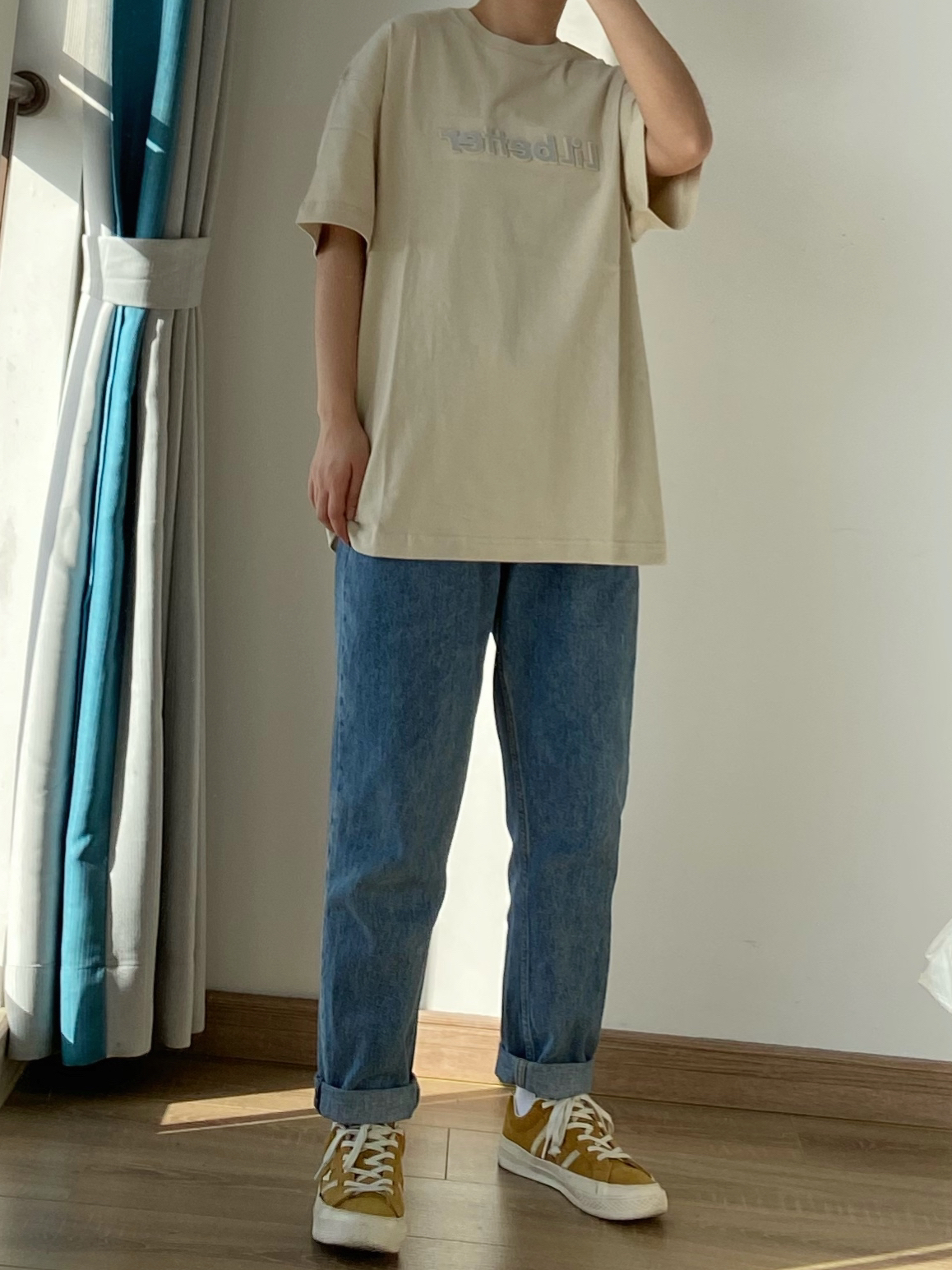 👔是米色的立体印花短袖T恤 搭配蓝色小脚牛仔裤 我之前穿了三年 大家经常问的那条 鞋子是匡威的jack star 👔👖:白告studio