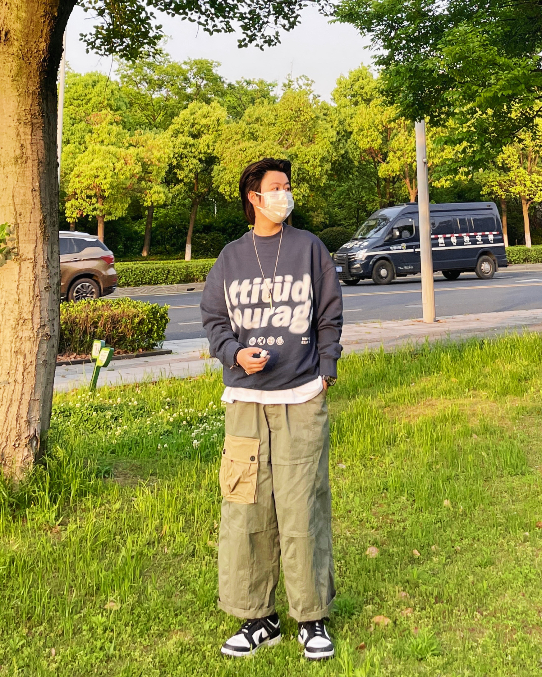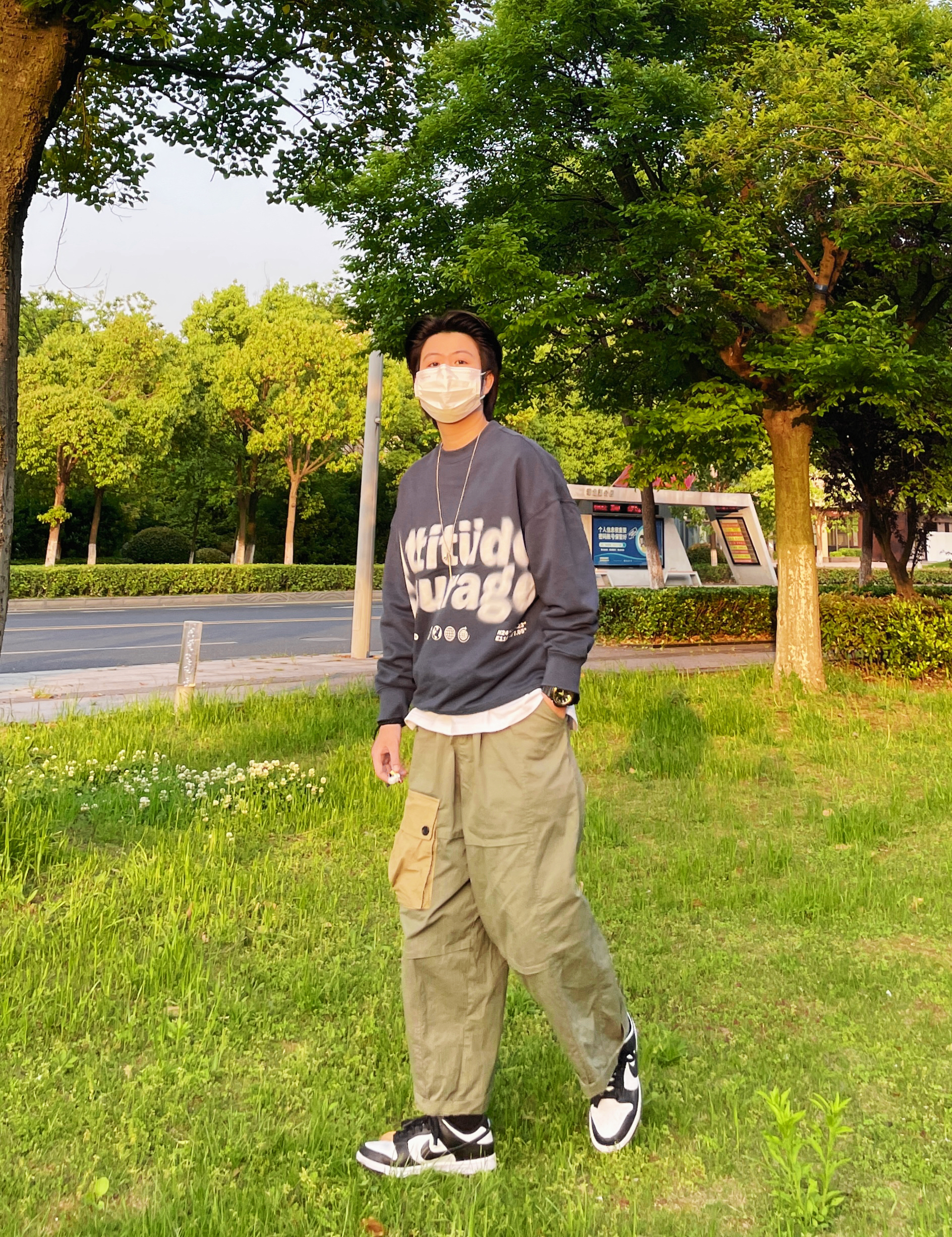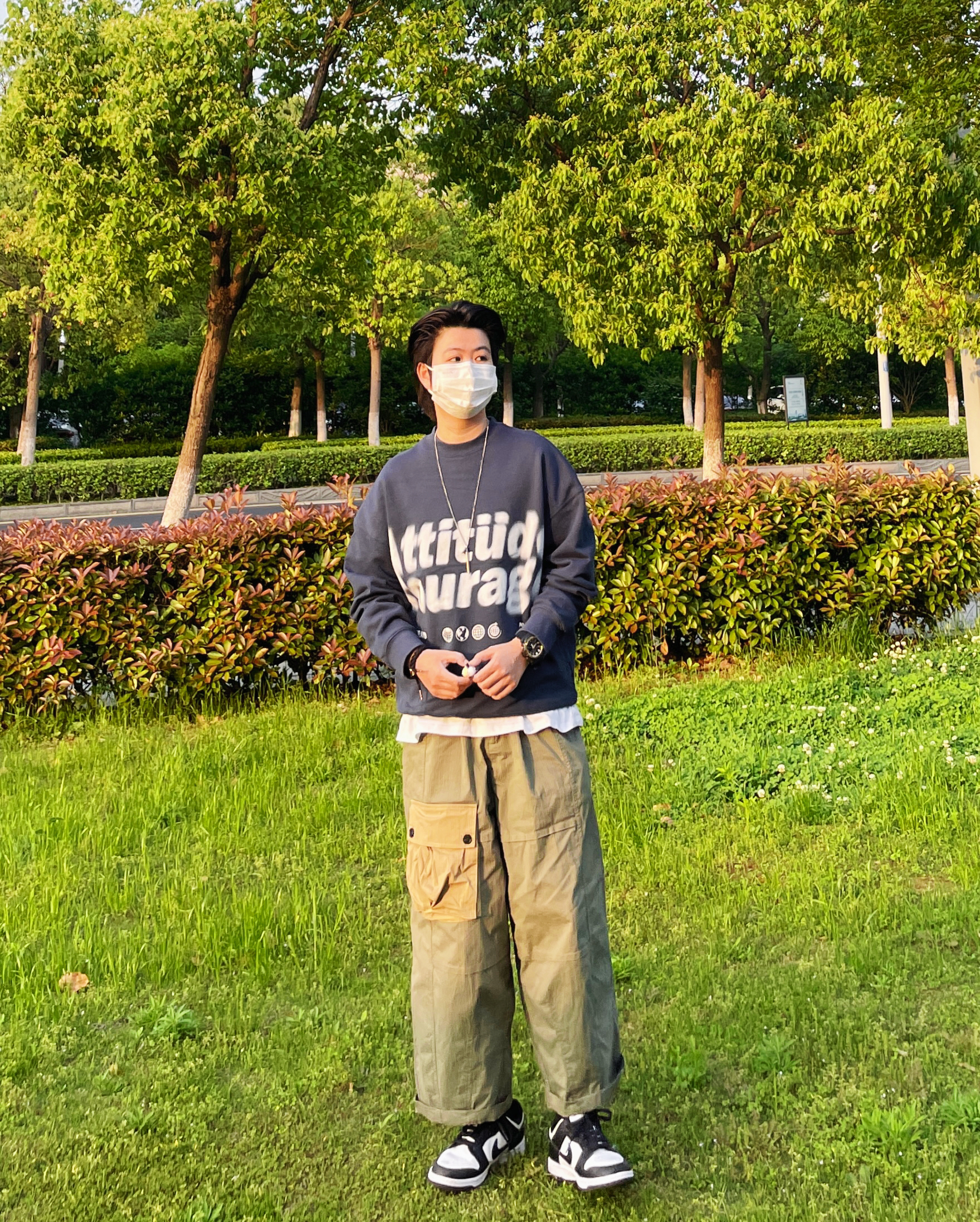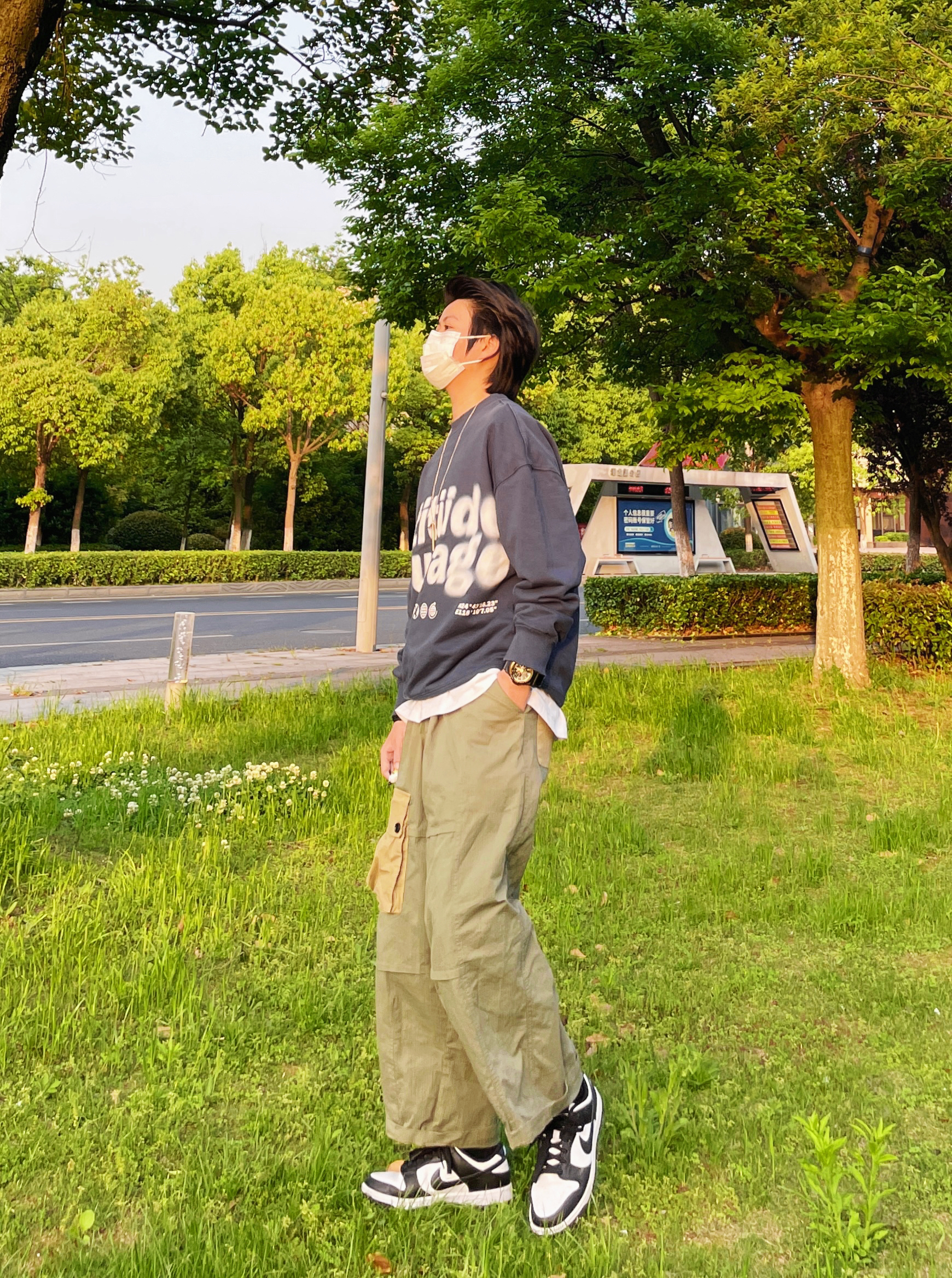 ✨这个五一可以去好好放松一下心情啦 选择舒适的穿搭可以让好心情加倍 宽松的蓝色卫衣随意套一件T恤 再加一件日系工装裤 很nice的一套look 很适合出游穿着 ———————————————— ✨蓝色卫衣/军绿色拼色工装裤/nike熊猫鞋 ———————————————— ✨OOTD|每日穿搭|日常休闲穿搭|今日穿搭|春日男友风穿搭|日系工装风穿搭|军绿色直筒工装裤穿搭|蓝色套头卫衣穿搭|熊猫...