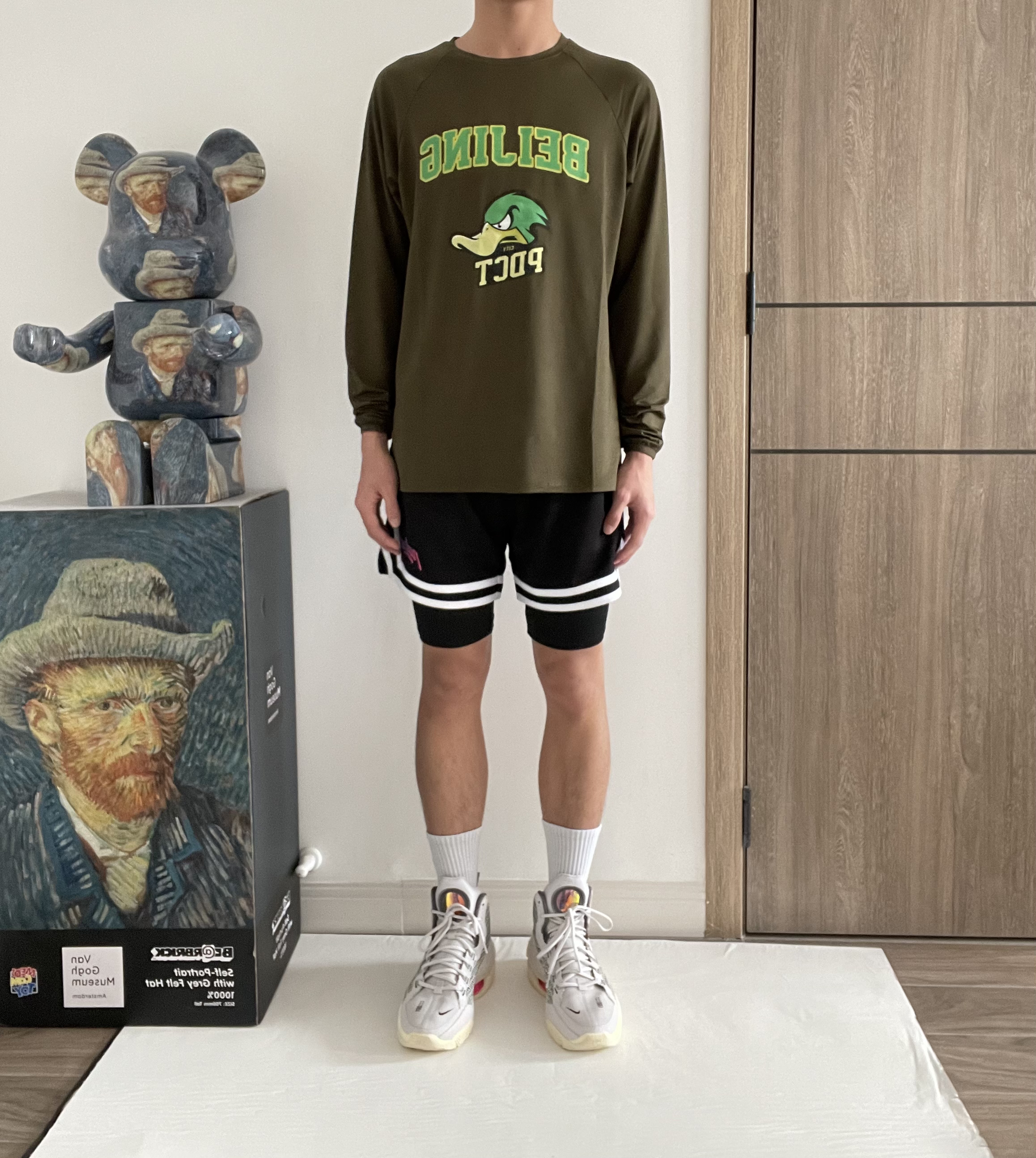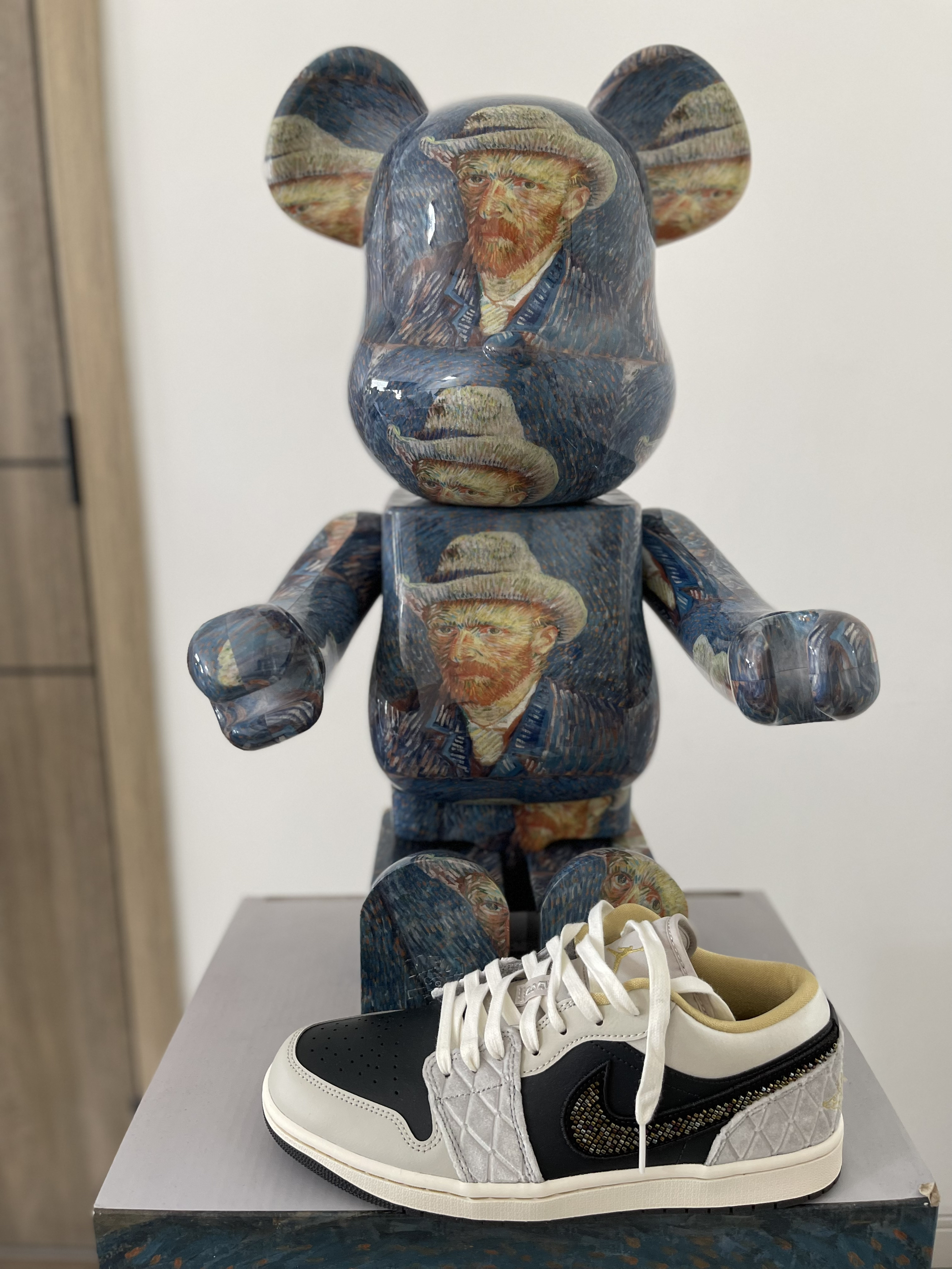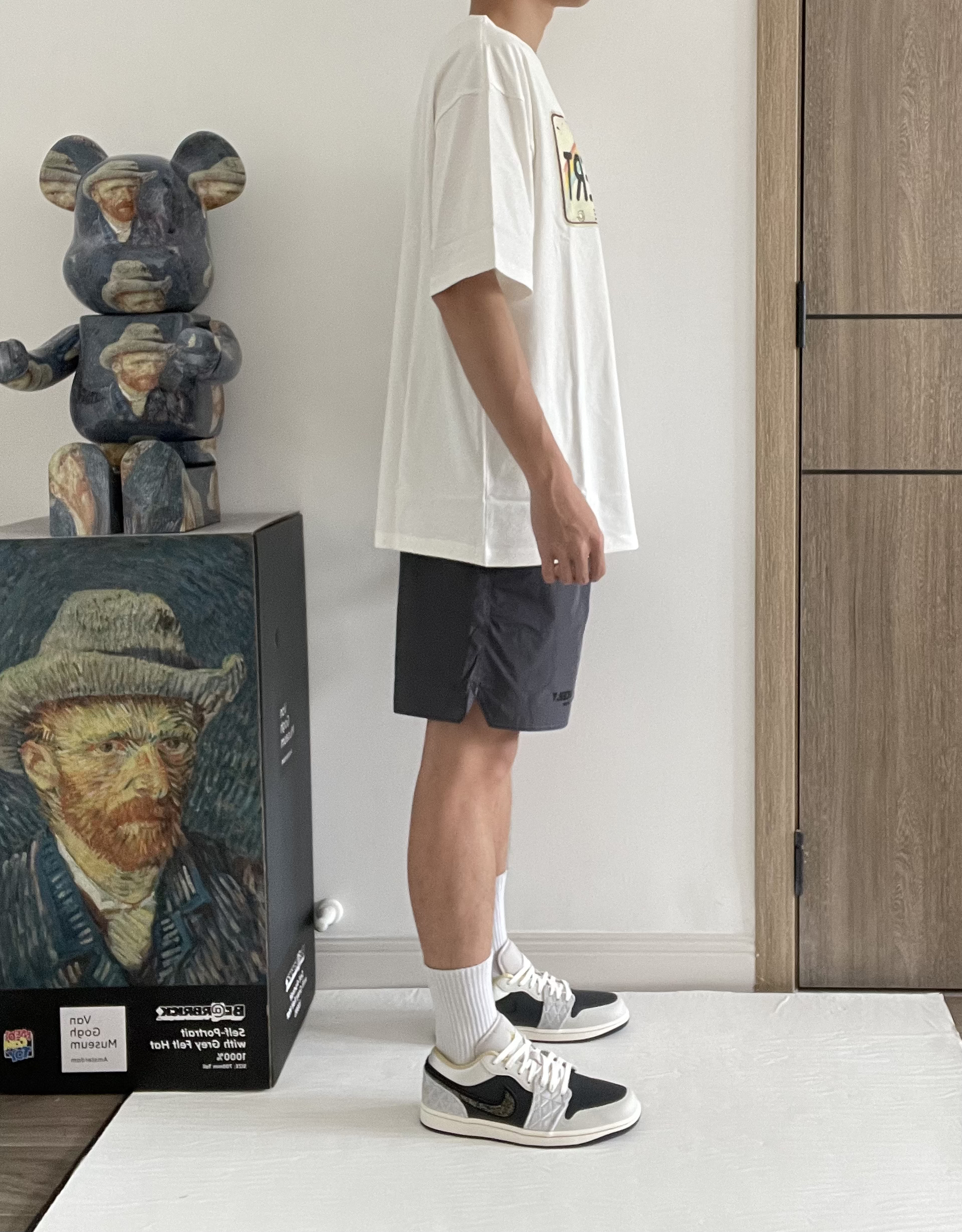 主色调以黑、米白为主,在鞋侧和后跟部位迭用菱形格的天鹅绒设计 鞋身Swoosh采用了金属质感(应该是塑料材质)的变色串珠串联组成,内侧则是皮革。鞋身整体呈现黑色、灰色和金色色调 延续高级灰的奢华属性。鞋后跟的Wings Logo,采用金黄色刺绣很有逼格~鞋底氧化泛黄的感觉,同样十分好看 👕上衣:PDCT美式车牌印花 🩳下装:PDCT涤纶运动裤 👟鞋子:AJ1 low 黑灰丝绸