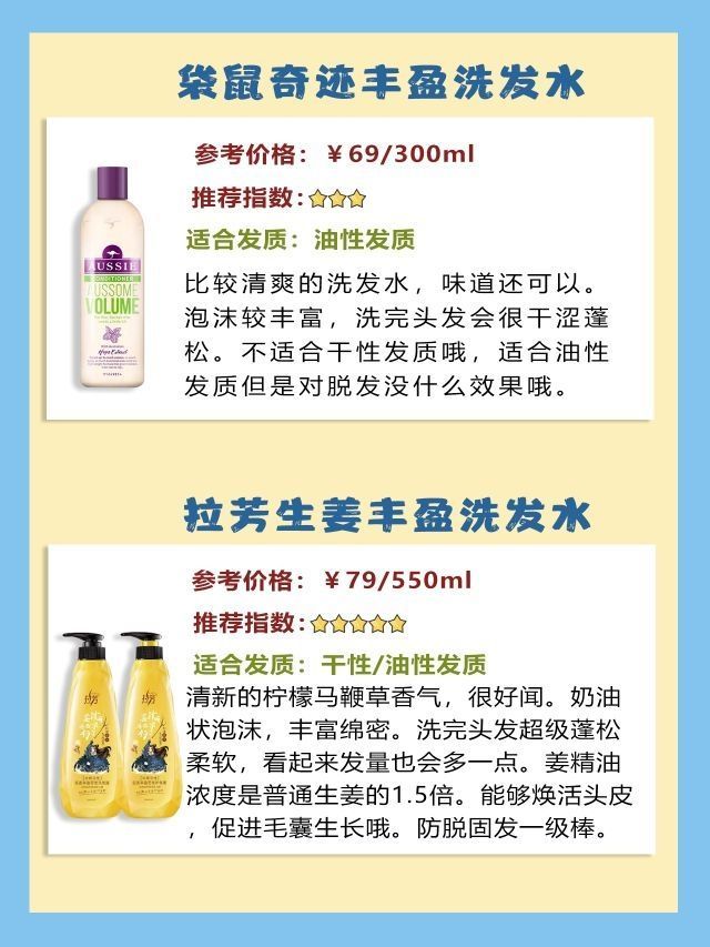 脱发少女不迷茫—— 自从工作以来,压力变大,头发也日渐稀少,尝试了很多方法分享给宝贝们吧~ 首先生活作息很重要哦。 尽量保持早睡早起的好习惯,生活上少吃油腻食物(脂溢性头发),生姜洗发水也至关重要! 热乎乎的生姜洗发水测评—— 袋鼠奇迹丰盈洗发水 参考价格:¥69/300ml 适合发质:油性发质 推荐指数:3星⭐️⭐️⭐️ 拉芳生姜丰盈洗发水 参考价格:¥79/550ml 适...