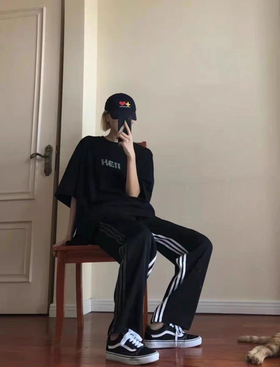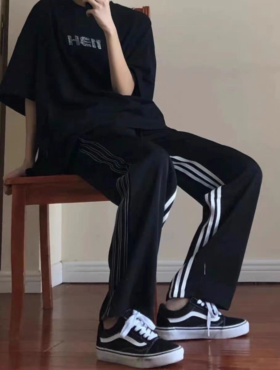 今日Look 行走的黑色种草机 黑T显瘦又百搭,加上黑白撞色条纹的Lee Cooper休闲裤, 裤子垂感好,面料舒服,三条杠设计经典好搭配, 简简单单搭个T恤就很休闲又气质。