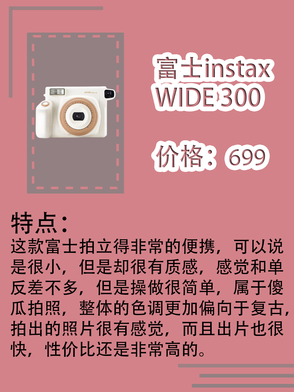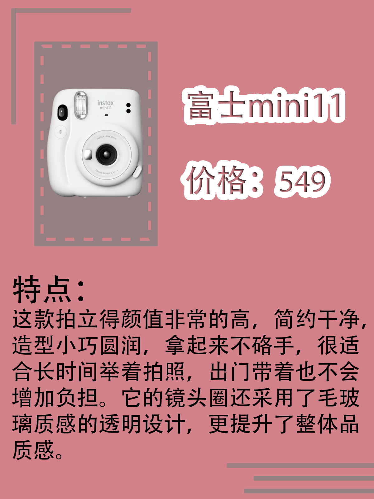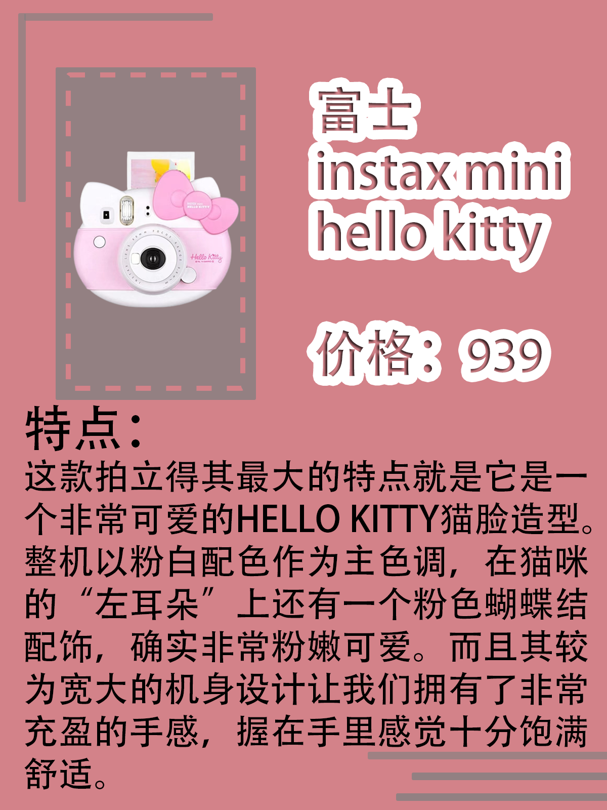 本篇笔记关联了Fujifilm/富士 instax mini hello kitty 拍立得 卡通 HelloKitty粉色定制版、Fujifilm/富士 instax WIDE 300 拍立得 宽幅 一次成像 大视野 即时 奶白色、Fujifilm/富士 instax mini11 拍立得 一次成像 即拍即得 冰晶白等商品,为用户提供真实的使用体验和购买参考。