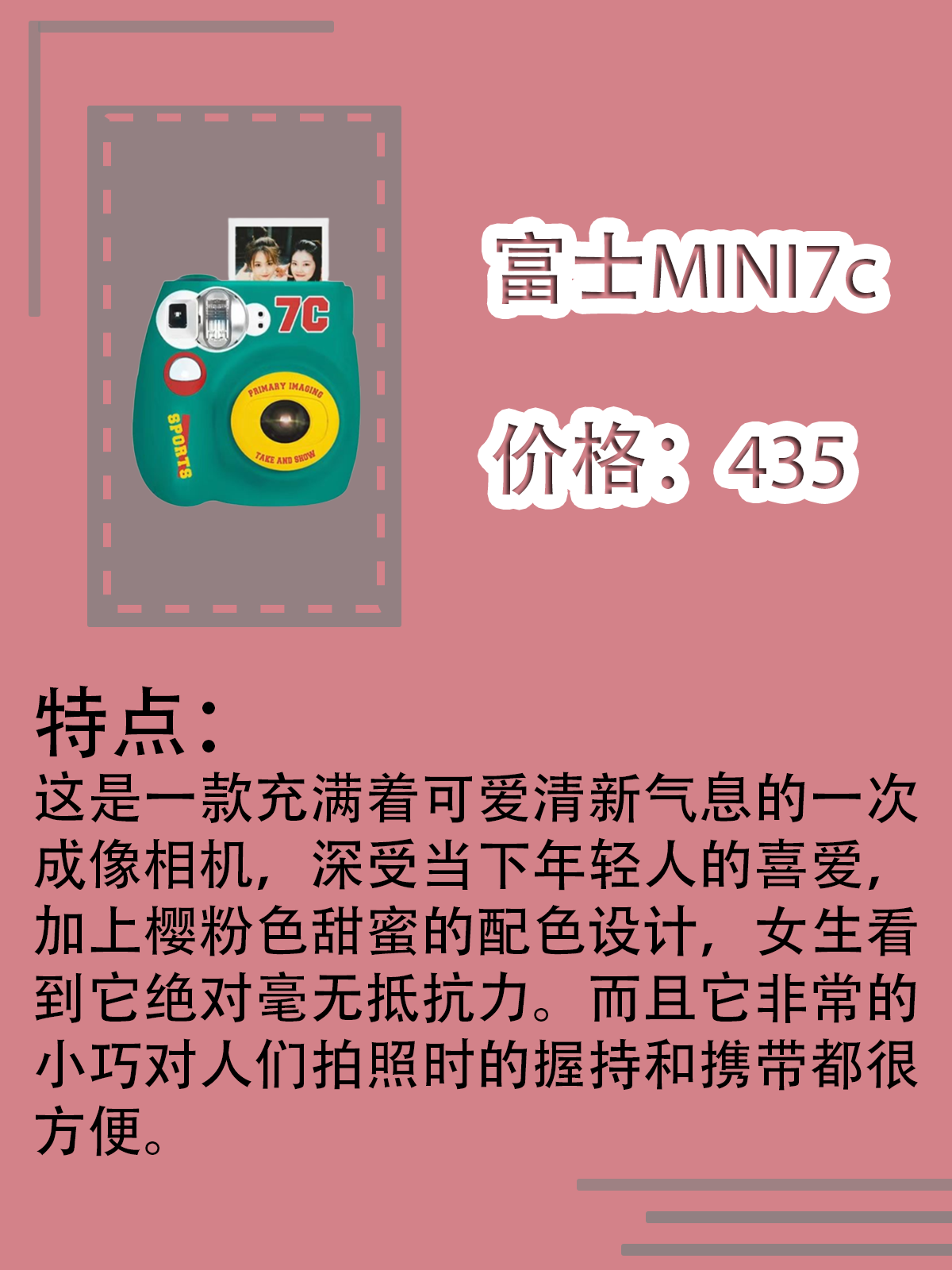 眼瞅着就要到520了,各位朋友都要跟你的TA出去玩了吗?出去玩如果没有美美的照片,那么是不完整的,今天给大家推荐四款拍立得让你带出去拍照更开心! 1.富士MINI7c 价格:435 这是一款充满着可爱清新气息的一次成像相机,深受当下年轻人的喜爱,加上樱粉色甜蜜的配色设计,女生看到它绝对毫无抵抗力。而且它非常的小巧对人们拍照时的握持和携带都很方便。而且它具有自动测光以及自动对焦,在使用上非常的便利...