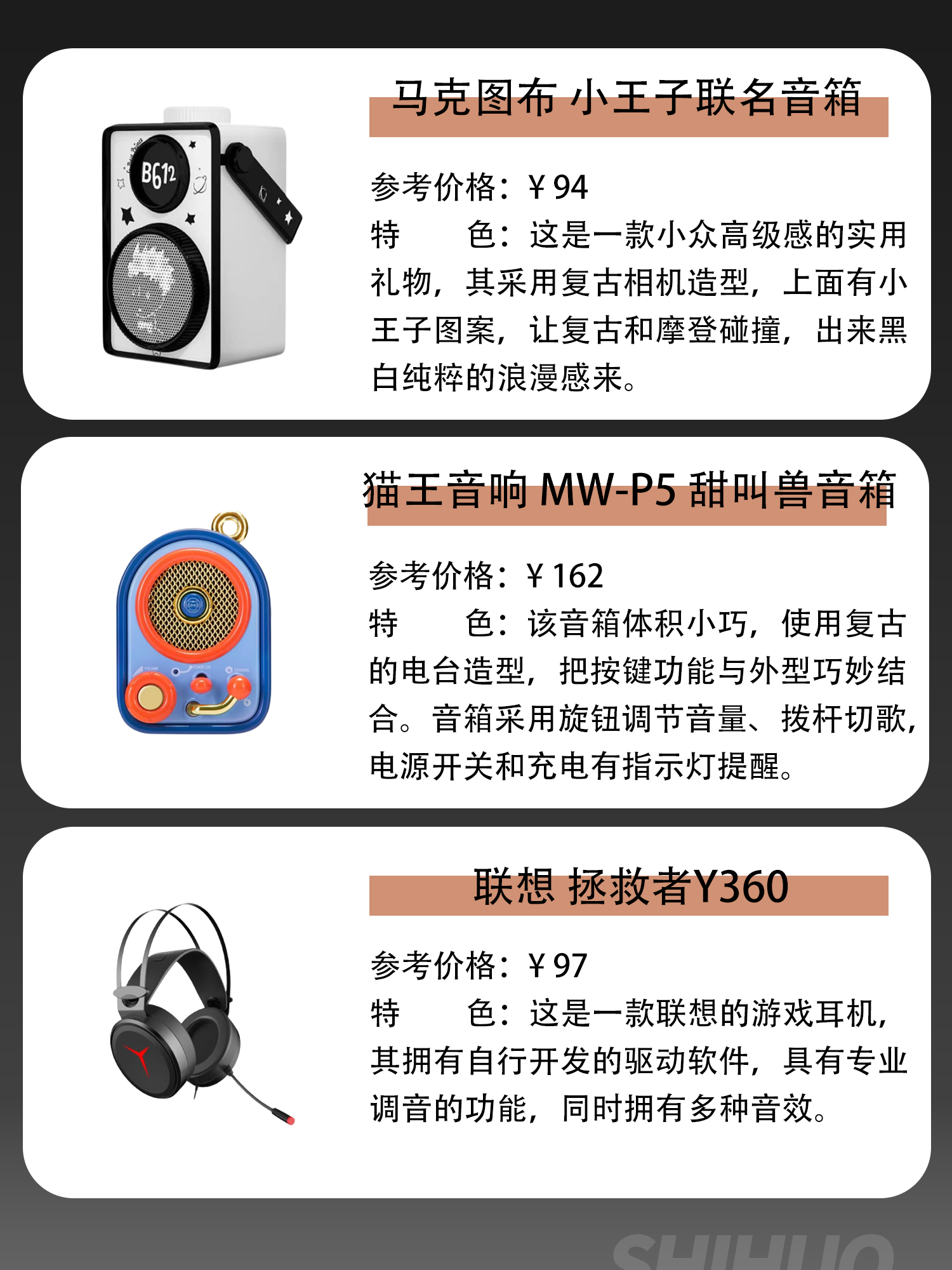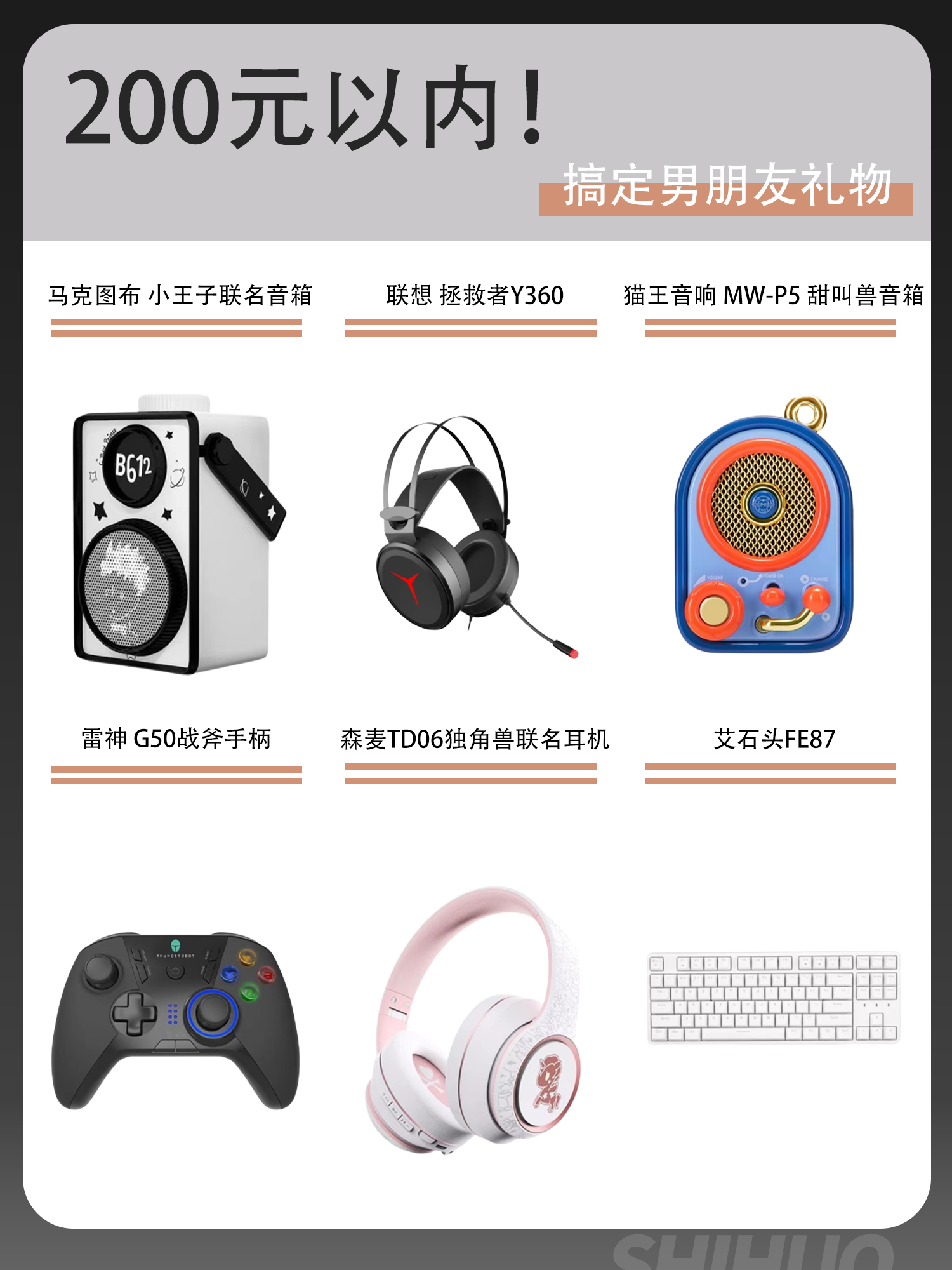马上就到520了,不知道小仙女们给你的男朋友找好礼物了吗?很多朋友还在学生阶段可能预算不高,我给大家介绍几款200以内的好物! 1.马克图布 小王子联名音箱 价格:94 这是一款小众高级感的实用礼物,其采用复古相机造型,上面有小王子图案,让复古和摩登碰撞,出来黑白纯粹的浪漫感来。这款好物体积小巧,搭配了PU手提带,防滑便携,而且相机造型设计感满满,加上旋钮开关,轻松转动,很有仪式感礼物。 2....