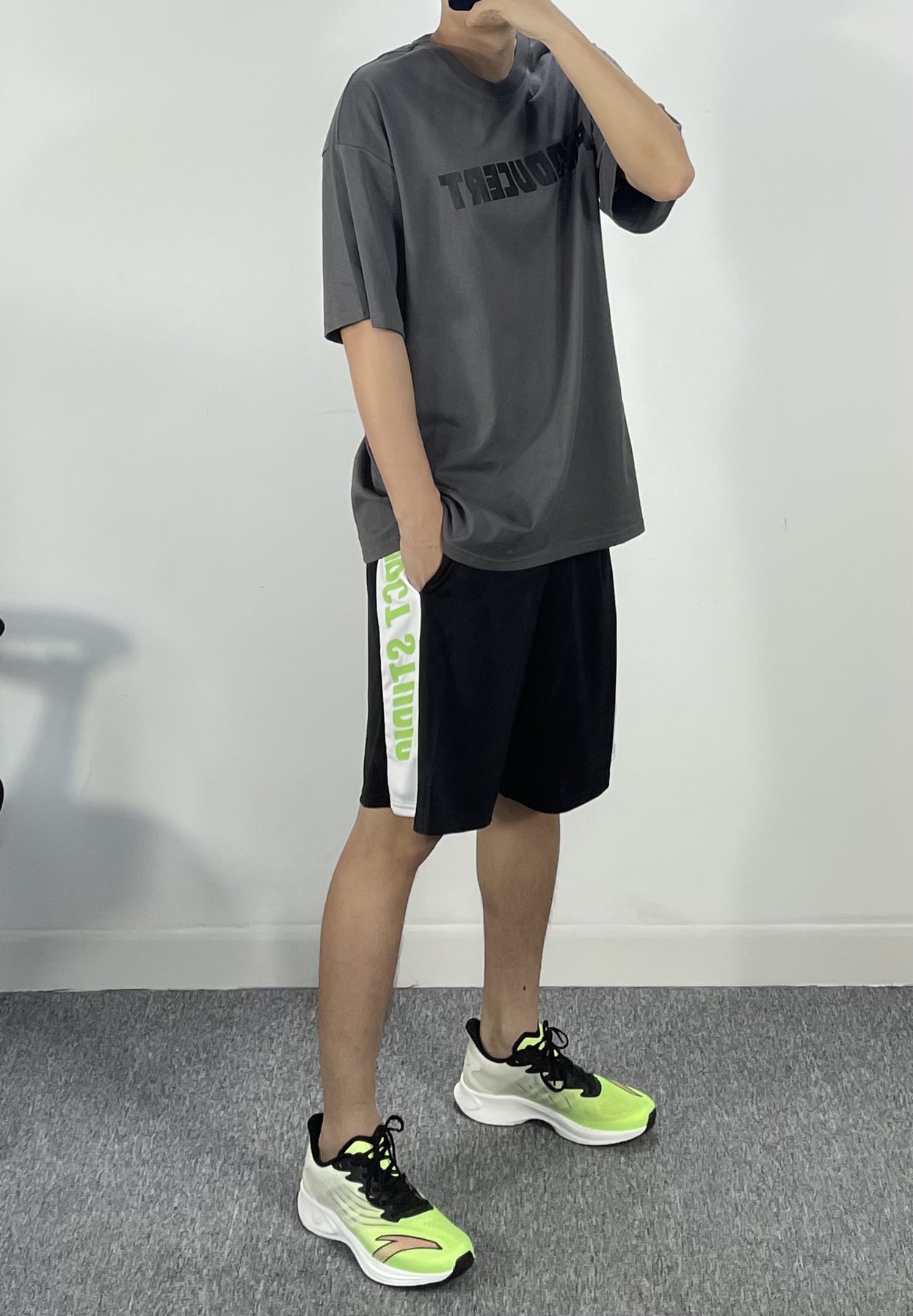 上衣选的是超宽松的美式T恤 版型超极好看!面料230克很适合夏天 不会太薄也不会凸点 对胖子很友好 裤子选的是梭织撞色短裤 有防滑腰带 鞋子是马赫2代 脚感不错透气舒适
