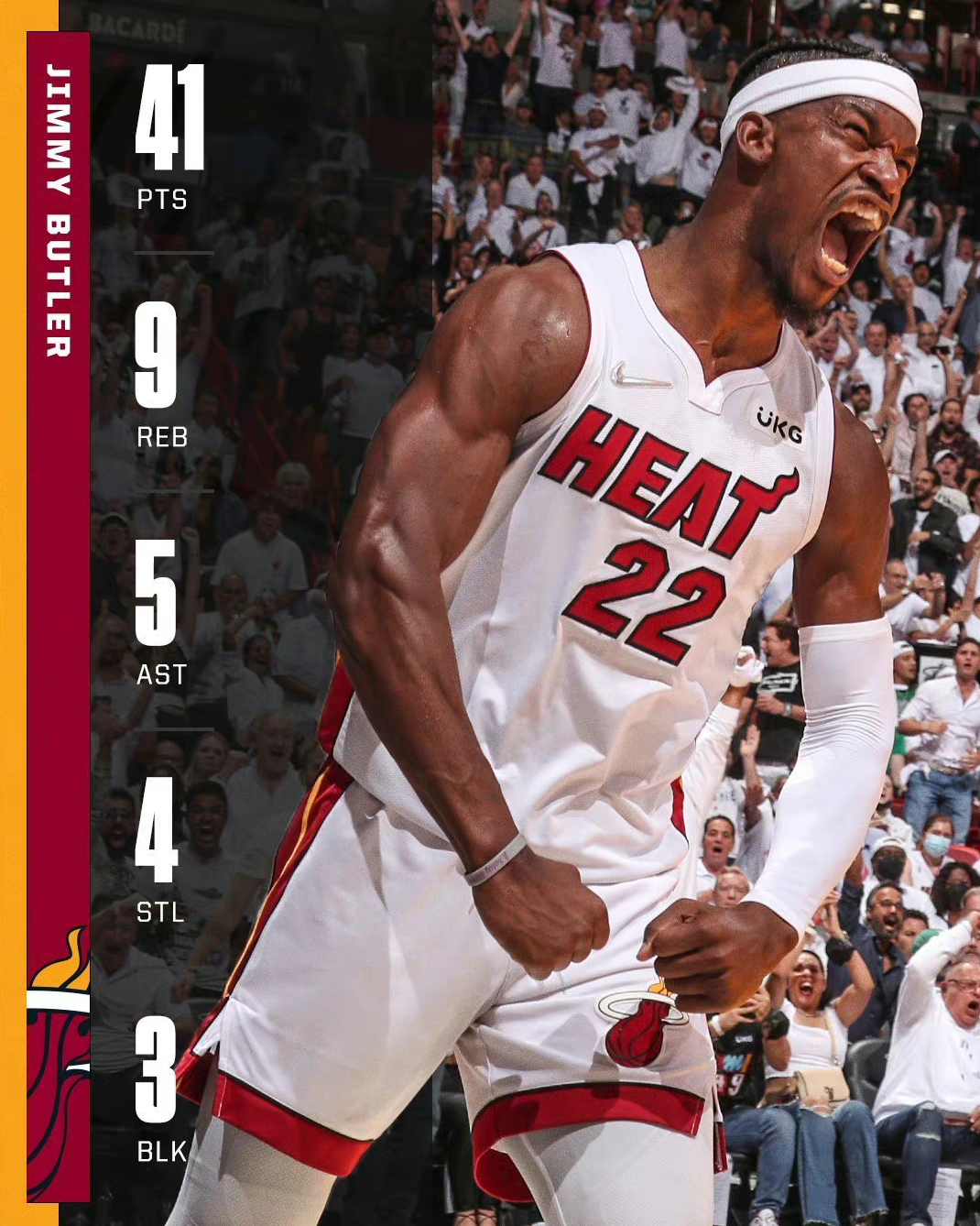 巴特勒炸裂表现单节17分率队逆转热火先下一城!刚结束的东部决赛G1中,吉米-巴特勒统治攻防,第三节单节砍下17分,带领球队反超并拉开分差,全场投篮19中12,罚球18中17,狂揽41分9篮板5助攻4抢断3盖帽!季后赛的JB是真硬! 队友方面希罗18分8板3助,文森特17分2板3助,阿德巴约10分4板4帽,塔克5分6板3助,奥拉迪波5分2断。 最终热火118-117战胜绿军有惊无险守卫了自己的主...