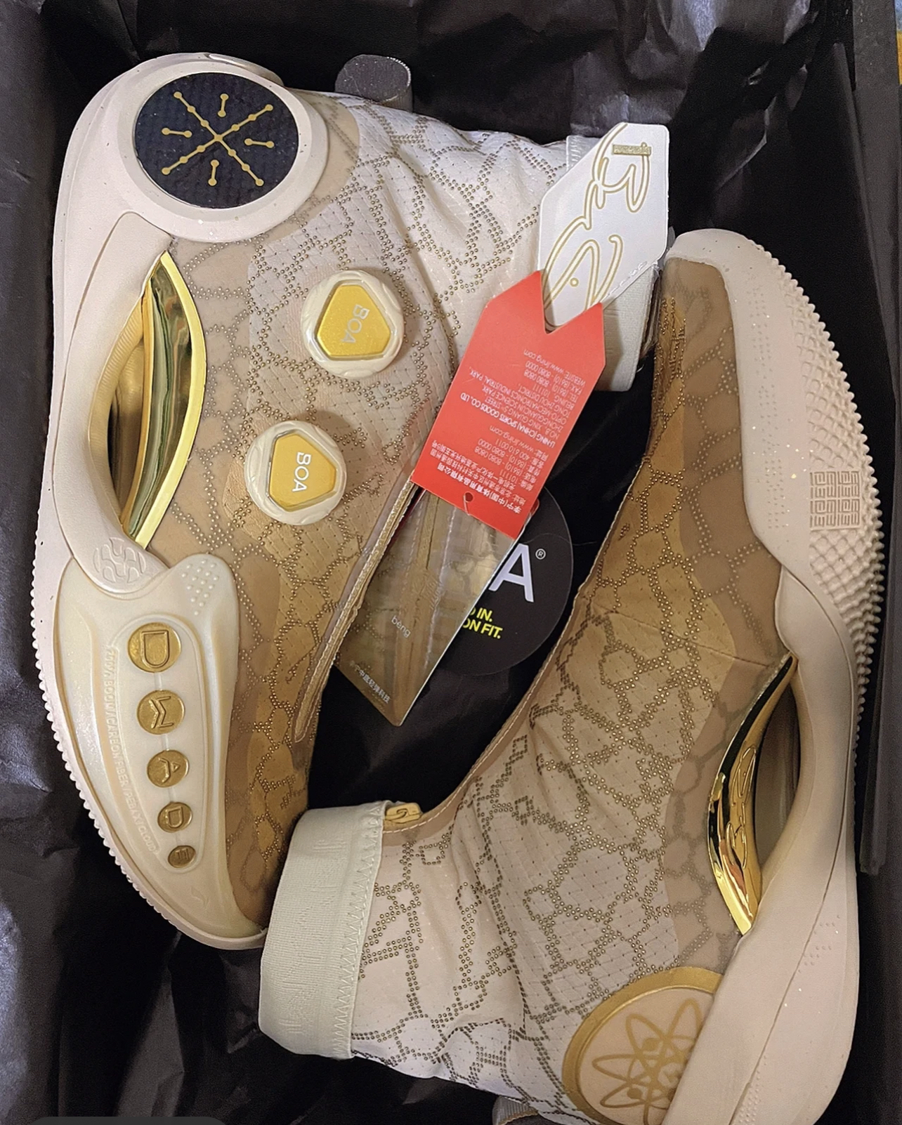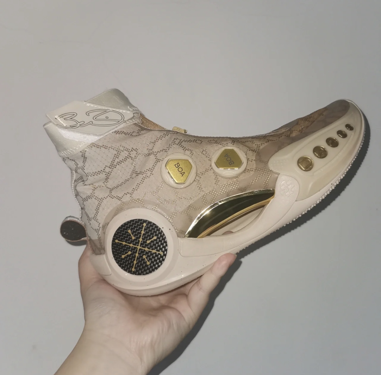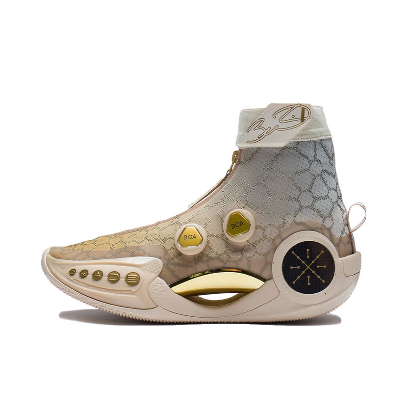 鞋子采用了逐辉配色的经典搭配方案,鞋面用淡黄色填充,还加入了渐变的处理,鞋头是黄色的,到领口位置,变成了灰色,boa 旋钮、中足的pebax 板材都用金色填充,中底采用棕黄色表现,后跟侧面的碳板呈现黑色,上面有金色的韦德之道logo,鞋面上还有一些分子链的纹路点缀 LiNing 李宁韦德之道9 Infinity 轻量实战篮球鞋赤金色逐辉