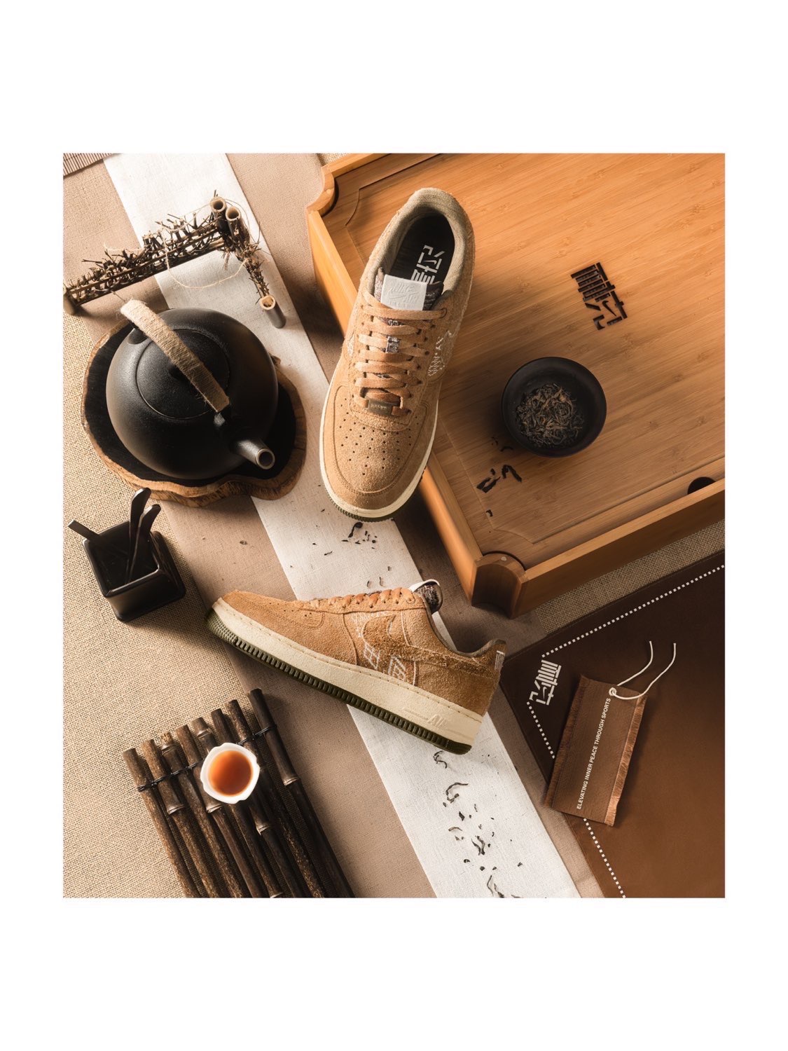 NAI-KE系列,中国风满满,以龙井茶为灵感归来,尽显自然的美学设计风格。Air Force 1 NAI-KE Cha 两款颜色都是低饱和度的。龙井茶汤色为灵感的浅褐色,龙井茶叶为灵感的浅橄榄绿色。你喜欢哪个颜色呢? 鞋侧面的缝线则以别致的编织造型呈现,灵感来自于在采摘、晾晒茶叶时常用的竹篓与竹匾;而后跟和鞋舌的别致图案,创意来自茶园景致;帆布中底巧搭合成革衬里。 不仅鞋盒是深蓝色的有着耐克字...