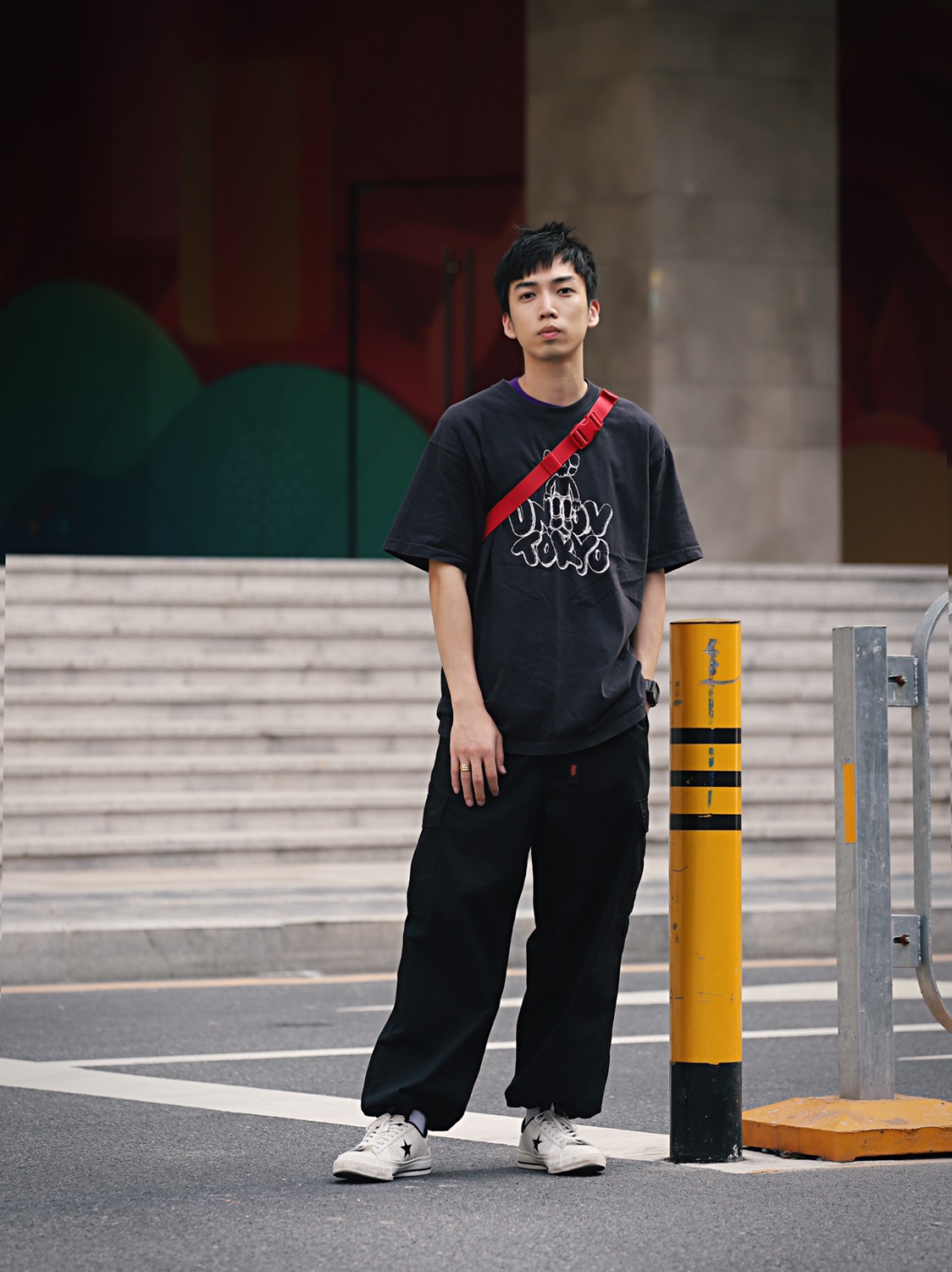 我的今日穿搭 包包:like dreams 美国的一个牌子,国内比较少见 T恤:in silence 版型不错,比较简单的字母印花T 裤子:Visitation 裤子的设计感很不错,细节很足,裤脚边上有反光设计。 鞋子:李宁烈骏 复古风格+现代潮流,优质真皮与三明治网布复合加持 正面几乎纯黑色的T恤搭配了一个比较有层次的包,然后是裤子,设计感很足,细节也是非常到位,鞋子同样是层次十足。