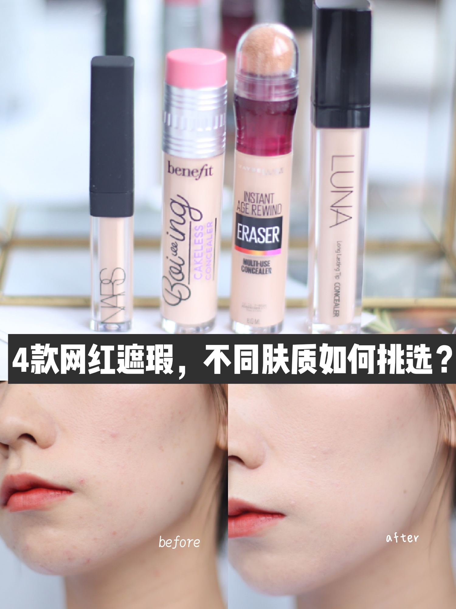 今天就跟你们测评一下我自己用过的4款网红遮瑕产品,拔草还是种草你们自己选! 个人肤质 油皮:毛孔粗大,有痘印 美宝莲橡皮擦79元: 遮瑕中等,看起来很水润但是抹开有点干,不太适合干皮的小姐姐!油皮和混合皮的小姐姐放心入!但是吧,我想嫌弃这个海绵头不太卫生,容易滋生细菌!用量控制不太好! NARS遮瑕液300元: 质地水润,奶油质地!遮瑕效果中等吧,上妆不会卡粉,不管是干皮还是油皮都可以用!但...