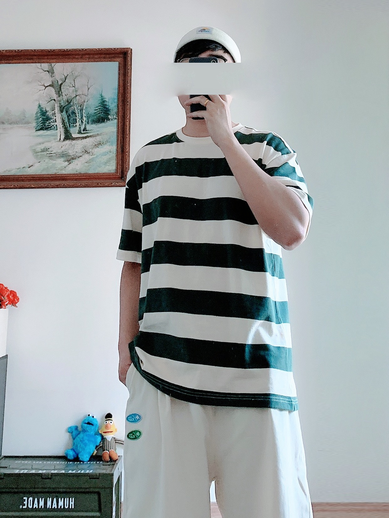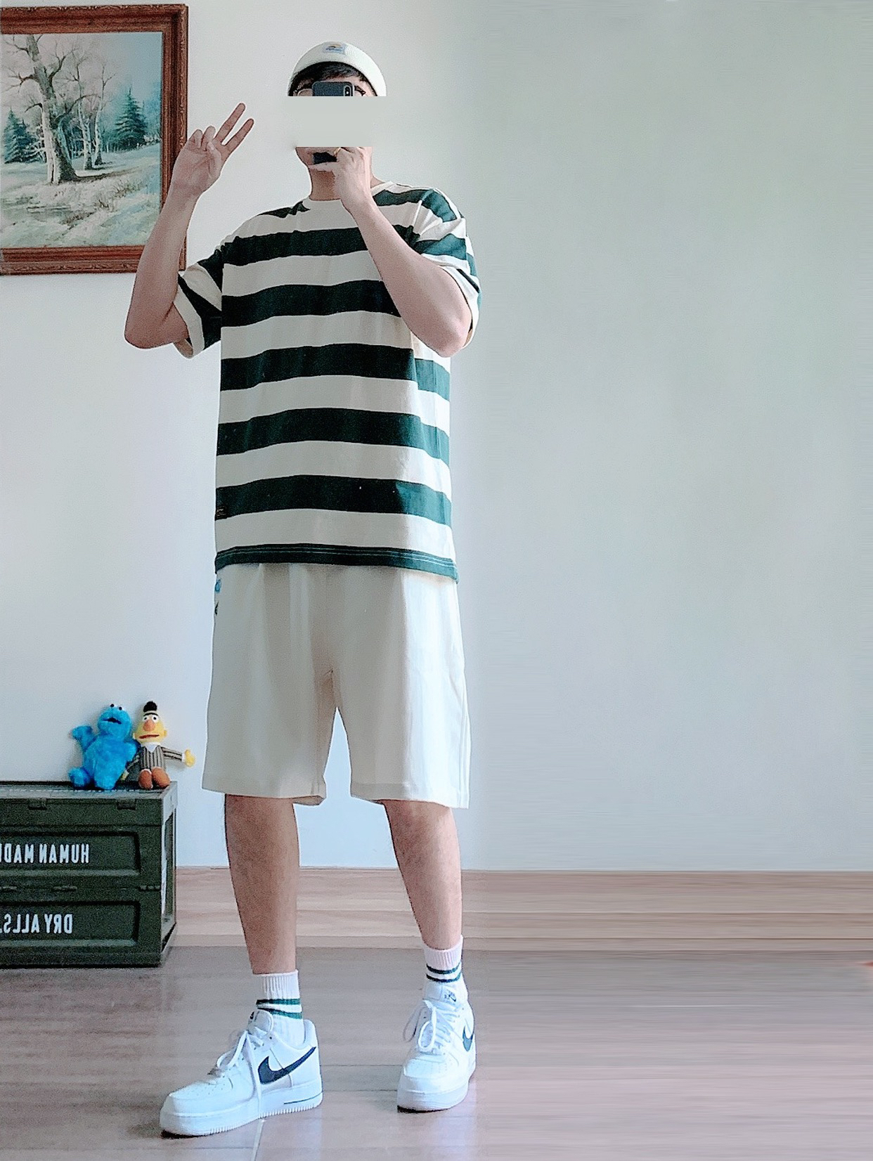 男朋友穿搭参考来咯~ ‼️简单的条纹T恤搭配运动五分裤的日常穿搭啦~ 穿惯了休闲风,😎偶尔切换一下风格! 绿色条纹短袖与卡其色运动短裤颜色呼应。 搭配纯白黑勾Af1,更显时尚街头感💯 ——