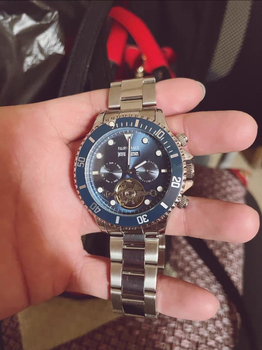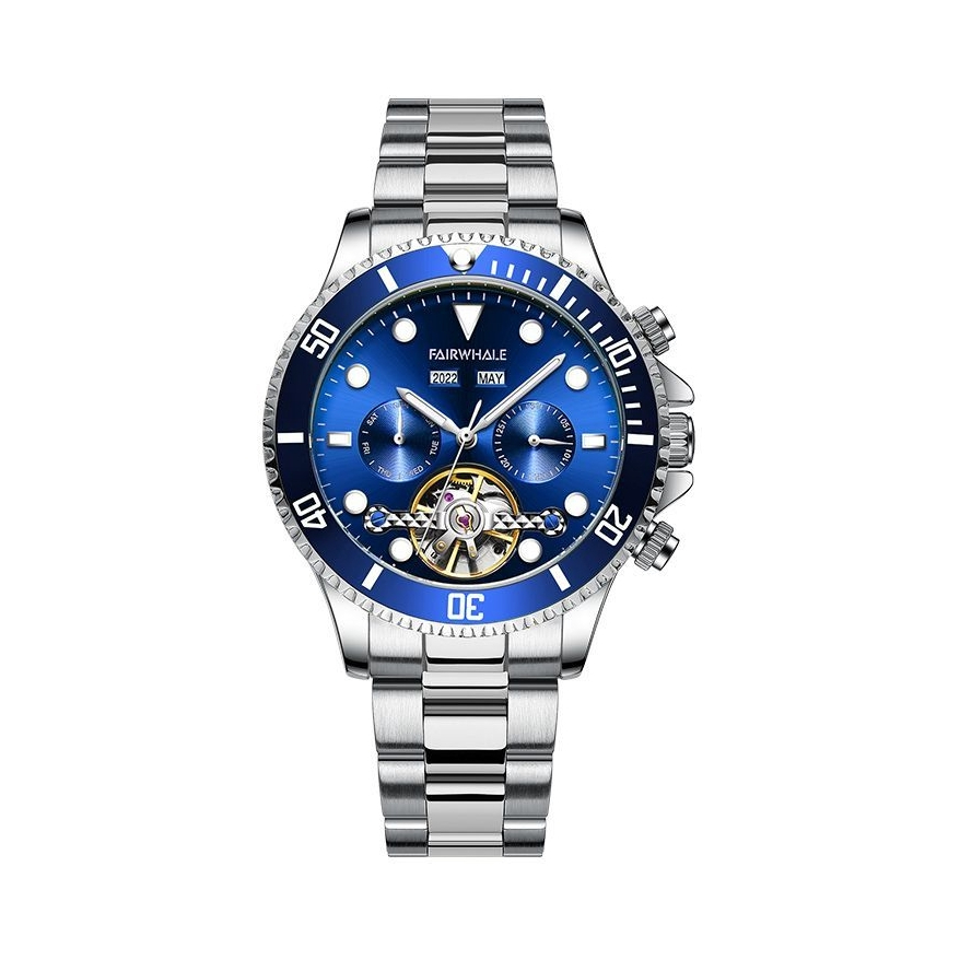 本篇笔记关联了Mark Fairwhale/马克华菲 大表盘镂空陀飞轮夜光霸气日历显示潜水防水钢带自动机械男士手表 银壳蓝面钢带 等商品,为用户提供真实的使用体验和购买参考。