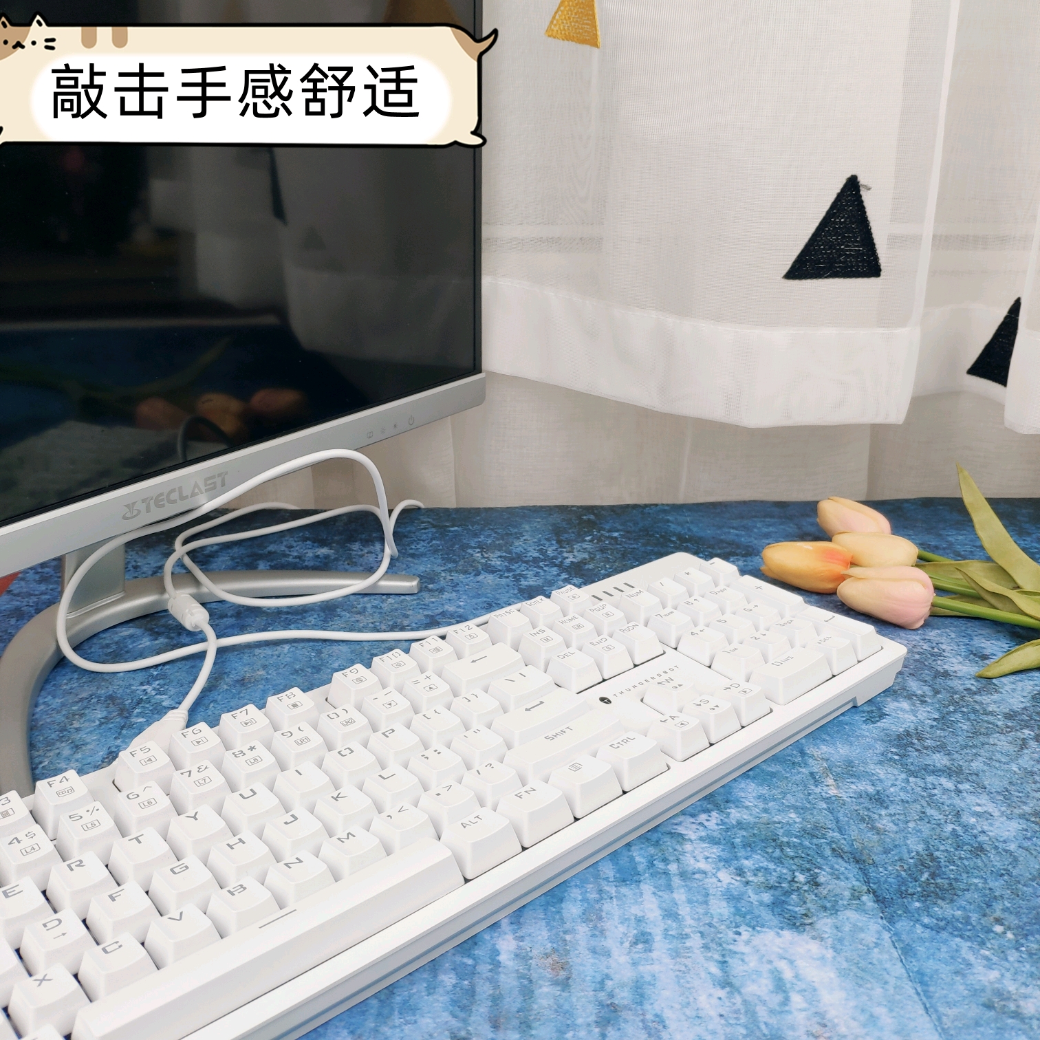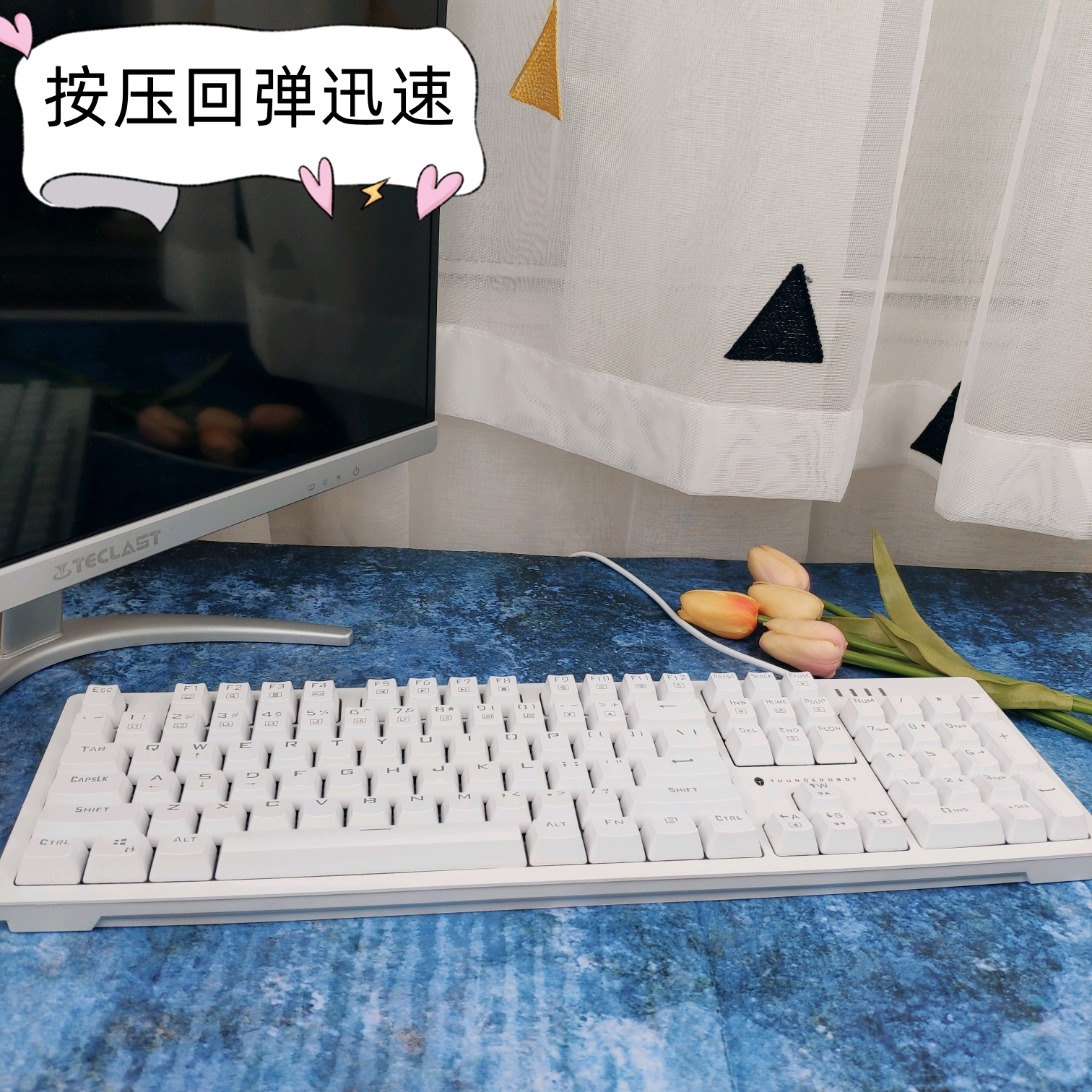 💕这款键盘的轴体是雷神的TR轴,再细分就是大家熟知的青轴与红轴两种了。因为不喜欢吵闹的青轴,于是选择了安安静静,直来直去的红轴。使用一段时间后,我感觉雷神TR轴的红轴的似乎要比其他类型的红轴的按压手感要重一点点,当然声音也要比其他类型的红轴声音要小,完全没有按压的段落感。对于只有轻度游戏,且有办公类需求的人群,这款红轴真的是再合适不过了。当然要是追求轻快的手感与段落感,喜欢在游戏中犹如狂风暴雨般的敲击。