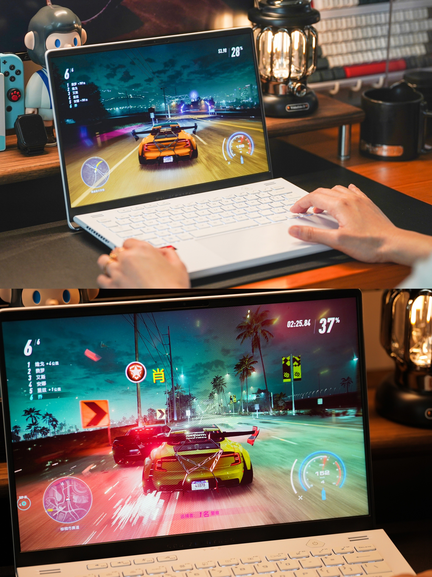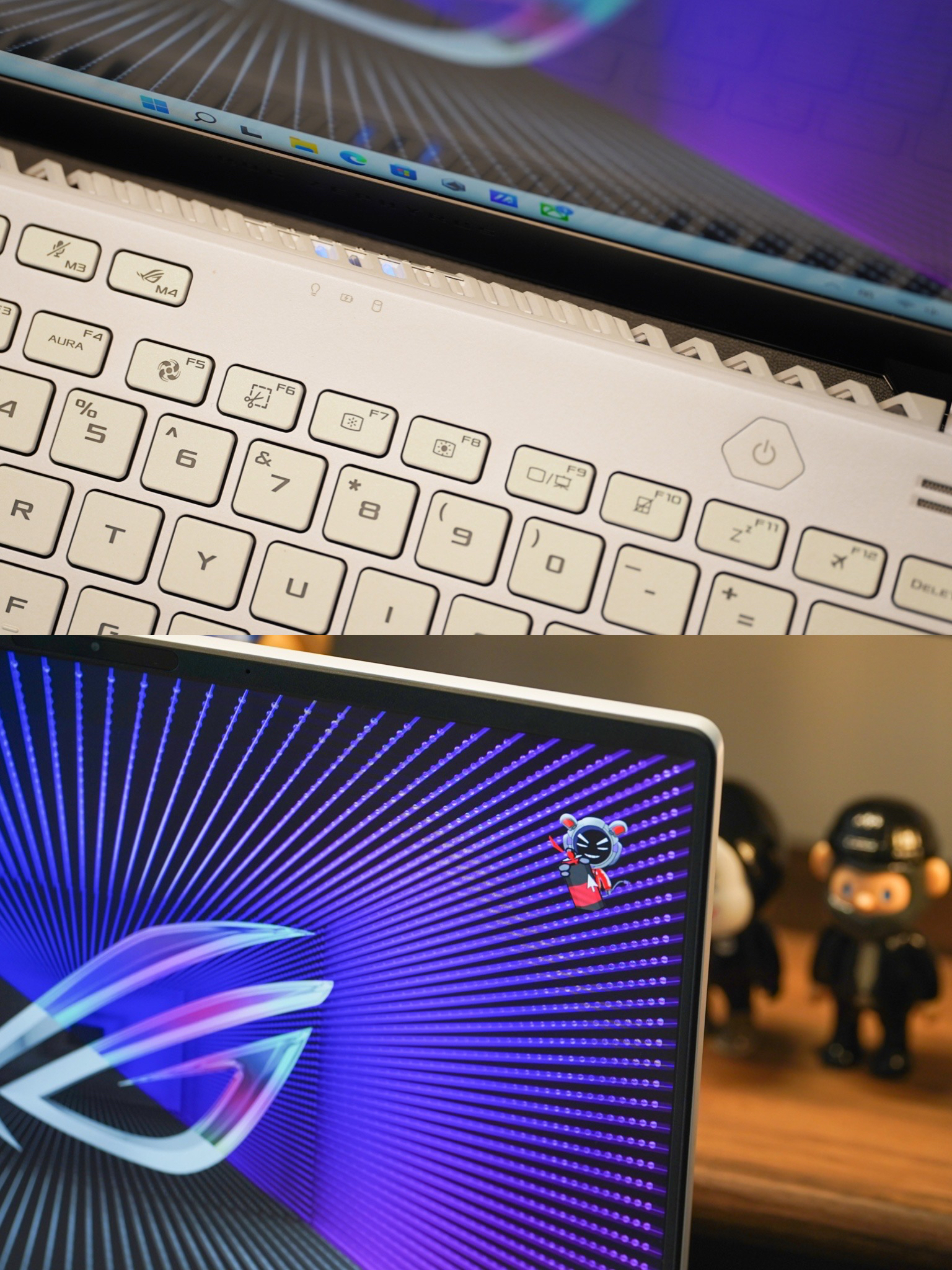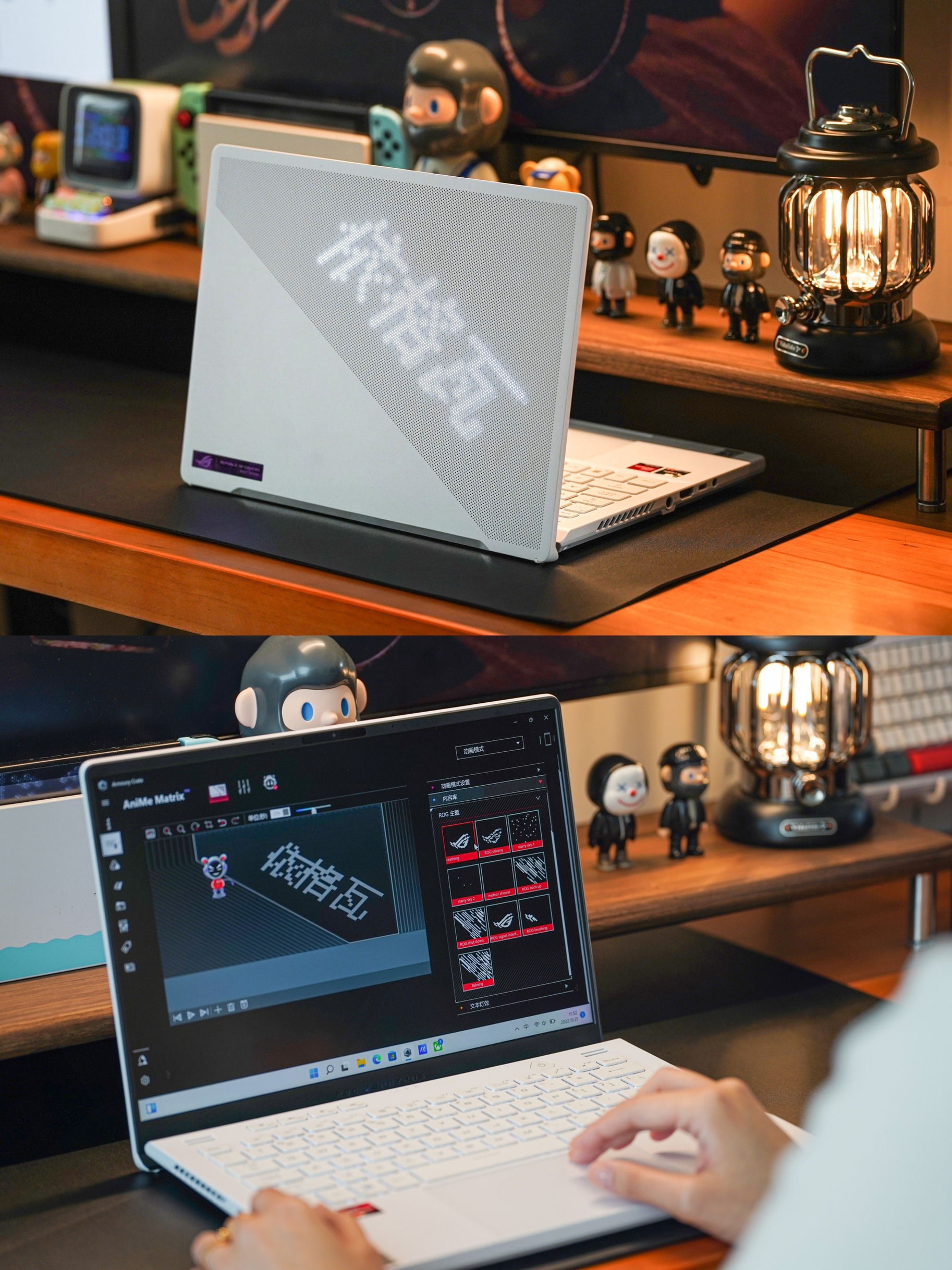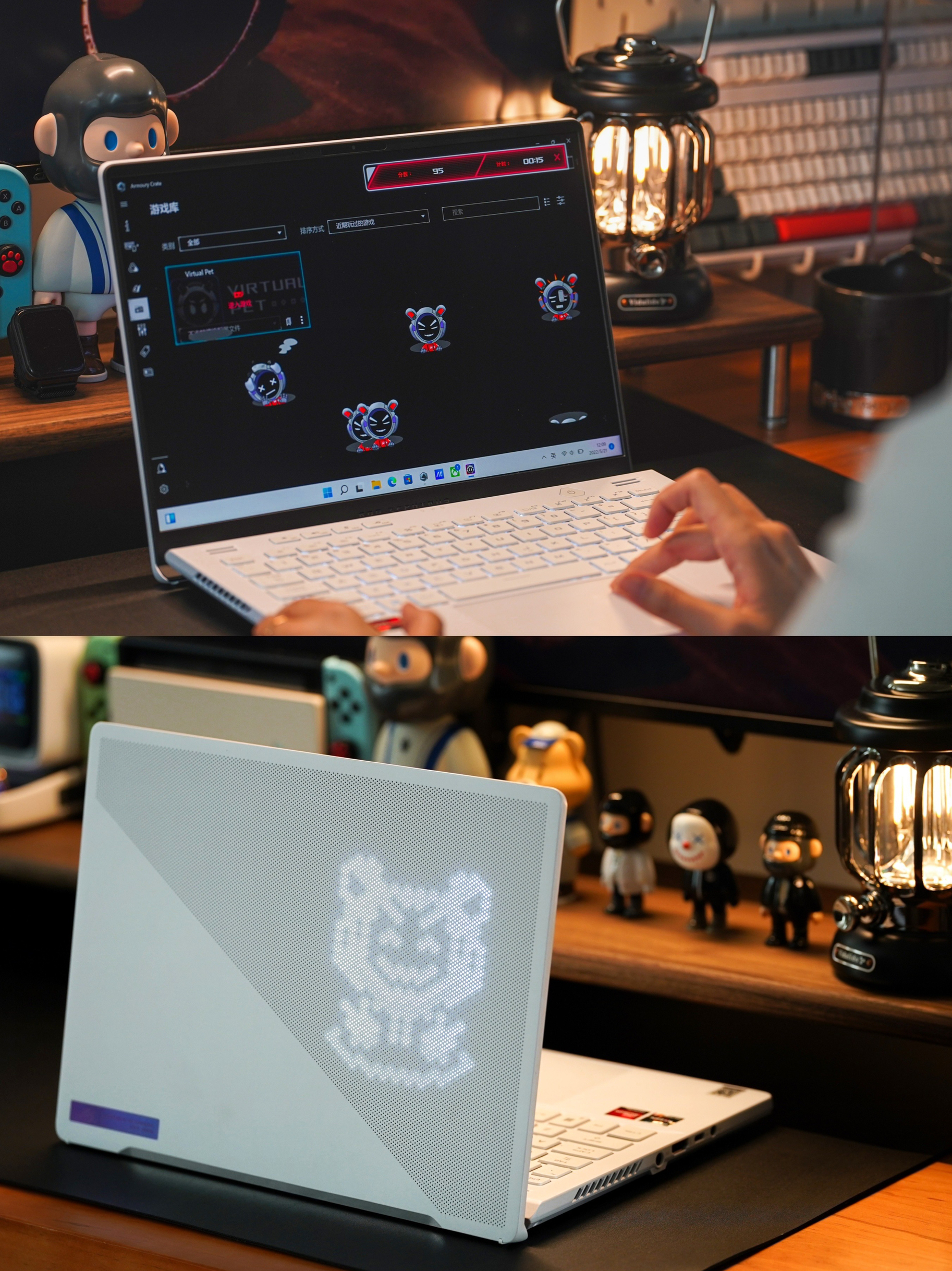 👩🏻💻女生看到很难不喜欢的ROG幻14!全白的机身颜色+游戏本的性能配置,让不喜欢游戏本硬朗、厚重的我,直接被幻14的颜值和性能抓住!真的一改往日对游戏本的印象! ▪️ROG幻14连顶盖都是“戏”!在光显矩阵上可以自己随意设定图片、文字、或动画等等,我在电脑上玩小游戏,画面可以同步在光线矩阵上,炫酷感满满!这也太有趣了吧! 💻游戏本的性能配置也是我所在意的。ROG幻14采用的是AMD 600...