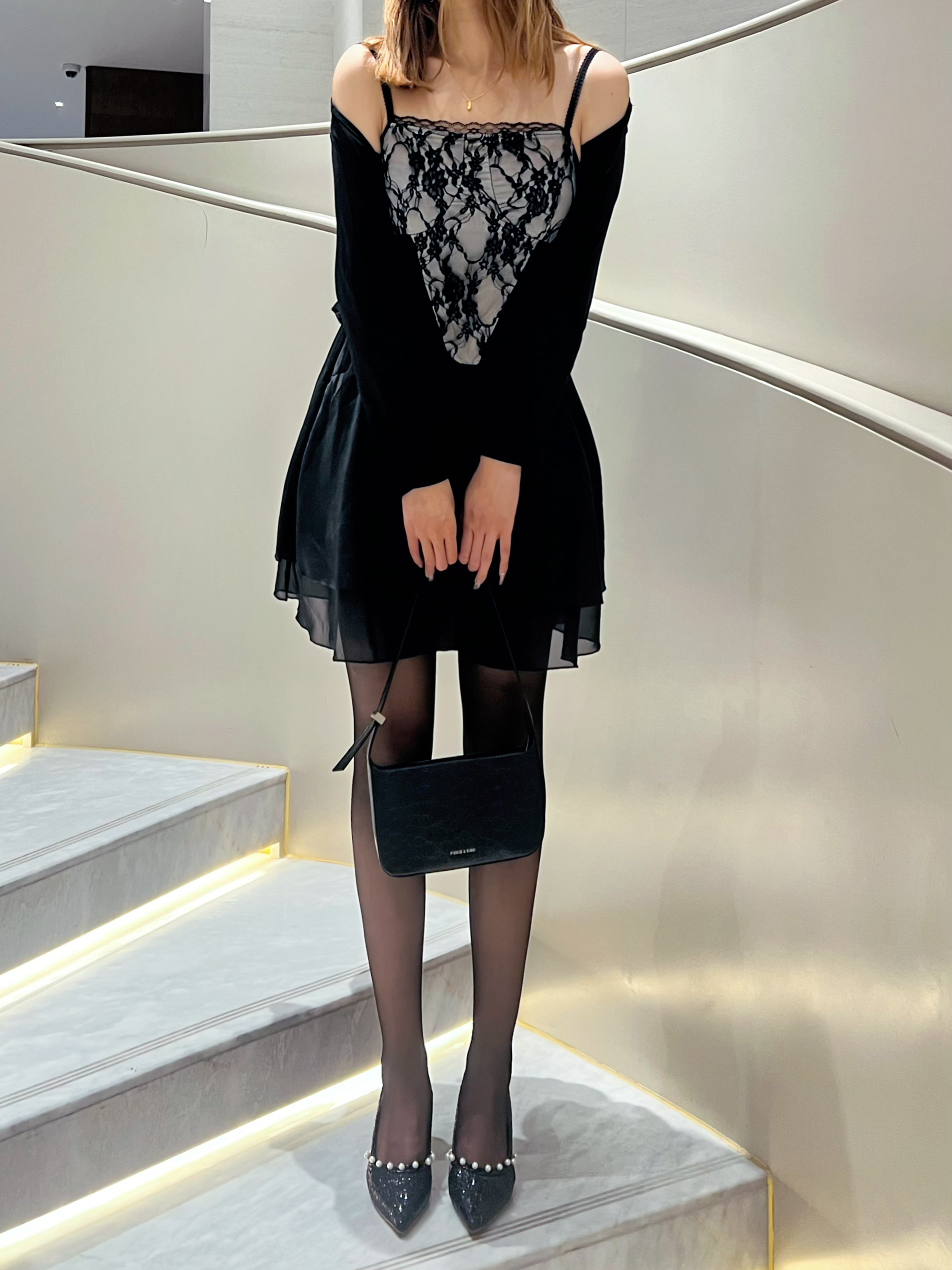 🧦:涞觅 ⭐️分享一个很适合在炎热的夏天穿的夏日约会穿搭,今天我选择了一个蕾丝设计的灰色连衣裙,我搭配了一个短款的外套,更显精致,下身穿了丝袜和高跟鞋,如果搭配马丁靴的话会更加可爱少女,搭配高跟鞋就会更加成熟一些~ ⭐️配饰带了一个金色的羽毛锁骨链,作为点缀,搭配了一个黑色的石头纹腋下包,很喜欢今天这个约会穿搭~