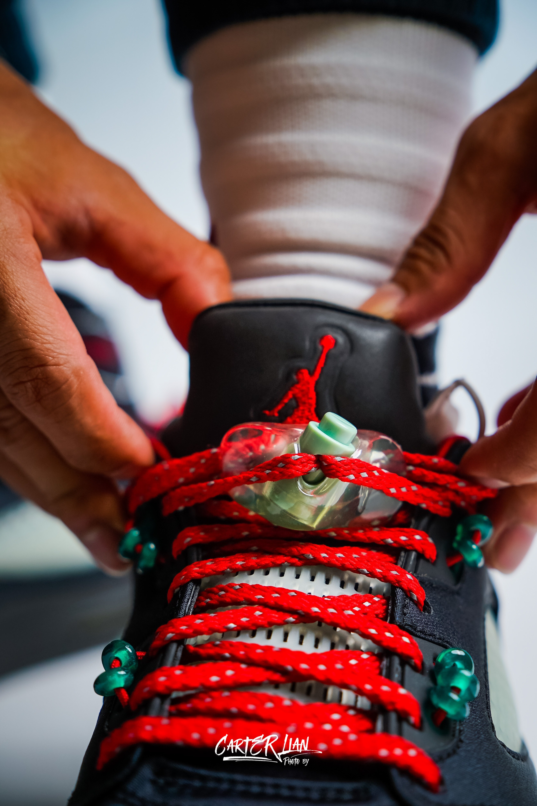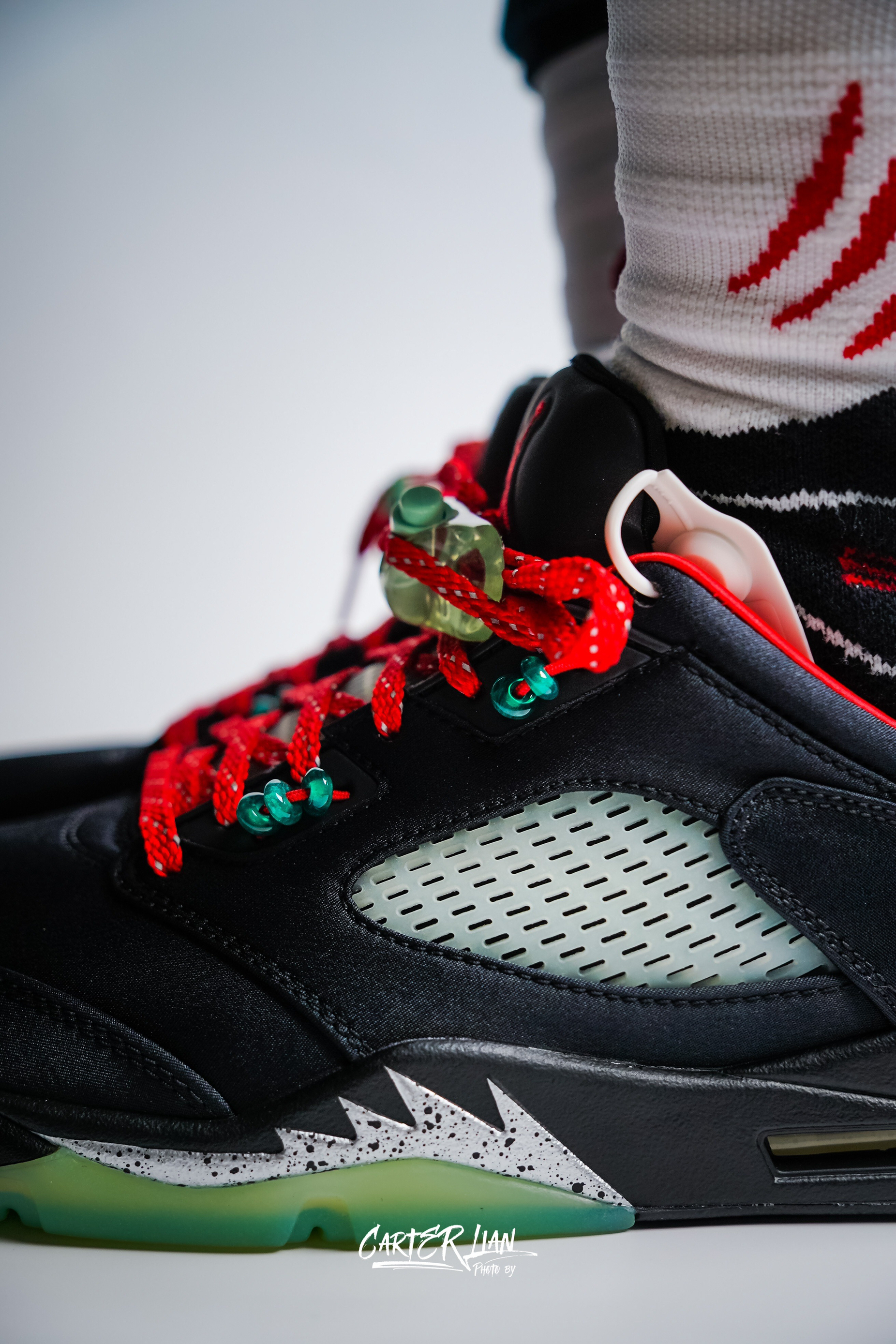 这次发售的Clot联名的AJ5一如既往的采用了中国风的设计,以中国传统的玉饰为灵感来源而设计出的中国玉,拿到手后实物的质感还是非常出色的。 整体细节👀:整体以黑色丝绸质感的尼龙材质鞋面为主,加以红色和绿色进行点缀,半透明的鞋带扣,网格片,水晶大底都采用了玉石色的设计,能有种晶莹剔透的美感,水晶大底的夜光效果也是特别帅气。内衬和携带都用了红色来装点,鞋带扣上还用红绳搭配2.3排列的小串珠。侧边用汉...