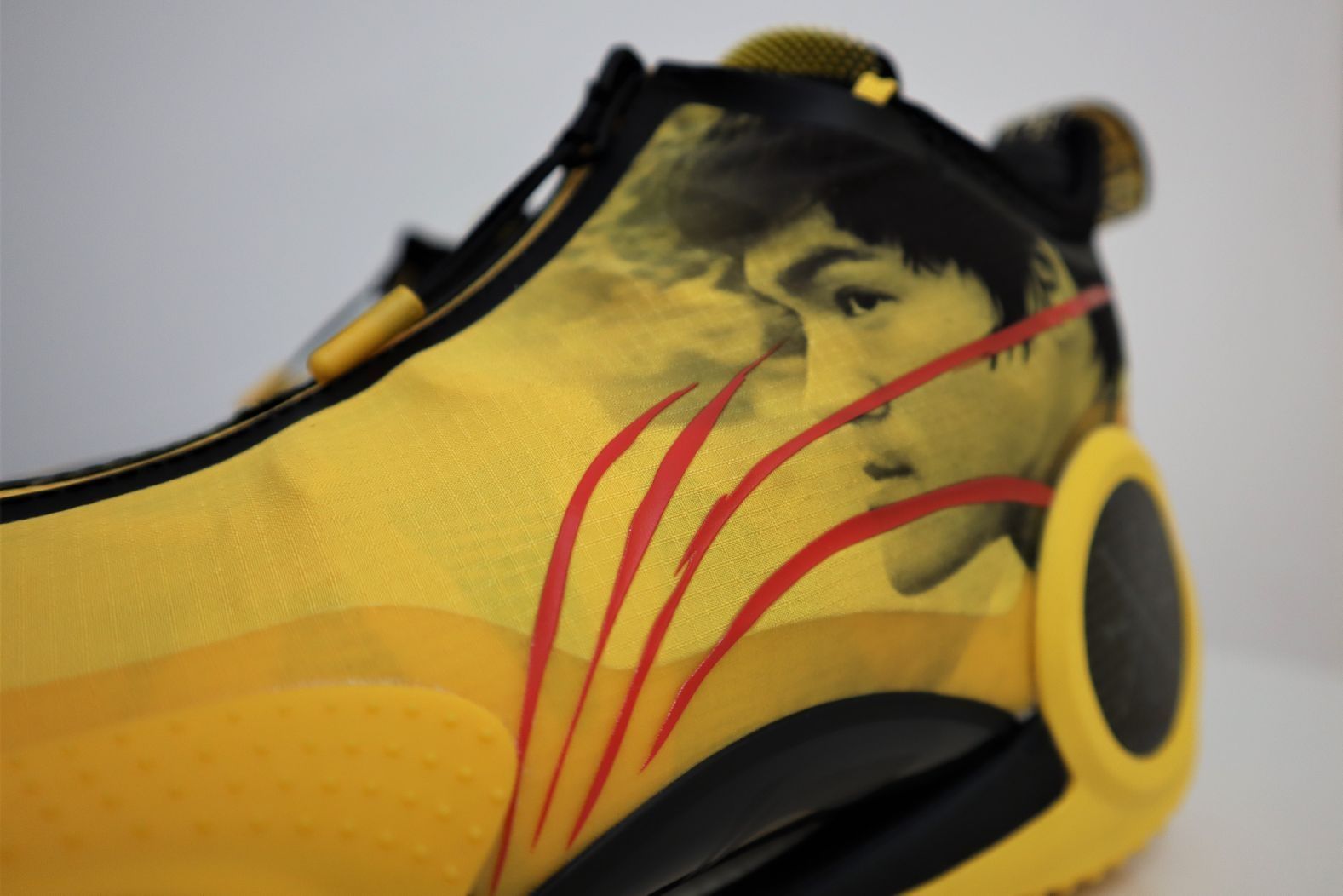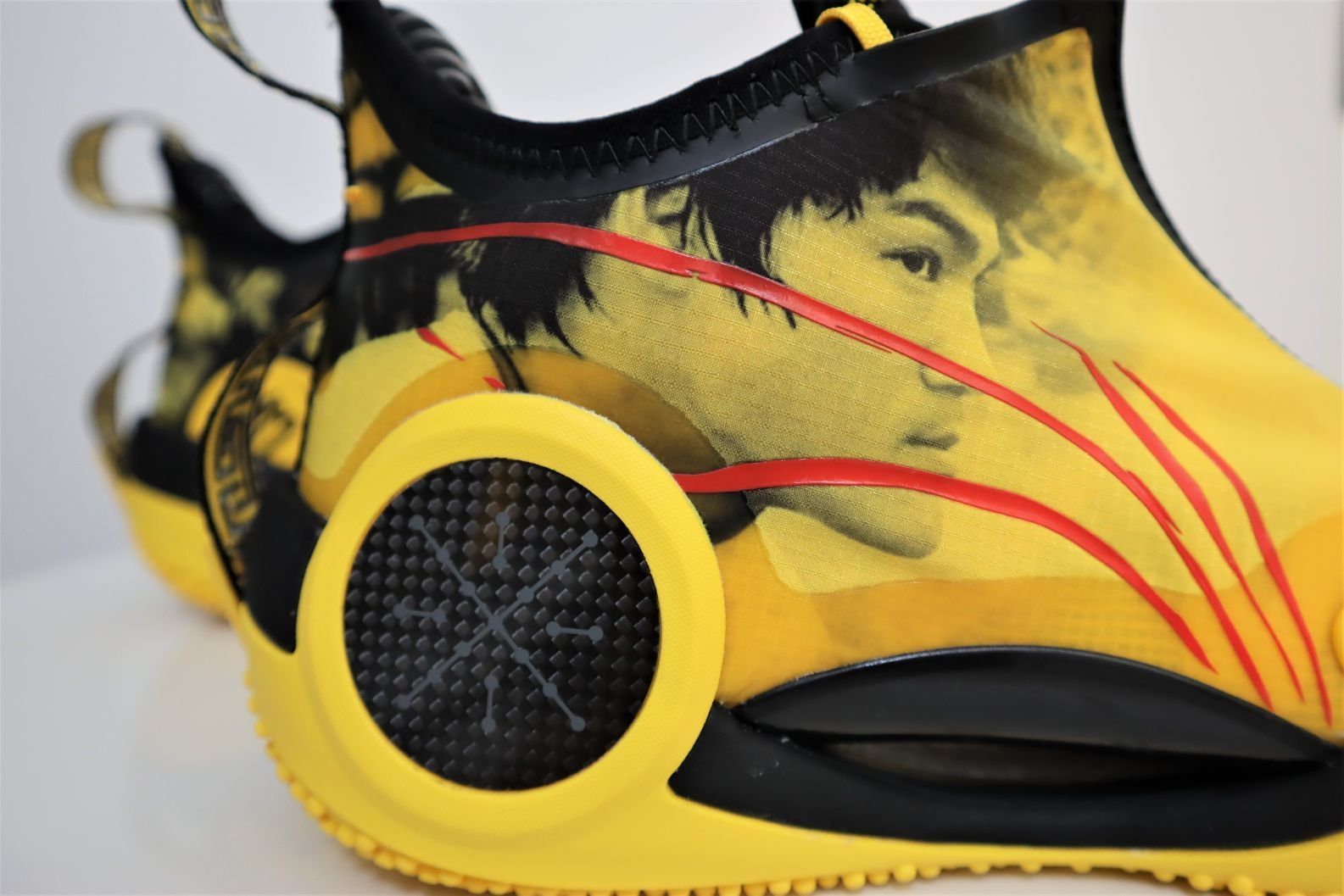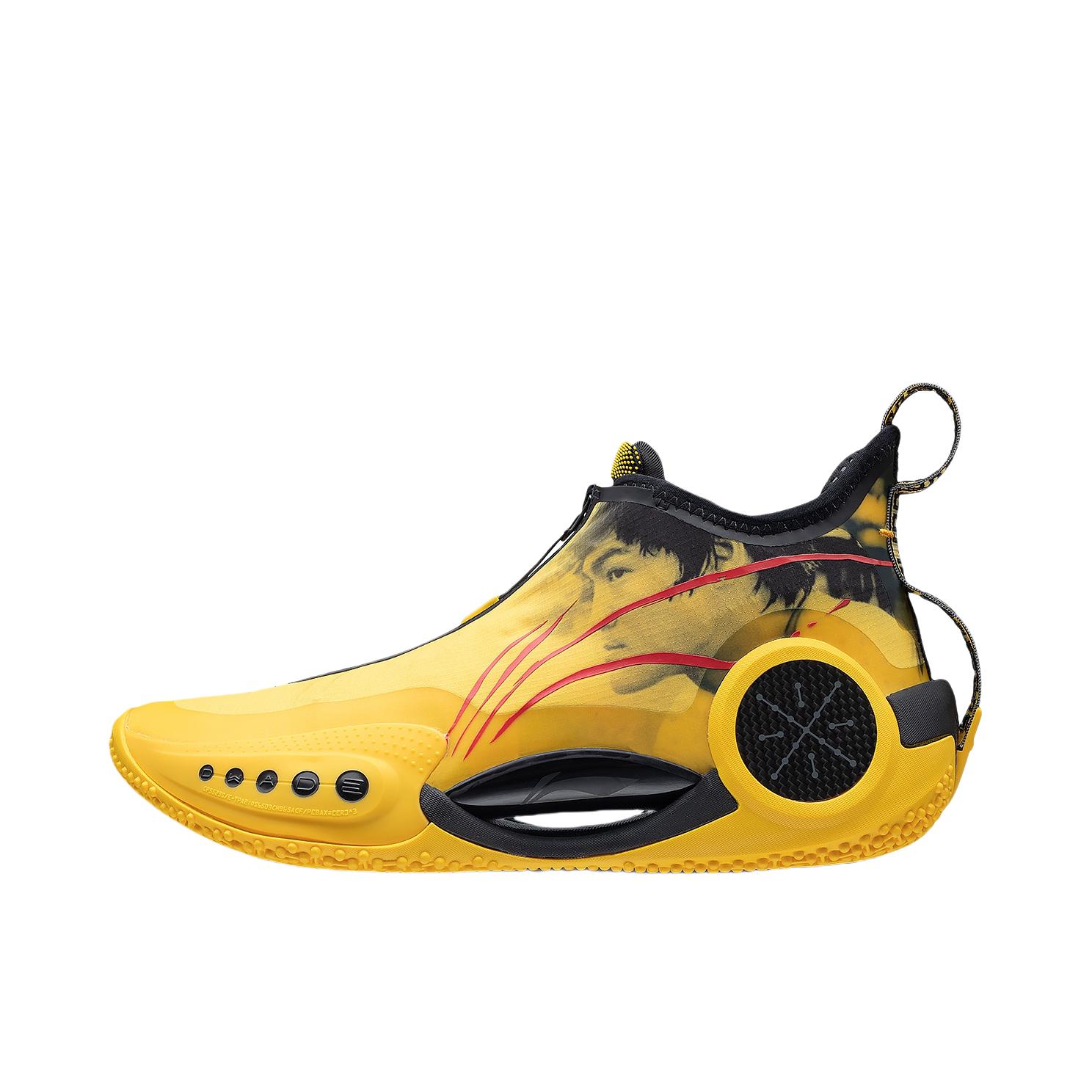 韦德之道9李小龙配色 ①外观:韦德之道9非常具有个性的外观设计,加上李小龙配色加持,非常的帅气。鞋面上是李小龙先生的肖像,鞋舌上大写的“龍”字彰显配色主题,血痕的李宁LOGO设计堪称点睛之笔,谁能拒绝一双这么帅气的黑黄配色战靴呢? ②配置:全掌䨻科技加上超大异性碳板加持,中底的回弹反馈十分澎湃。内靴的设计提供出色的包裹性,如果是瘦脚能拉上拉链,包裹性会非常极致。前掌外侧TPU和后跟外侧碳板,以及内...
