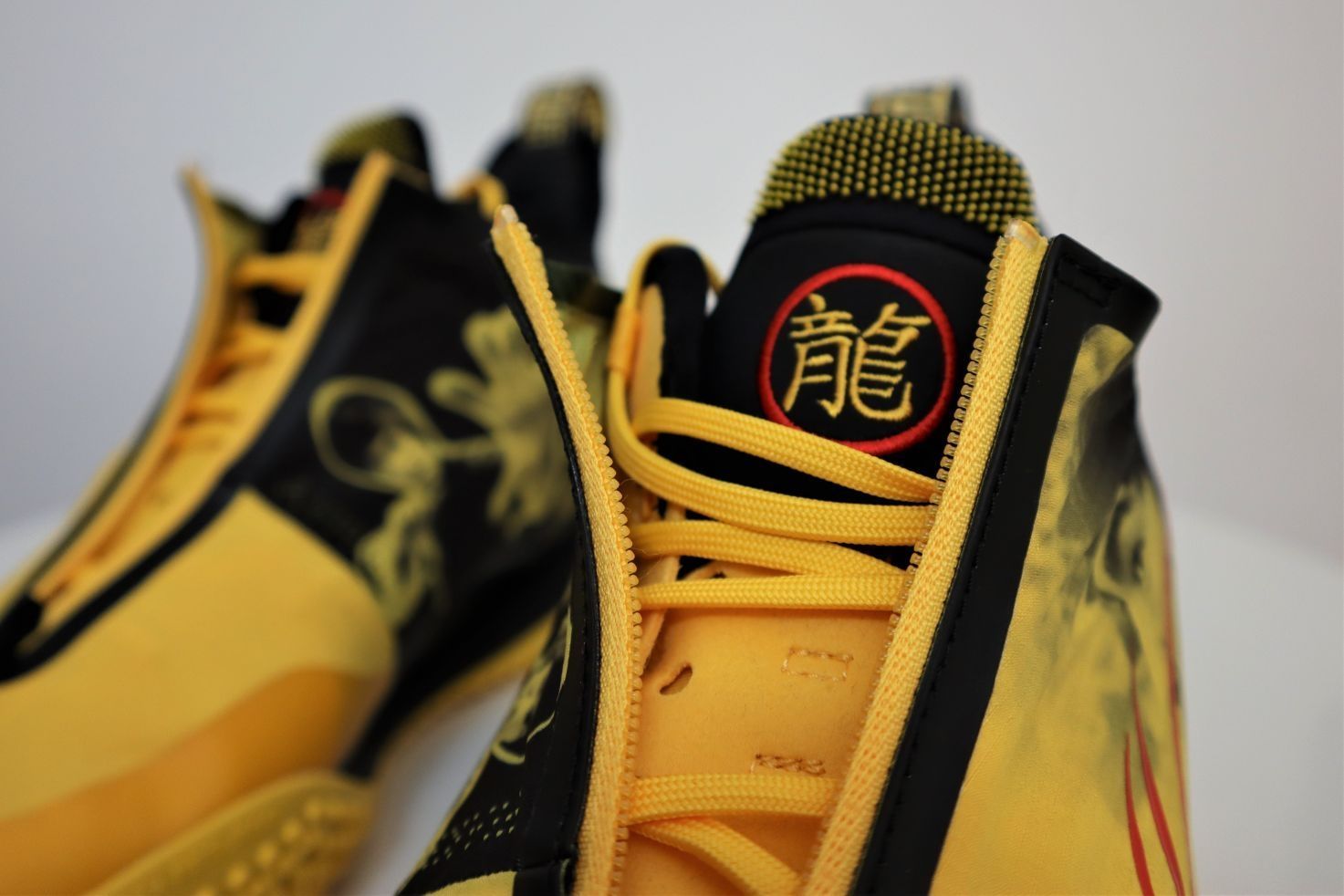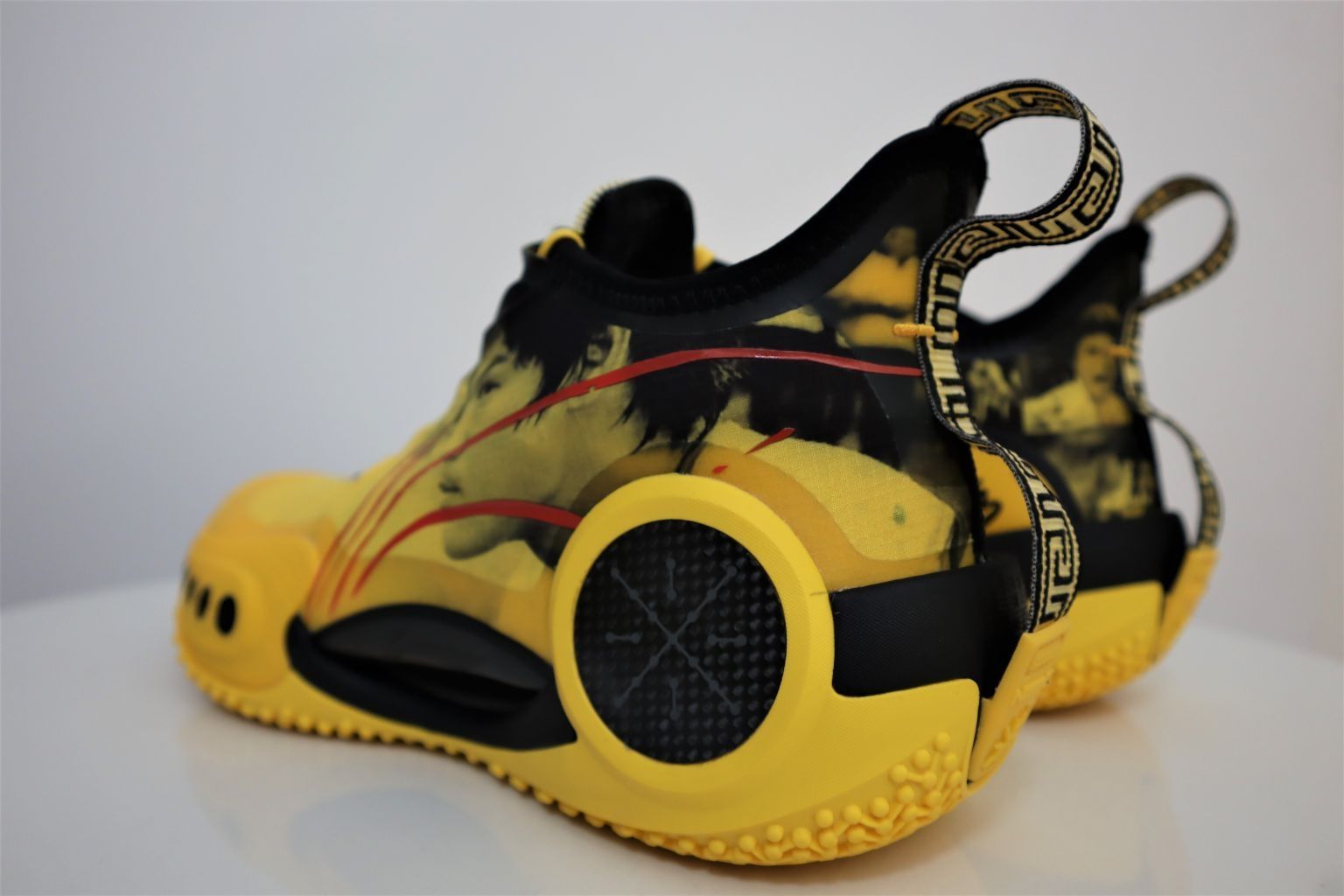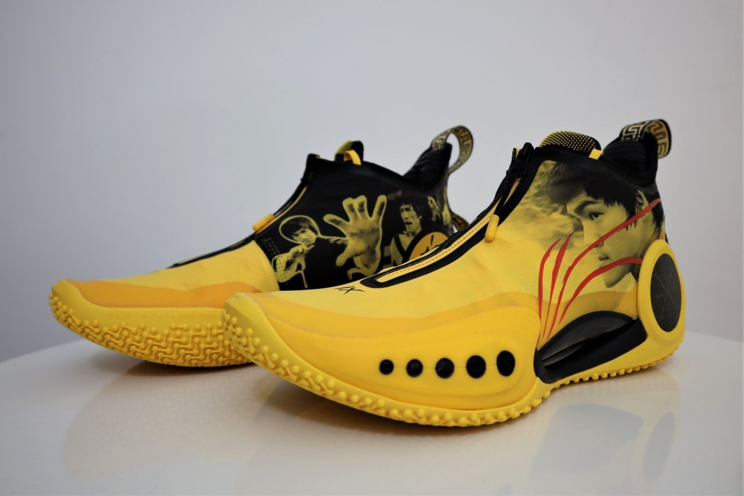 韦德之道9李小龙配色 ①外观:韦德之道9非常具有个性的外观设计,加上李小龙配色加持,非常的帅气。鞋面上是李小龙先生的肖像,鞋舌上大写的“龍”字彰显配色主题,血痕的李宁LOGO设计堪称点睛之笔,谁能拒绝一双这么帅气的黑黄配色战靴呢? ②配置:全掌䨻科技加上超大异性碳板加持,中底的回弹反馈十分澎湃。内靴的设计提供出色的包裹性,如果是瘦脚能拉上拉链,包裹性会非常极致。前掌外侧TPU和后跟外侧碳板,以及内...