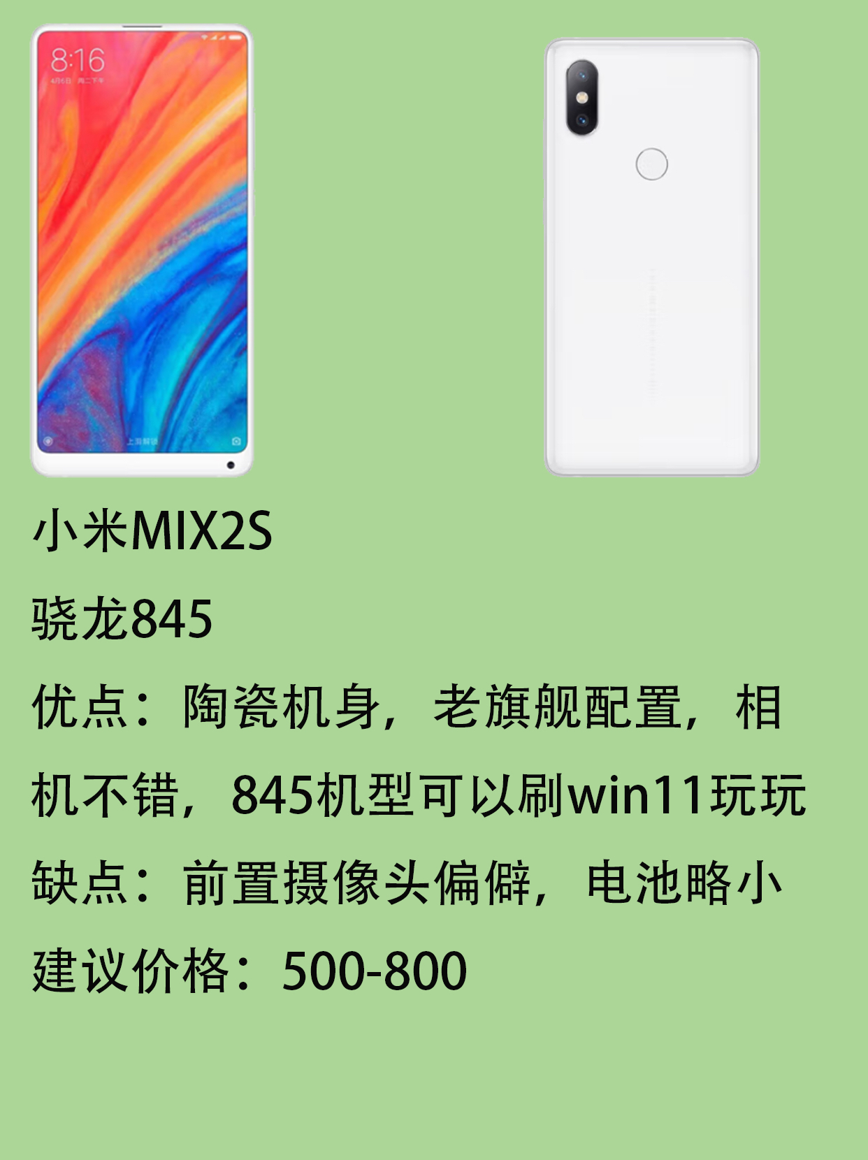 首先得明白什么是备用机?不要拿主力机型的配置去和备用机型比,电池容量当然可以的话是大点更好。我给的建议是备用机买老旗舰机,中端机型可以喜欢就买。不论是给父母买还是自己用 我的建议是老款旗舰比较好 这里边推荐的都是过去几年的一些旗舰机型,性能日常使用没问题,这些机型当做主力用也是OK的。 📱这里我只点几个机型: 💻小米MIX2S 小米Mix系列是当年各大厂商追求全面屏第一部真正意义上的全面。因为他把...