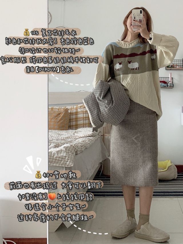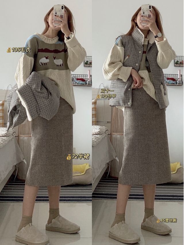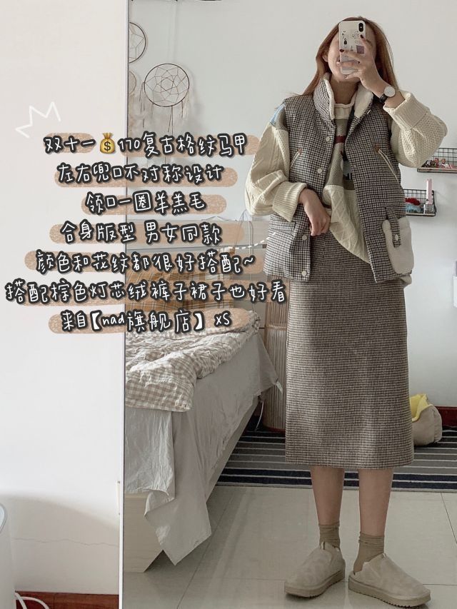 这一身我真的真喜欢,杏色复古花纹毛衣配格纹马甲格裙子,复古慵懒感满满~