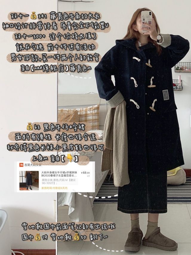 藏青色牛角扣大衣搭半裙,满满学院风~前阵子就有姐妹问我牛角扣大衣怎么搭~来啦,微胖女生不喜欢穿牛仔裤的,可以试试牛仔半裙,配雪地靴~也很可