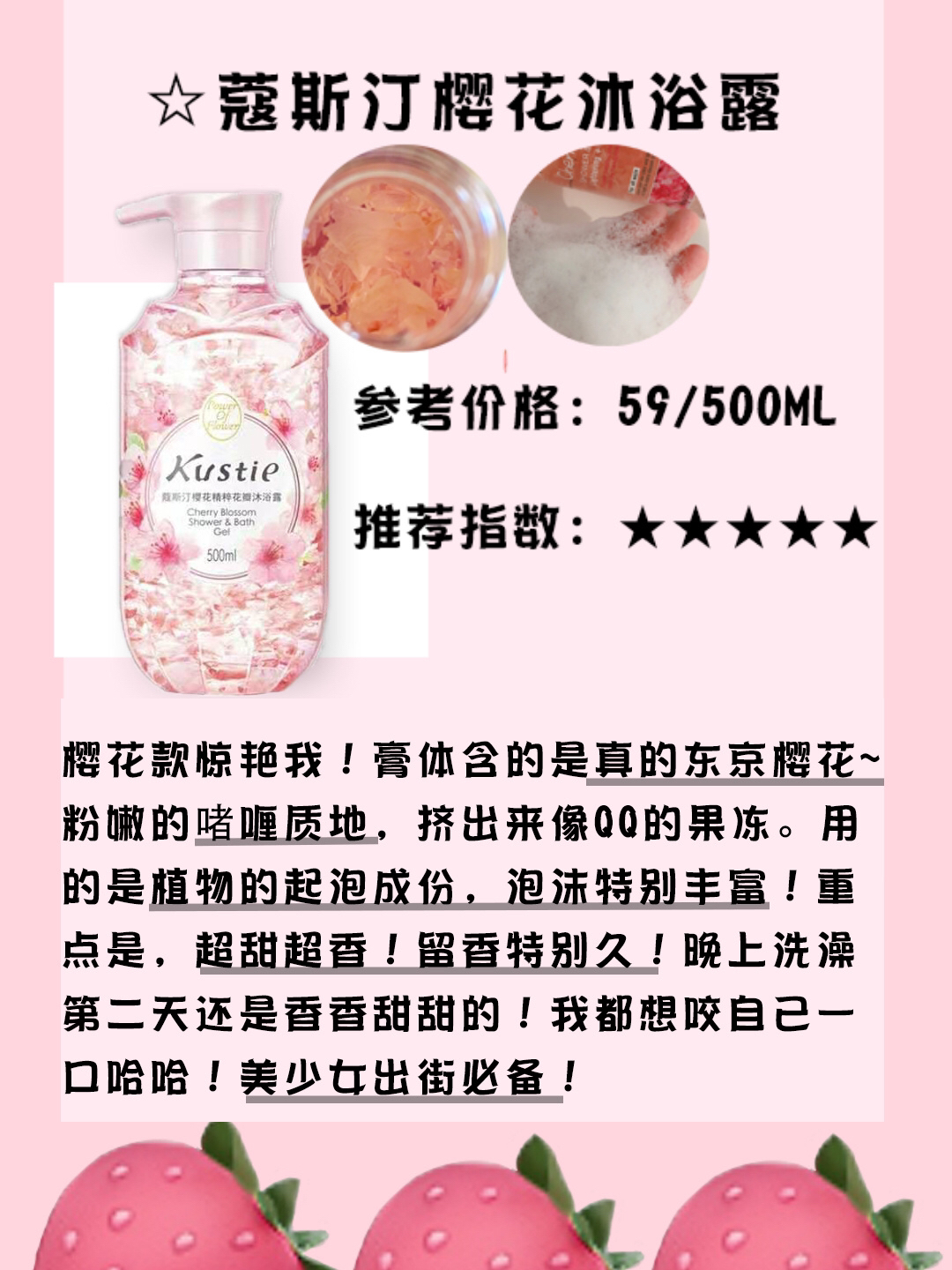 🌵蔻斯汀、植物起泡、留香持久、真花瓣、气味甜美 🎁新年新气象!该换新的沐浴露啦! 🌵拒绝踩雷,不能让我们学生党花不必要的钱,给大家测评几款便宜大碗的沐浴露。 🌵强烈推荐蔻斯汀花瓣沐浴露,约会必备用后简直是香妃本人。 ⭐️蔻斯汀樱花沐浴露 ⭐️参考价格:59 / 500 ml ⭐️推荐指数:五星 拿到手惊艳了,我买的是樱花款,绝美!!瓶身里面有很多粉粉的真花瓣。蔻斯汀是粉粉嫩嫩的啫喱质地,挤出来像Q...