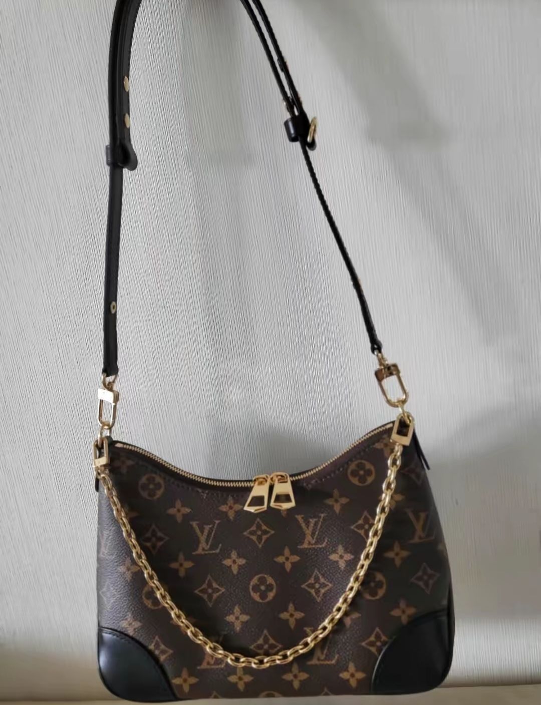本篇笔记关联了Louis Vuitton Boulogne 涂层老花帆布拼牛皮革黄牛角饰边可拆肩带链条单肩牛角包斜挎包 黑色等商品,为用户提供真实的使用体验和购买参考。
