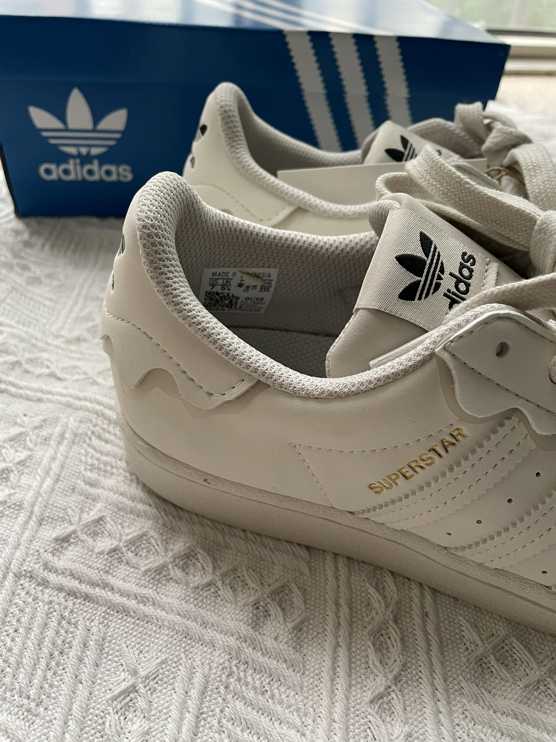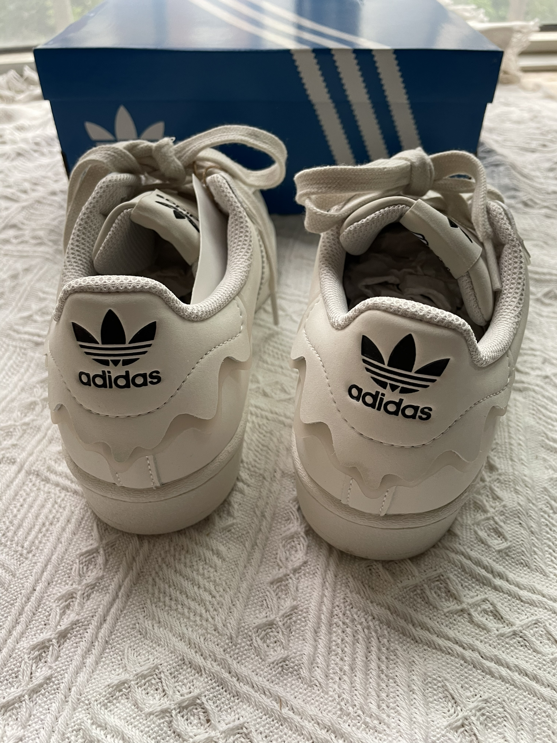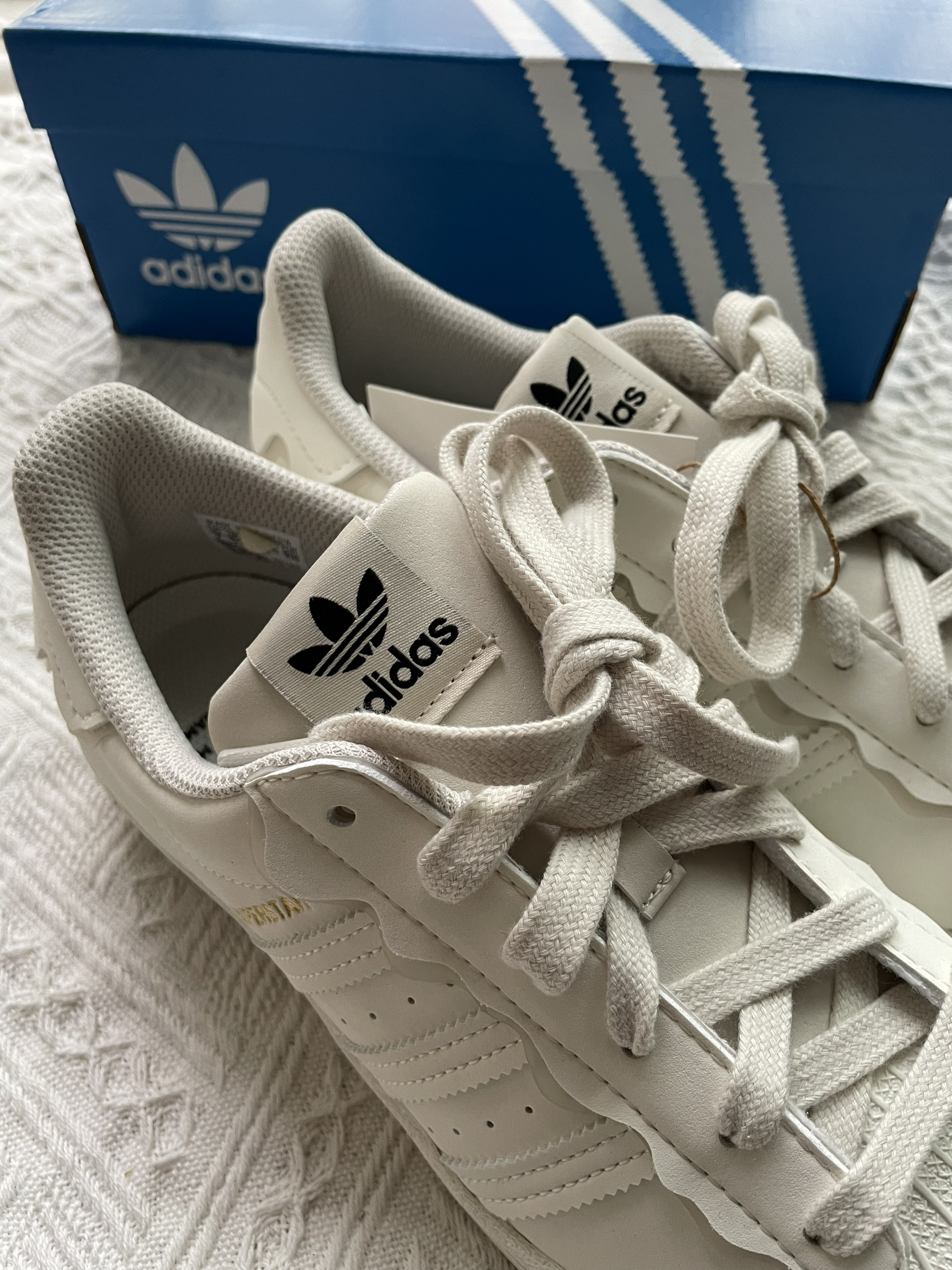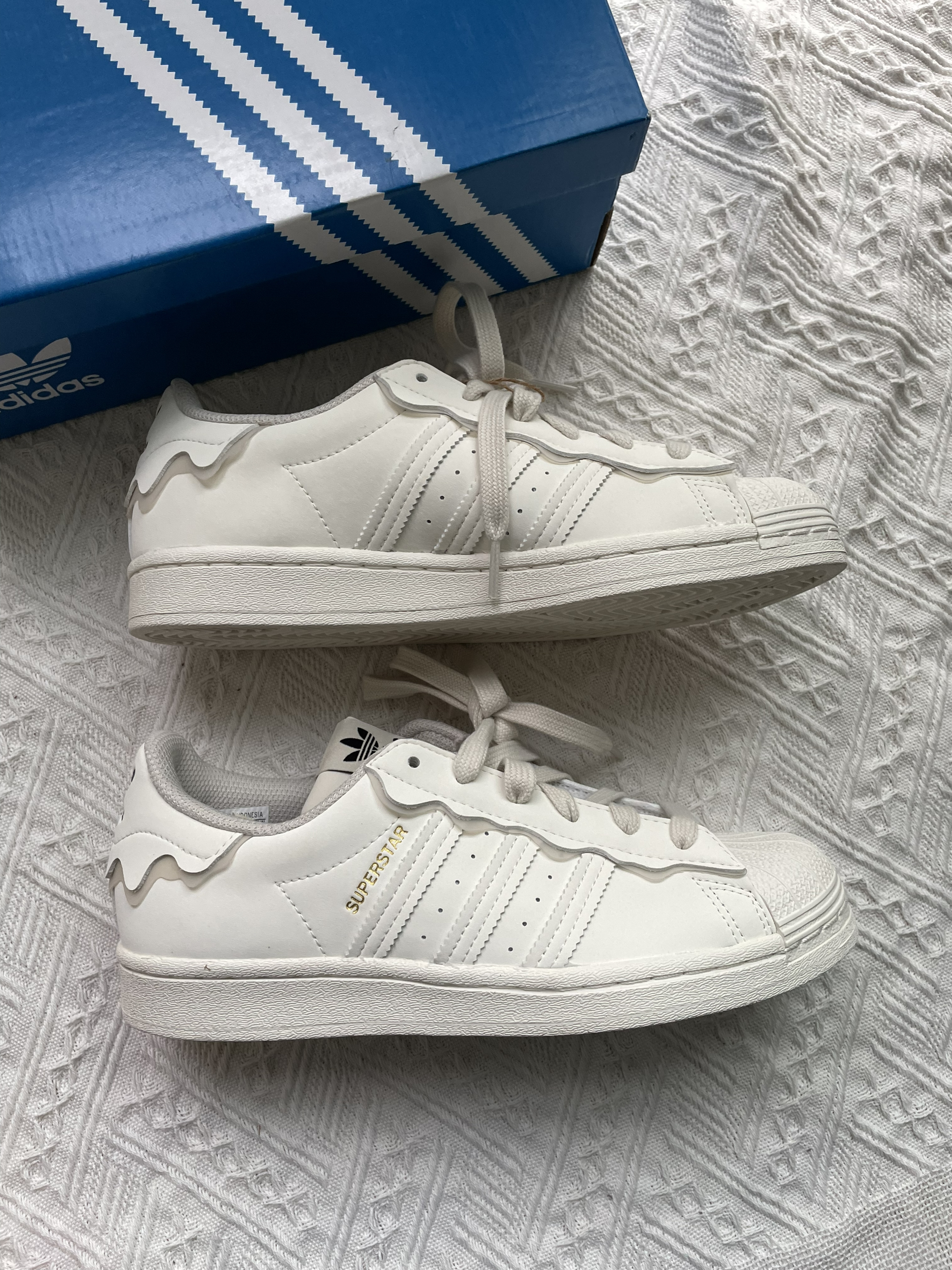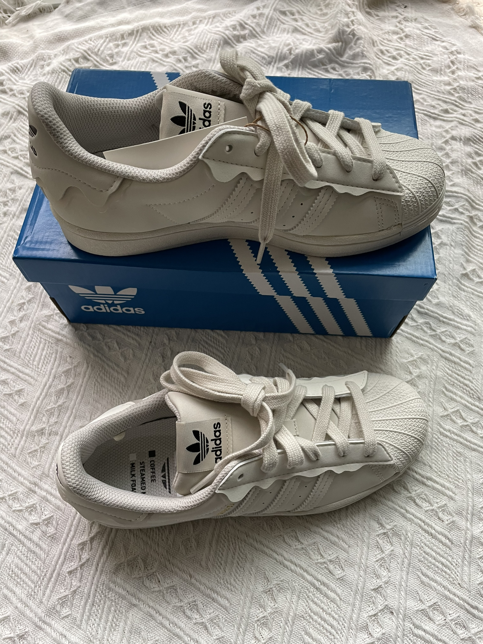 火火今日分享:adidas originals Superstar 经典休闲板鞋 女款白色 奶油 🍰 鞋子是奶油白色像是奶油蛋糕一样,鞋子一圈都有花边设计,看到都想到蛋糕 🍰 鞋身是皮革材质,侧面有冲孔设计,鞋头是经典的贝壳头,搭配花边设计别具一格,就是冲着花边来的,搭配衣服妥妥的