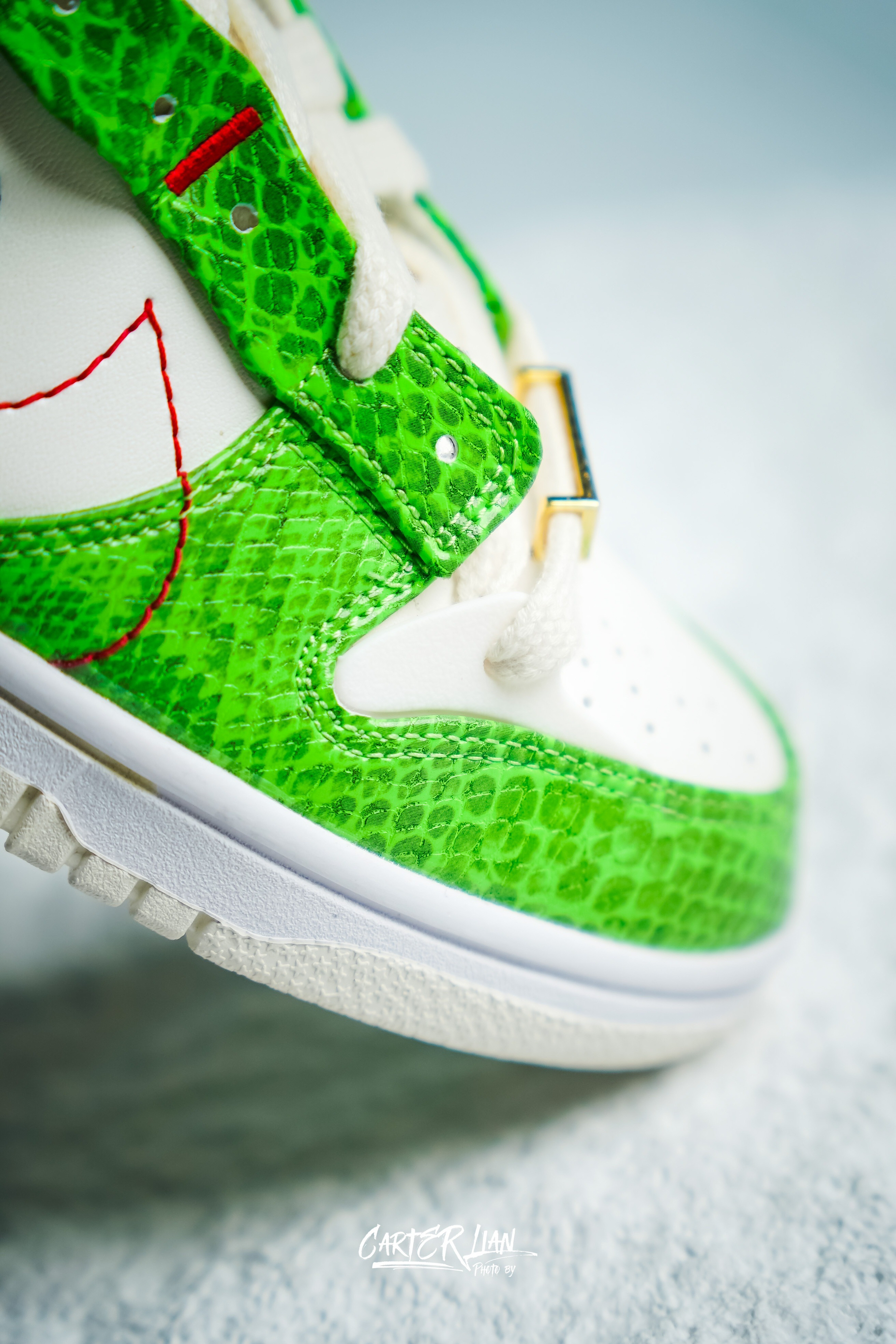 鞋款名称👟:Nike Dunk low Disrupt 2 白绿 整体细节👀:整体白绿的配色,非常小清新配色,鞋带出第一组用了不对称的设计,同时还有DUNK字样的鞋带扣装饰再上面,非常的亮眼,绿色的鞋身框架采用了蛇纹的设计侧边采用了双Swoosh设计,红色缝线沟边大大Swoosh搭配黑色的小Swooh还是非常特别的,同时鞋舌上也有黑色的Swooh来呼应。后跟上用了一块黑色的皮革材质去强化锁定...