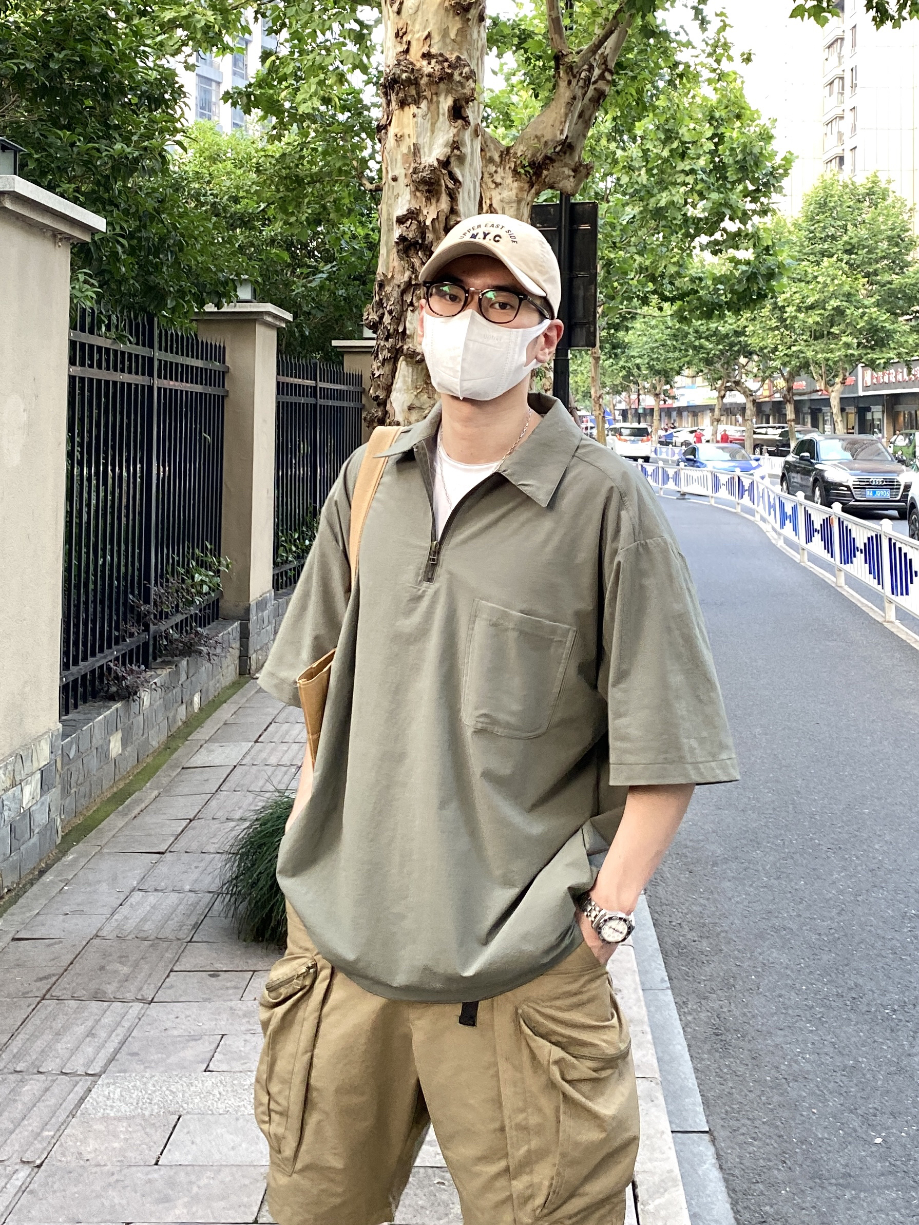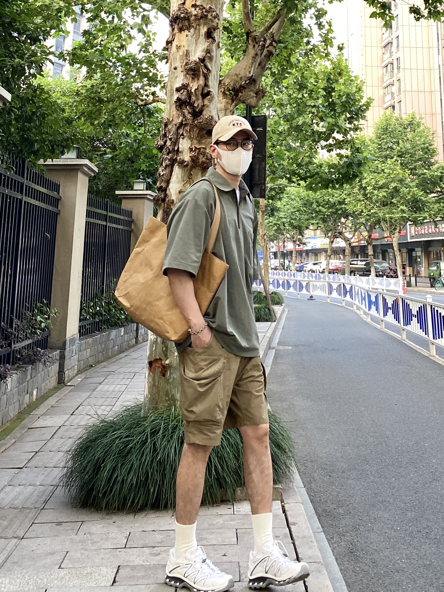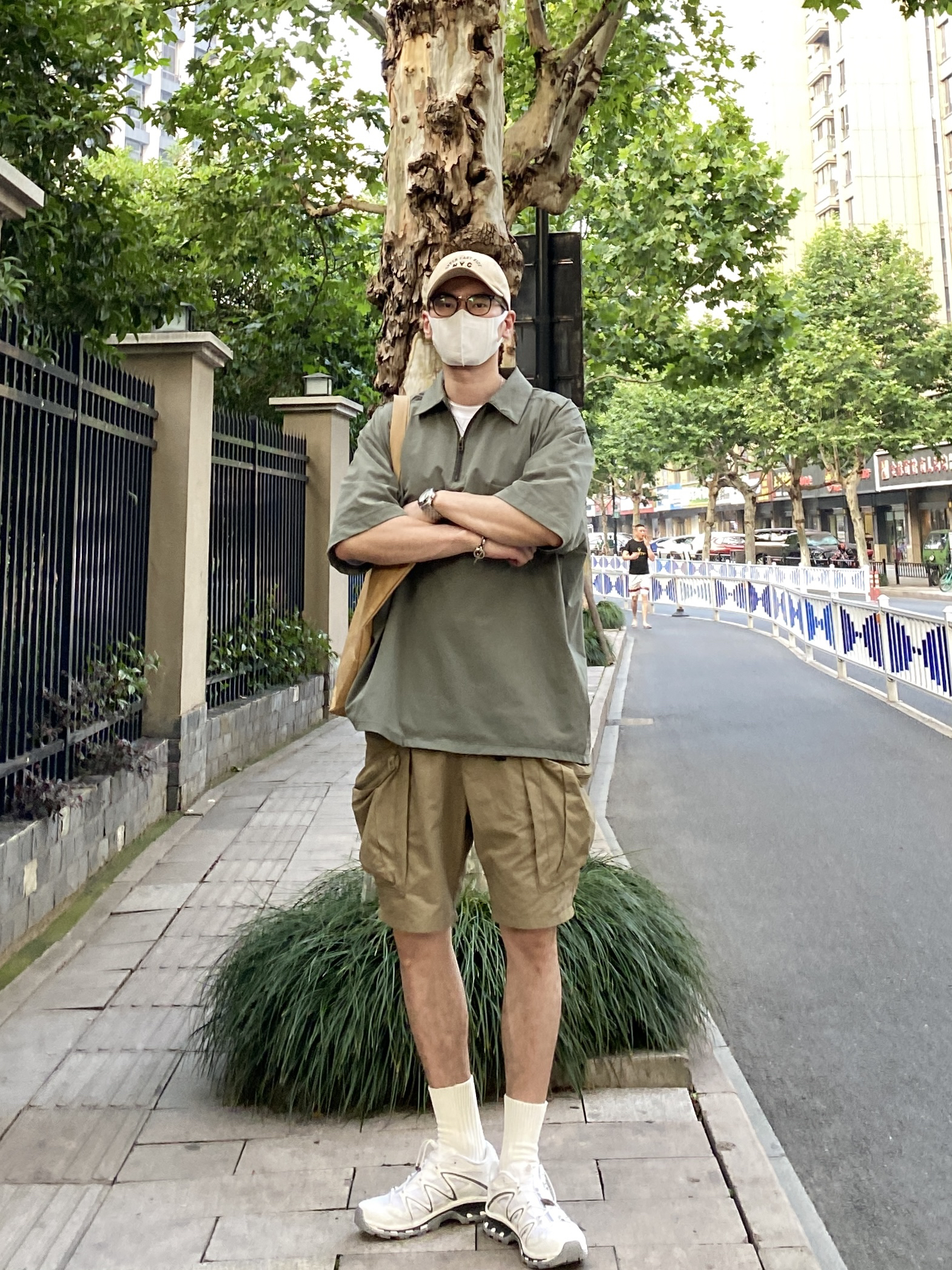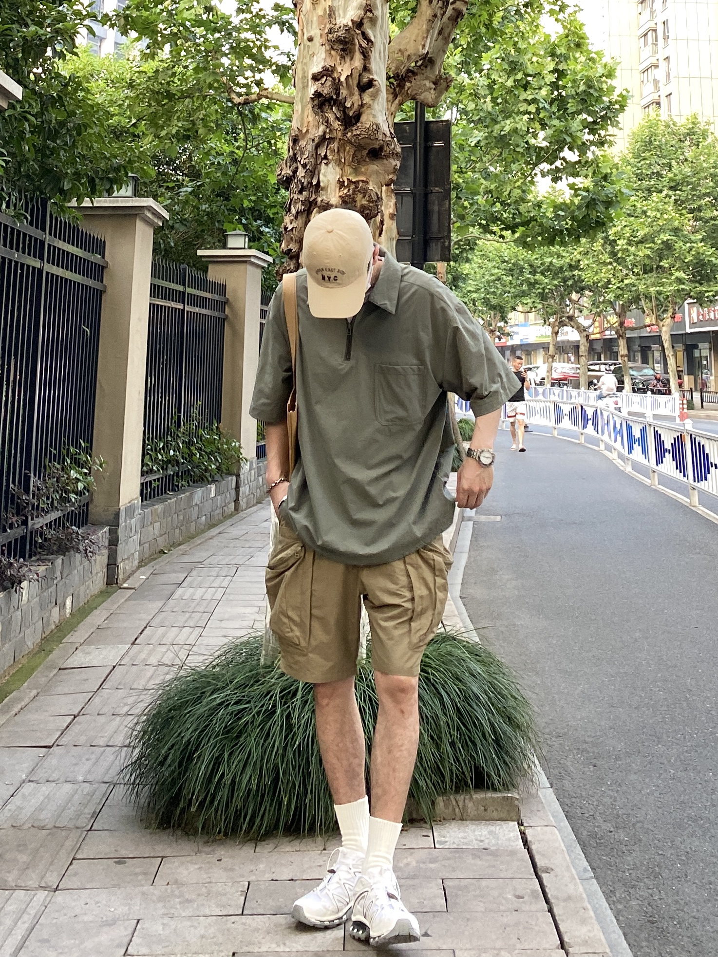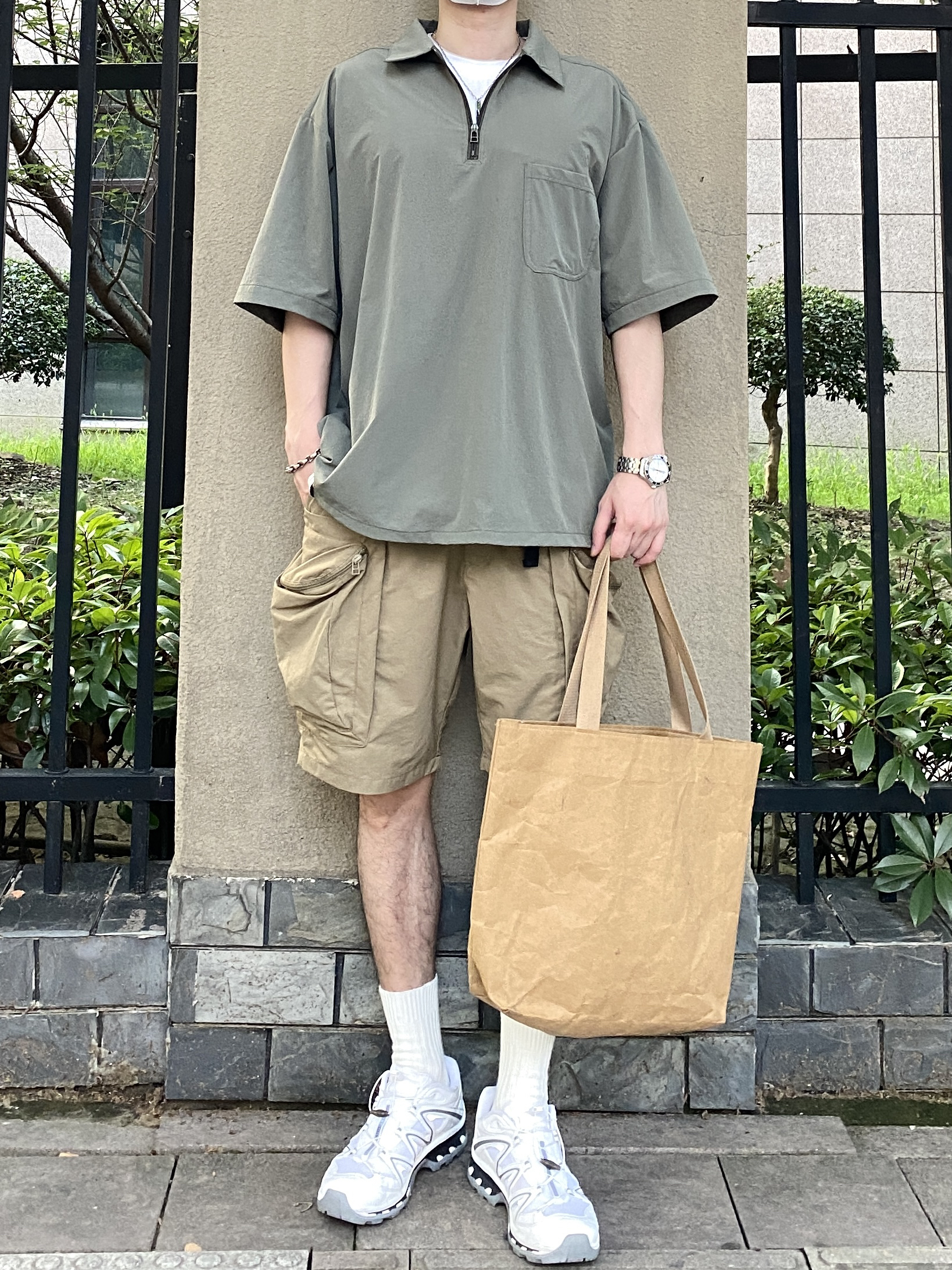今天这套先用白色圆领T做打底,裤子选择不挑腿型的大口袋户外机能短裤,鞋子上脚清爽干净的萨洛蒙跑鞋,接着套上军绿色宽松阔版半拉链工装衬衫,接着戴一顶卡其色棒球帽呼应下裤子的颜色,最后背上油蜡帆布托特包,OK,出门看看搭配效果吧! - 今日穿搭 衣服裤子都来自:NICE LILI(中间有空格) 鞋子:萨洛蒙xt-quest
