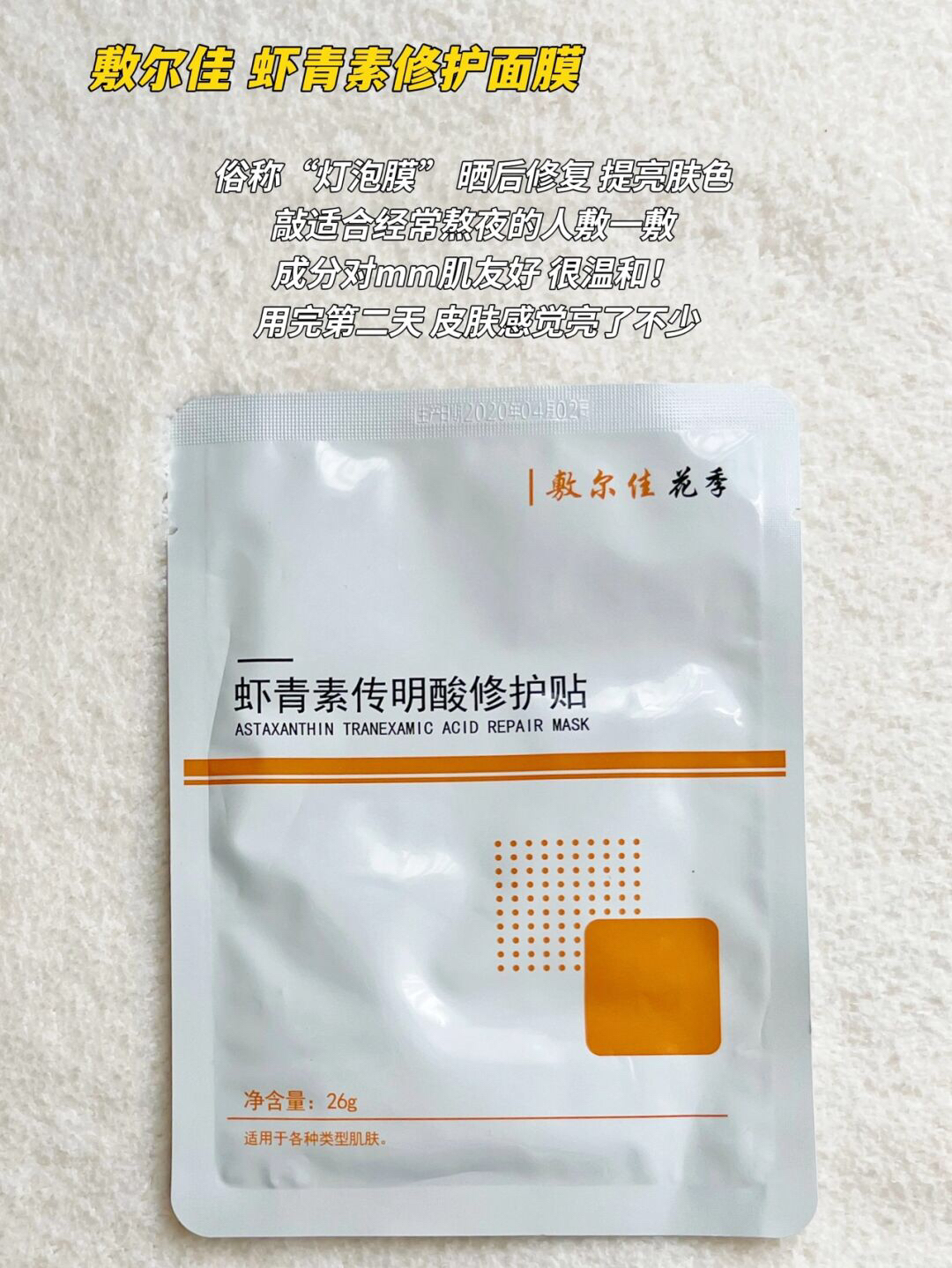 本篇笔记关联了Voolga/敷尔佳 灯泡膜虾青素传明酸修护贴 紧致弹润焕亮修护肌肤保湿补水 虾青素、润百颜 水光亮透面膜 补水弹嫩 补水保湿、润百颜 白纱布面膜 屏障调理补水保湿 屏障调理等商品,为用户提供真实的使用体验和购买参考。