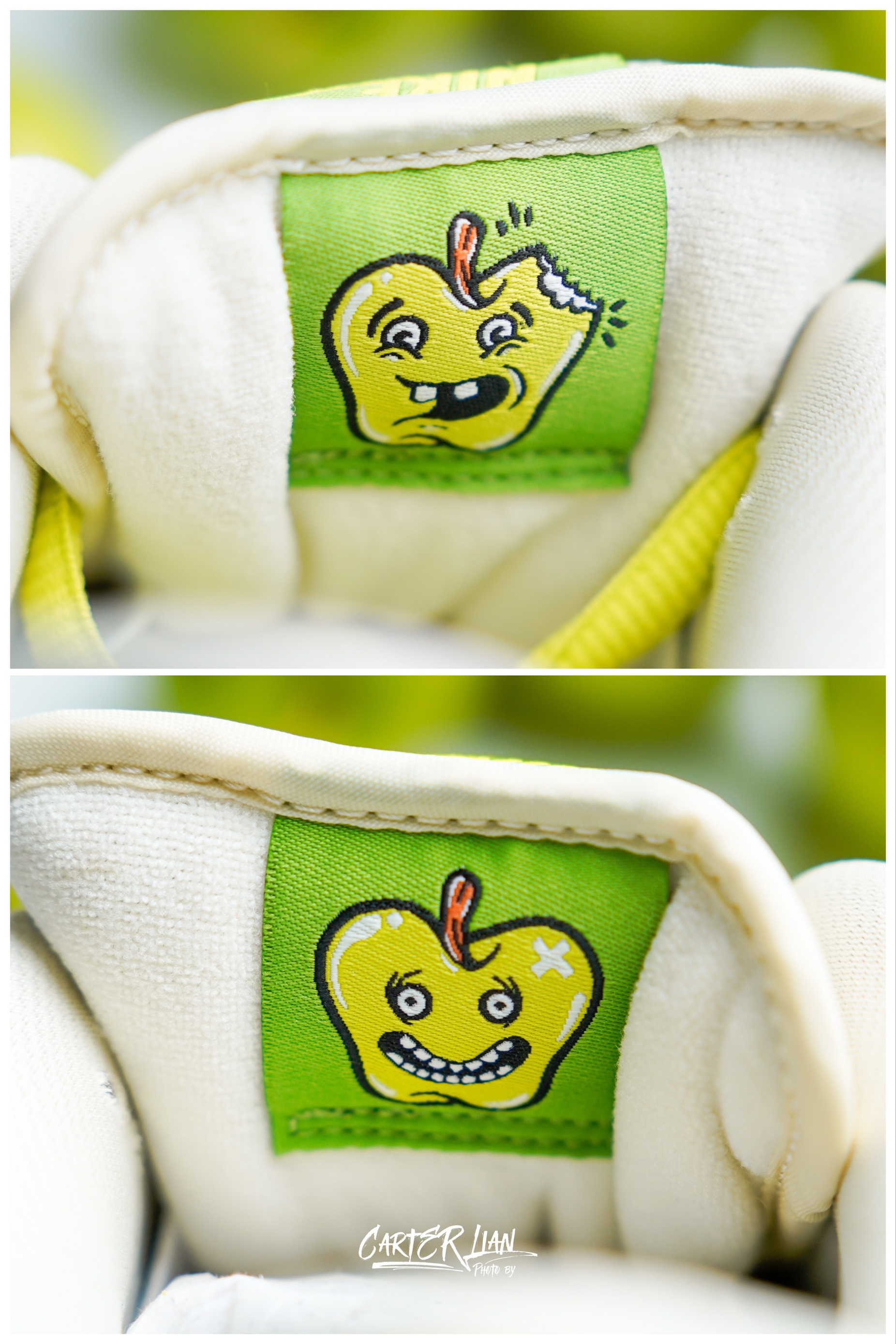 最近刚发售的水果系列Dunk,我觉得这双青苹果的SB Dunk真是近期颜值非常高的之一了。 整体细节👀:整体绿色搭配米白色,色彩上饱和度不高,而且很耐看。皮质也是非常柔软细腻的牛皮革加上翻毛皮材质。最大的细节就在鞋舌内侧两个拟人脸卡通造型的青苹果🍏很是特别。 个人感受:鞋子还是非常百搭的,颜值很高,如果喜欢这样水果系配色的SB Dunk不妨考虑下。