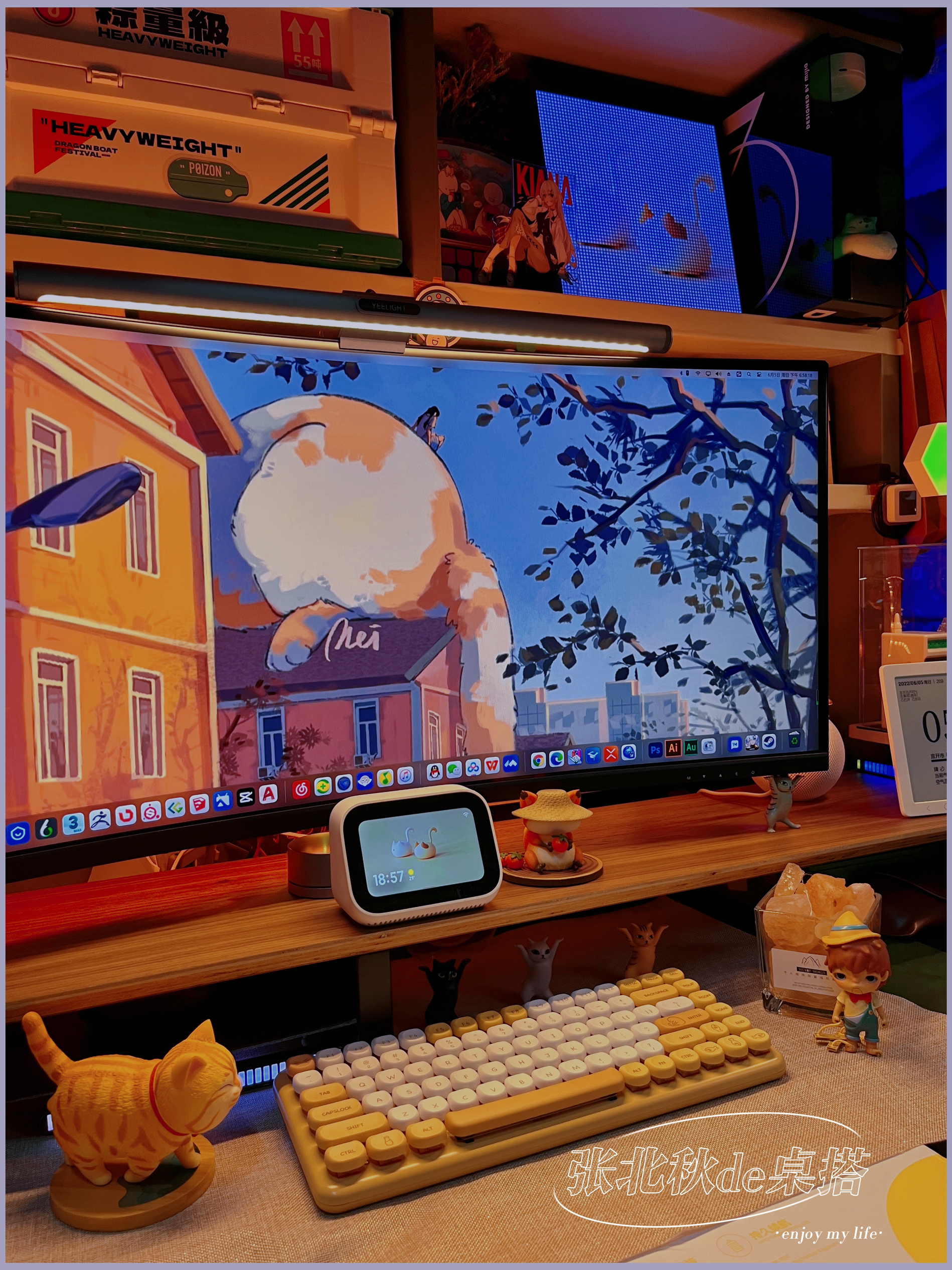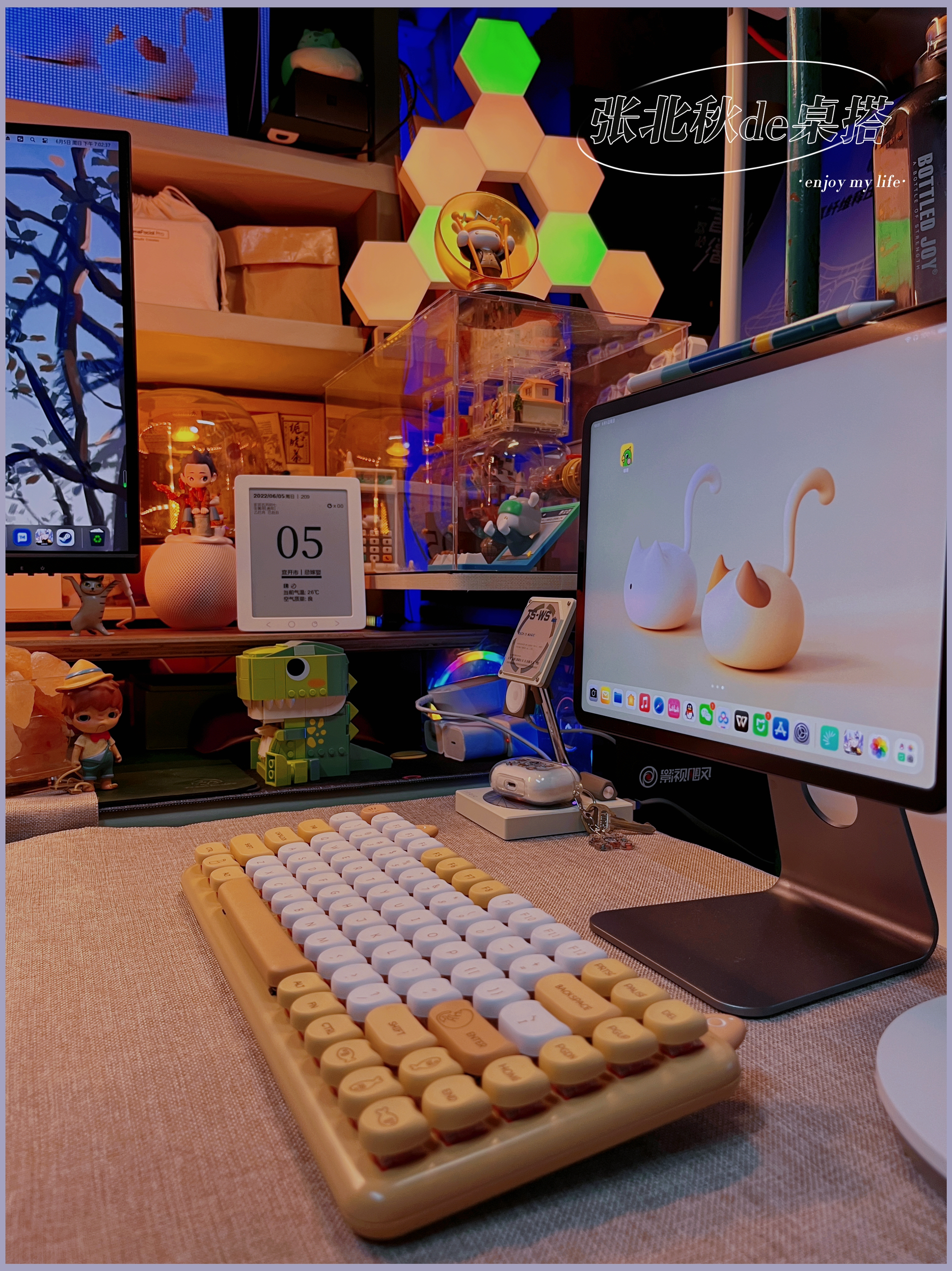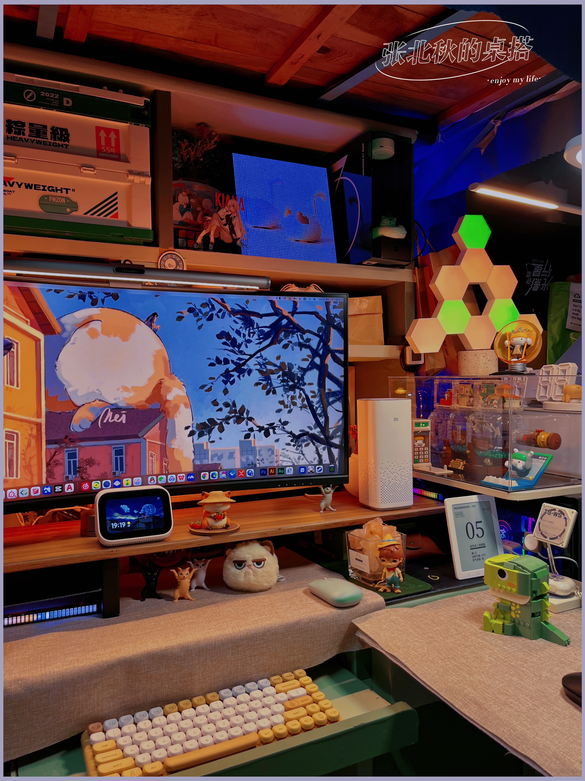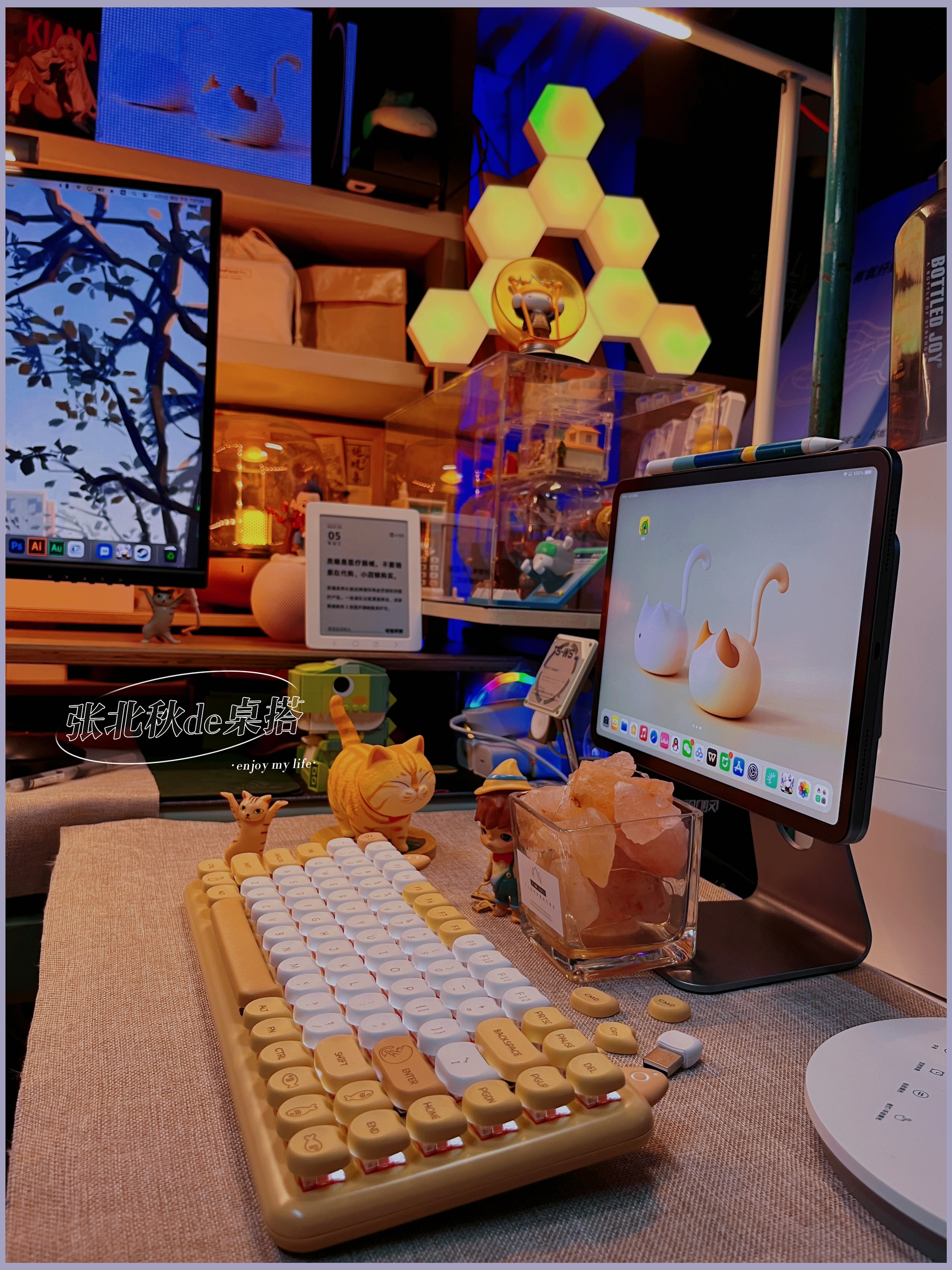 做了很久桌搭,总觉得桌子缺了点东西,仔细看了看别人的桌搭,有只可爱的修猫猫在一边趴着睡觉,我懂了!我缺一只修猫! 那说做就做,接着我就进行了对修猫咪桌面的改造,首先我需要一只橘猫,可是学校流浪猫都不愿意跟我回宿舍(绑走失败)那只能自力更生咯~ . 🏷️屏幕篇 修猫咪桌面先给我的34存的显示器换个猫猫壁纸,再给我的小爱音响和ipad以及像素画框换个桌面(壁纸原图需要的朋友留个) . 🏷️灯光篇 说到...