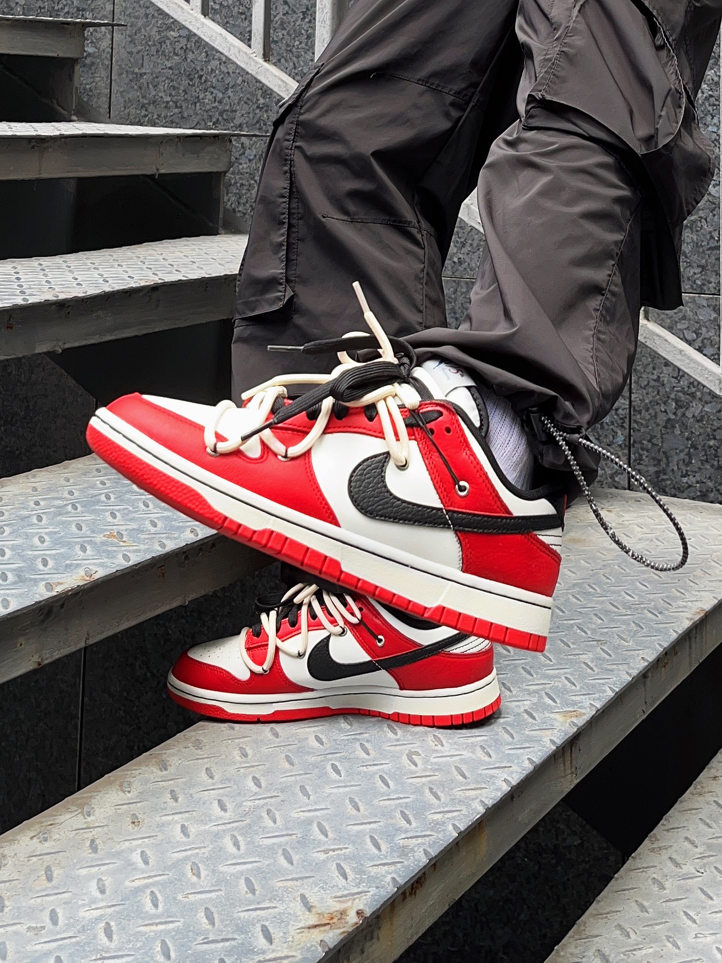 观察了这么久,被我发现这双dunk一直在原价附近徘徊,自穿性价比很高! 👟:Nike Dunk x NBA 75周年 红白配色简直就是芝加哥平替首选呀🔥 加上现在dunk热度已经下来了,街上穿的人也变多了很多。想穿dunk又不想撞鞋,就可以像我这样自己Diy一副鞋带,多了off white设计的感觉,高级感up up!