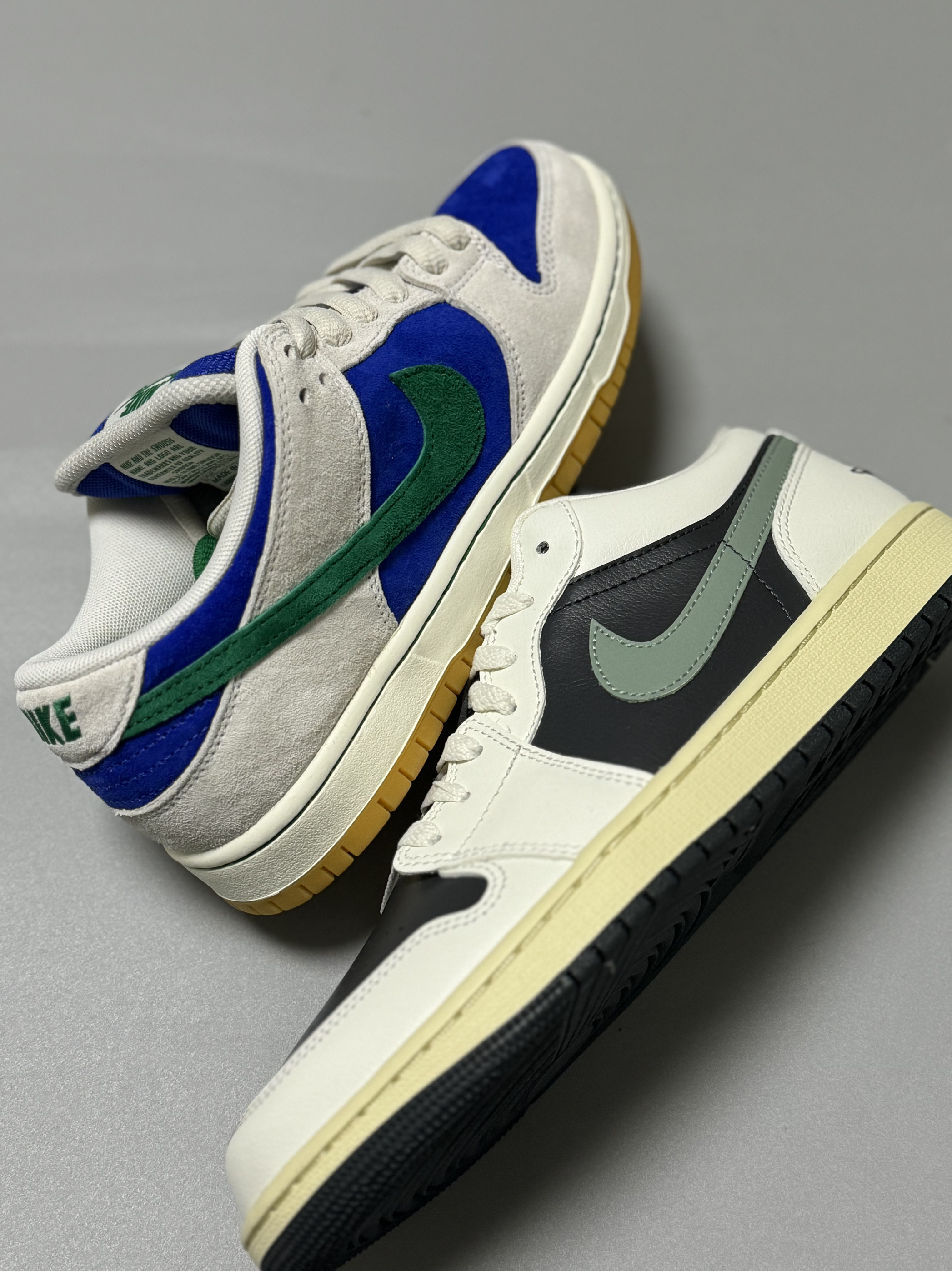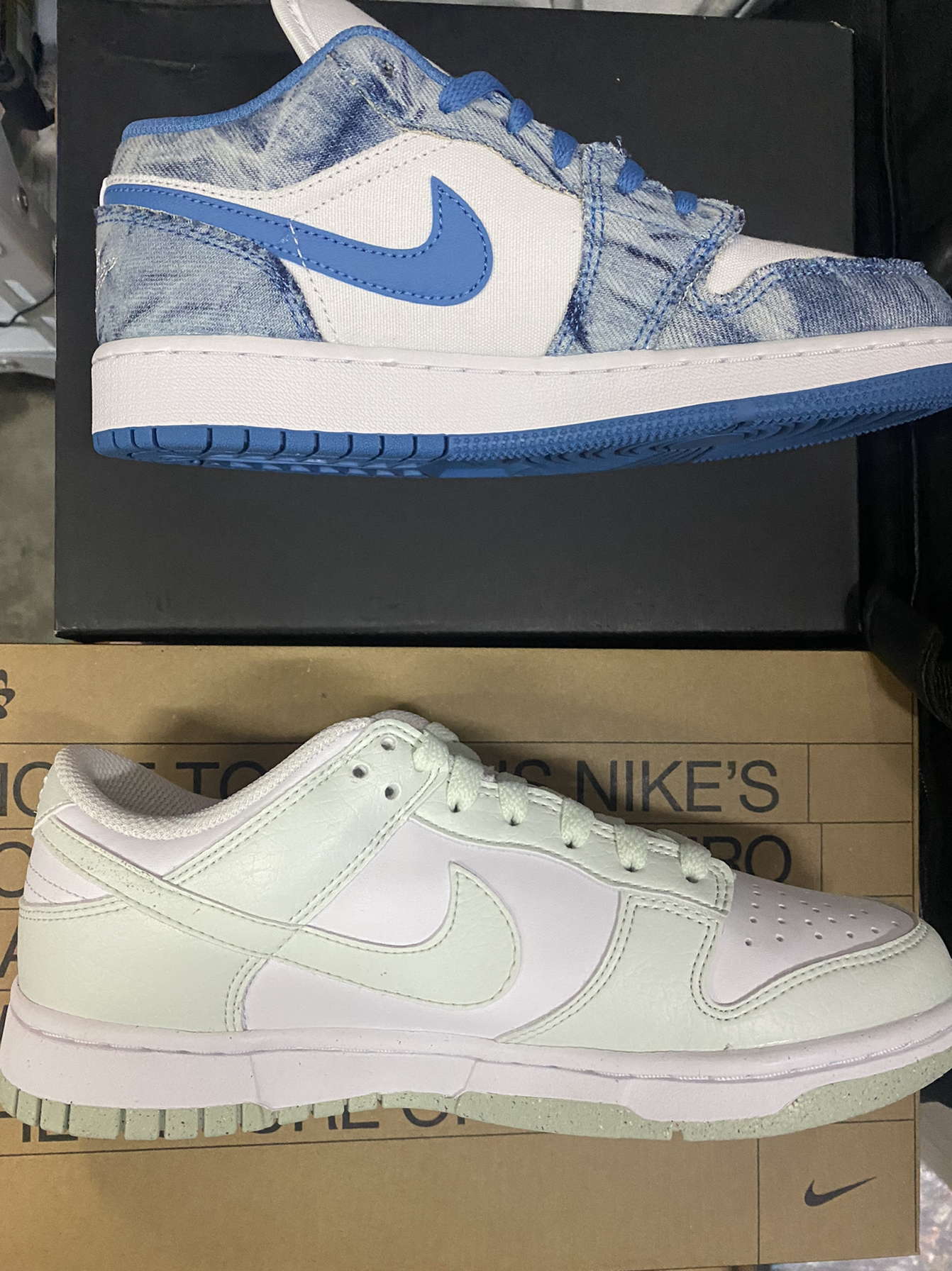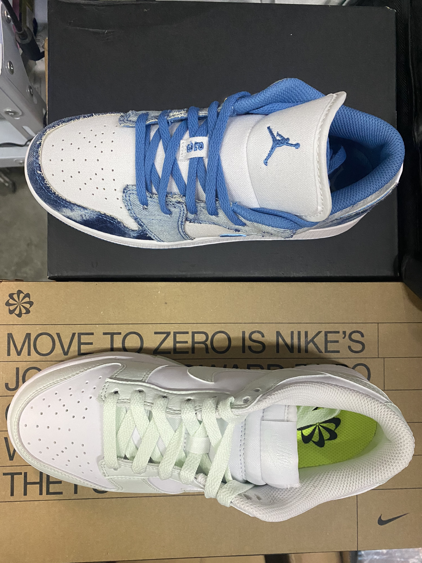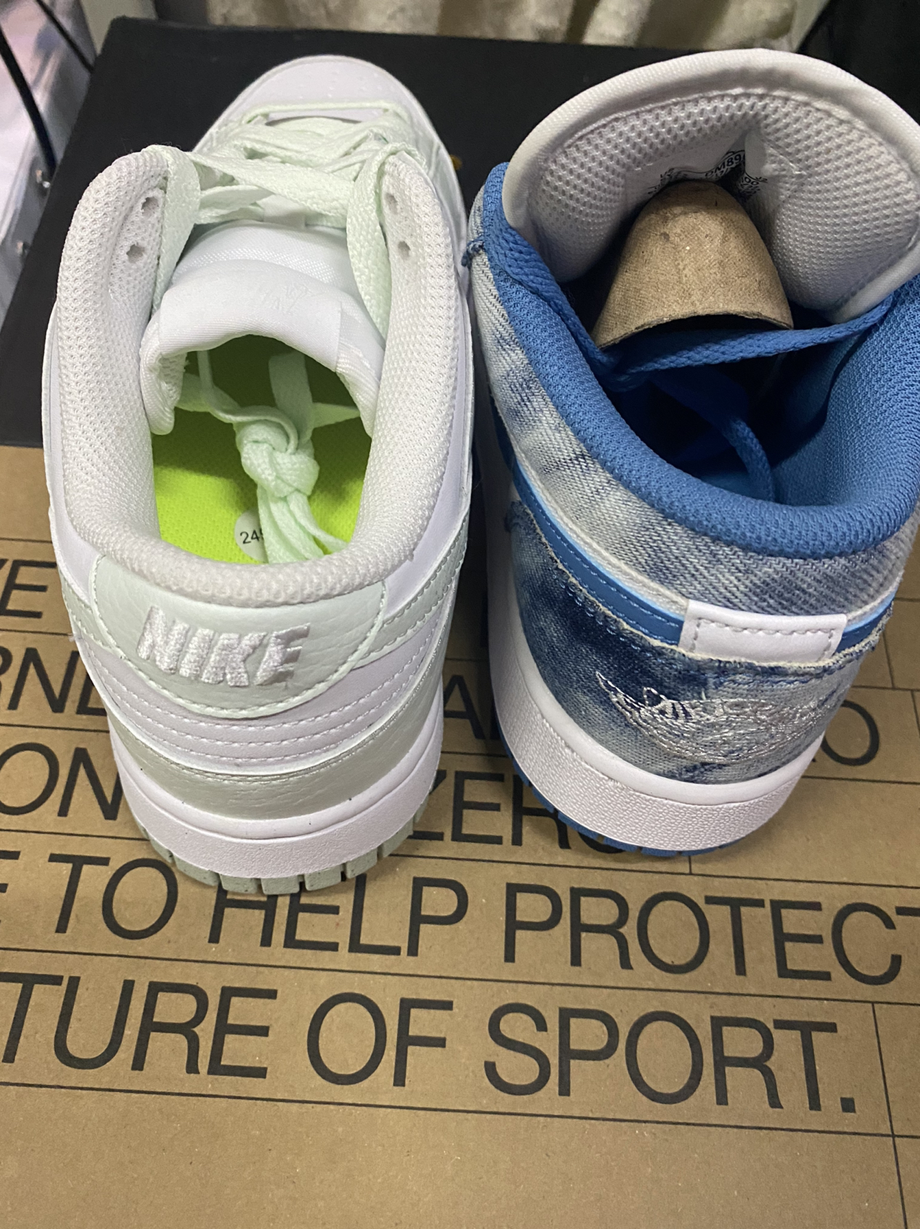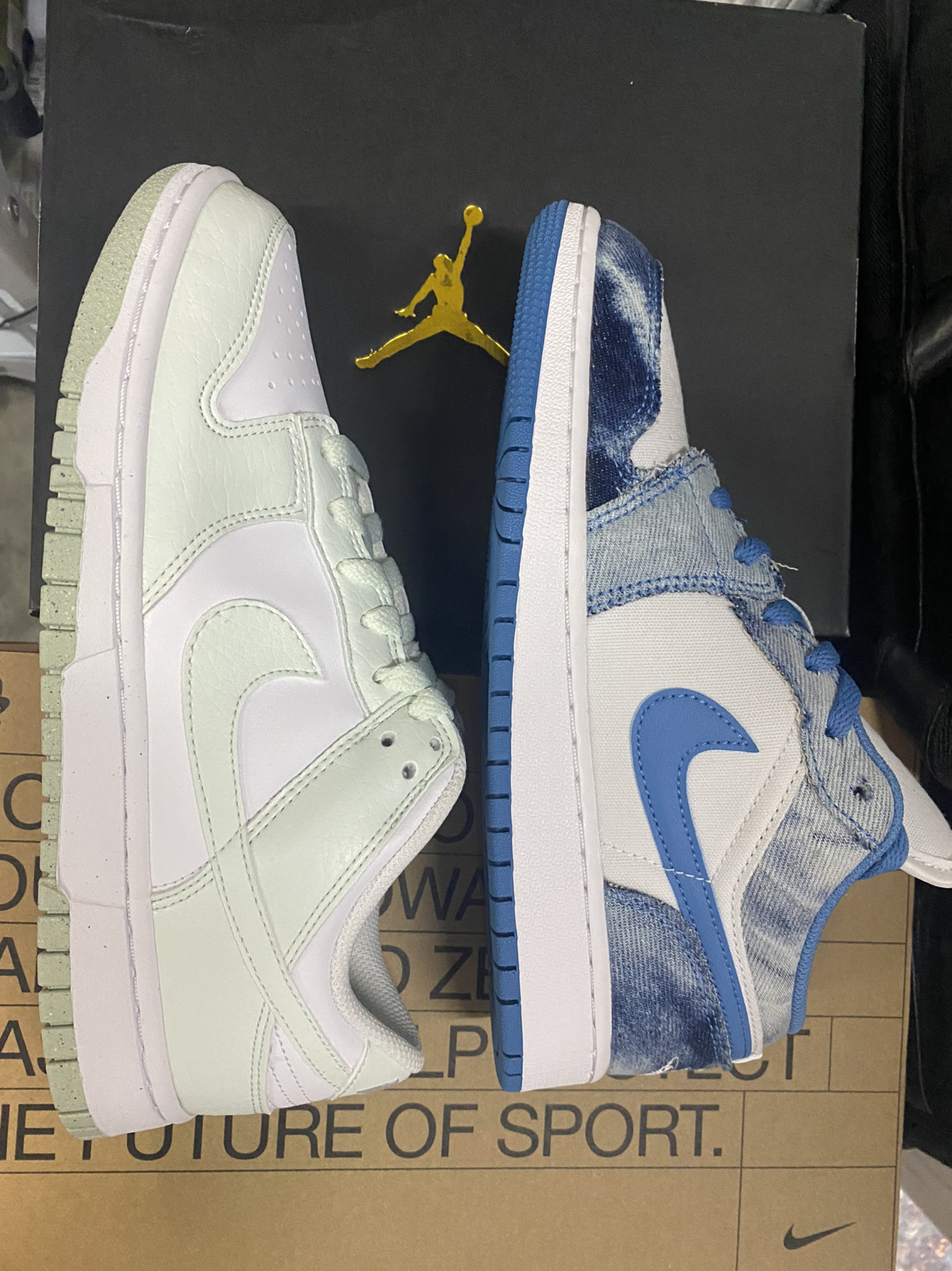 本篇笔记关联了Air Jordan 1 板鞋 运动休闲鞋 复古潮流支撑合成革 GS/低帮/白色/牛仔蓝/水洗丹宁、Nike Dunk 板鞋 经典复古百搭 女款/低帮/白色/浅绿等商品,为用户提供真实的使用体验和购买参考。