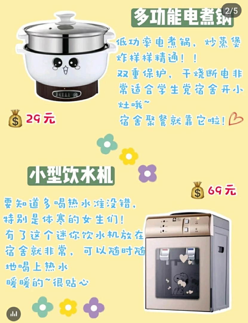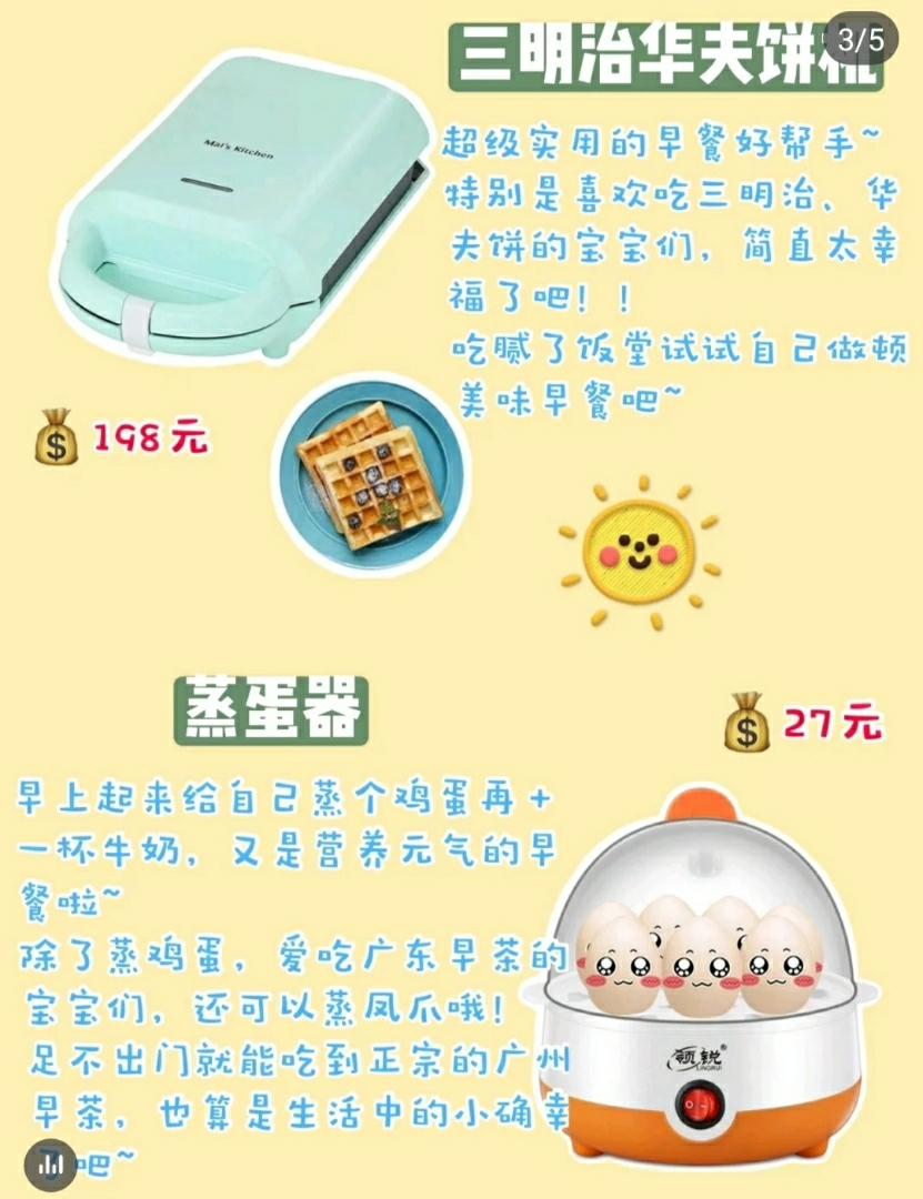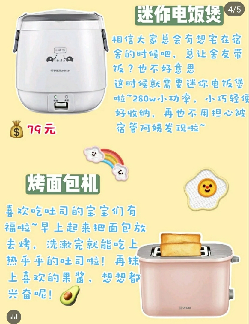 学生党宿舍篇之电器分享🌟提升生活幸福感 作为一名资深宅,宿舍可以说是我第二个家了🏠鉴于本精致girl平常也非常喜欢自己做些有的没的,于是也当然收了不少好神器啦! 🌈今天就来分享给你们啦~生活偶尔需要仪式感,试着动手给自己做份美味的晚餐吧! 大家如果使用电器的时候要尽量选择小功率的哦,📝宿舍用电安全也非常重要,希望大家都能有个舒服又方便的宿舍生活~💫