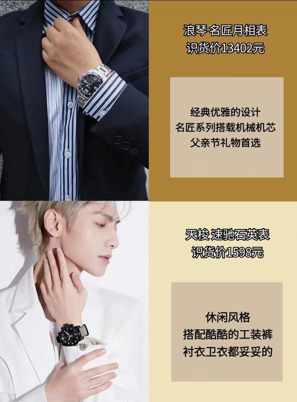 " 都别拦我,男明星同款手表分享来咯,快来抄作业!! 1.【彭于晏同款】Longines/浪琴 名匠 40mm月相表盘 自动机械休闲男表 L2.909 618识货价格:13402元 💯经典优雅的设计,名匠系列搭载机械机芯,送给父亲一个特别的节日惊喜吧! 2.【陈飞宇同款】Tissot/天梭 速驰 经典运动石英表 T116.617.11 618识货价格:1598元 💯天梭的速驰系列一向是很休闲...