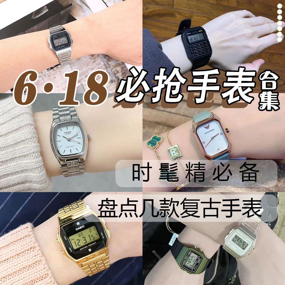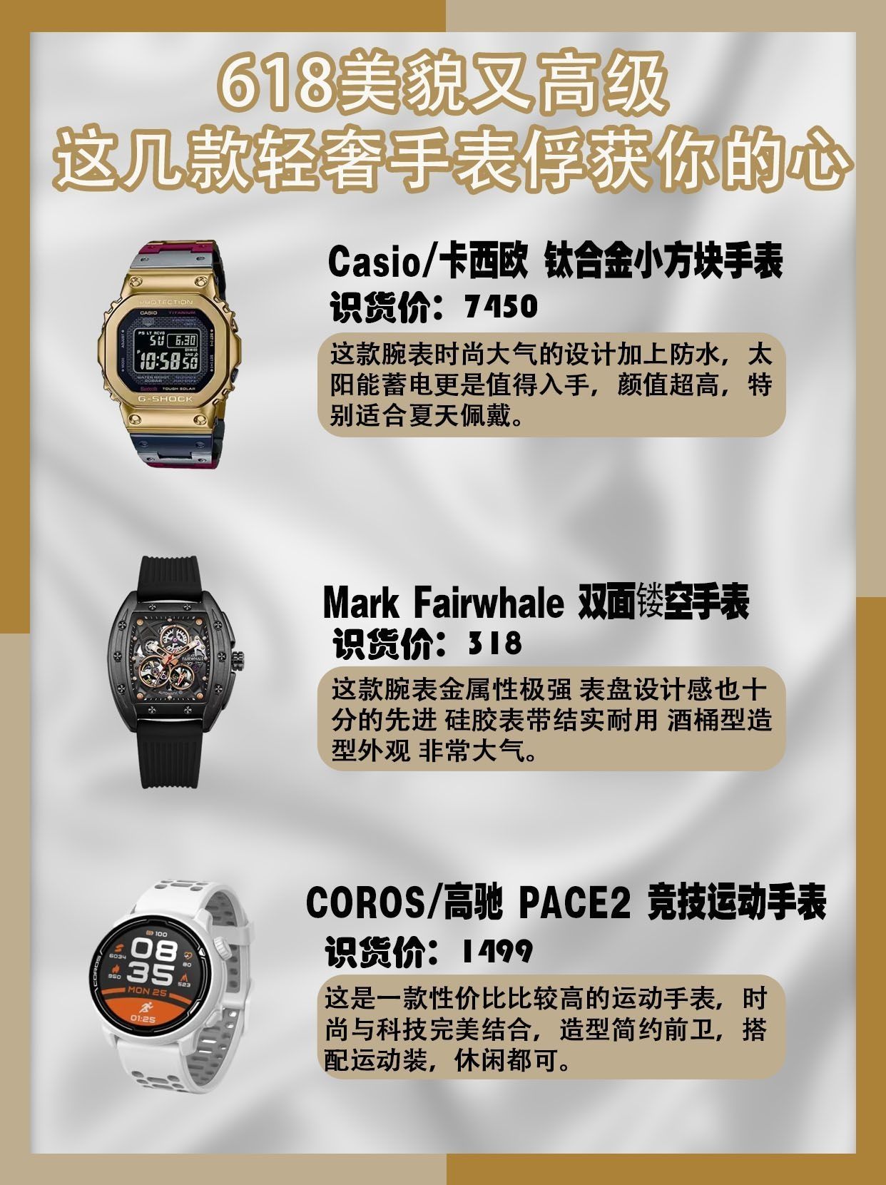 🎀Casio/卡西欧 钛合金小方块彩太阳能电波蓝牙 GMW-B5000TR 618识货价格:7450元 这款腕表时尚大气的设计加上防水,太阳能蓄电更是值得入手,颜值超高,特别适合夏天佩戴。 🎀Mark Fairwhale/马克华菲 长方形双面镂空防水自动机械男表 FW-6180 618识货价格:318元 这款腕表金属性极强 表盘设计感也十分的先进 整给表盘非常大气 硅胶表带结实耐用 酒桶型造型外...