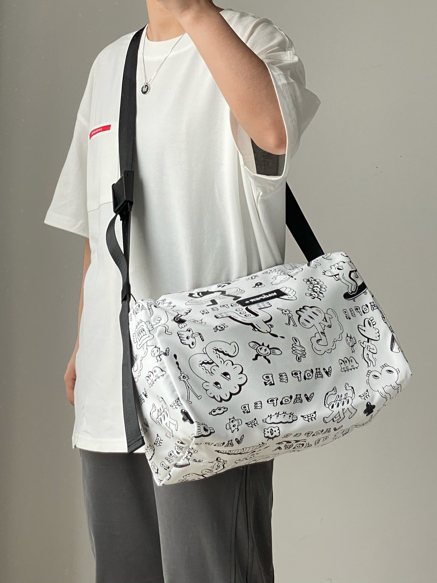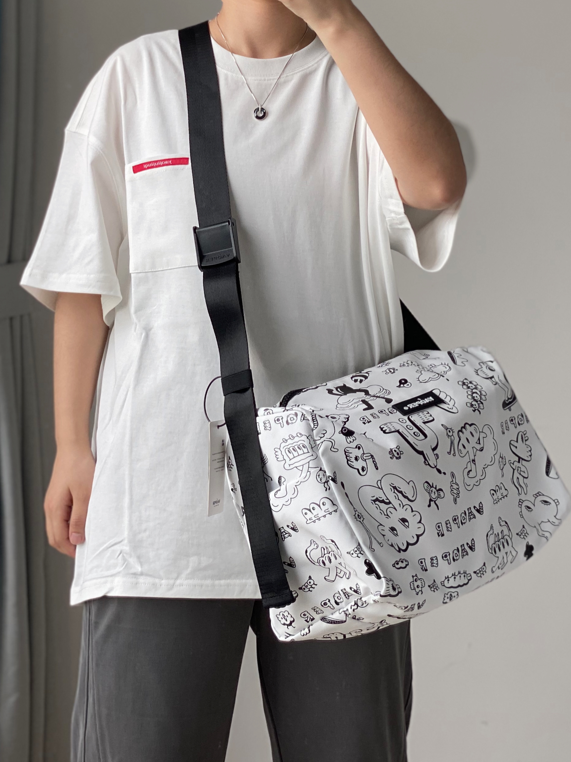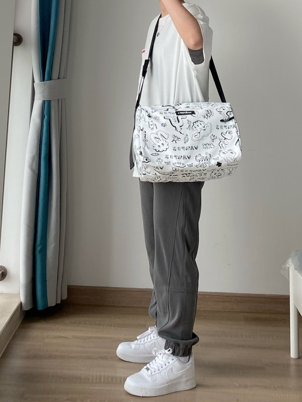 夏天我非常喜欢穿白色T恤 简单干净清爽 搭配深灰色的束脚卫裤 这个的裤长对小个子真的很友好 不用担心太长在裤脚处堆起 搭配的衣服同色系的白色漫画帆布包包 穿白t的时候项链可以不选择银色系(两个颜色比较靠近不显色)我今天戴的是蓝色系的项链 👟搭配的纯白空军一号 👖白告studio